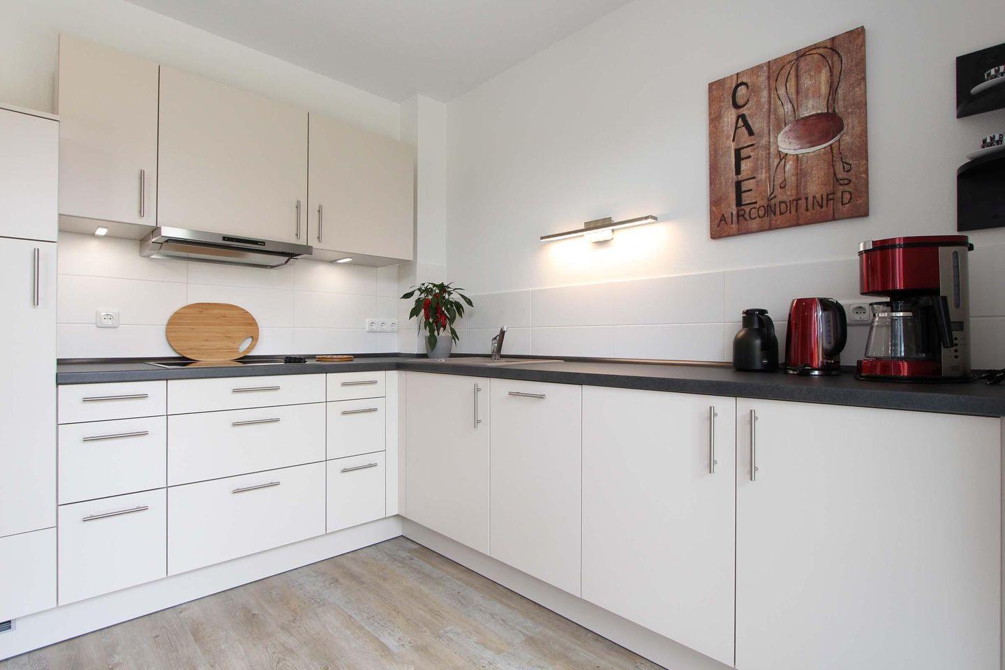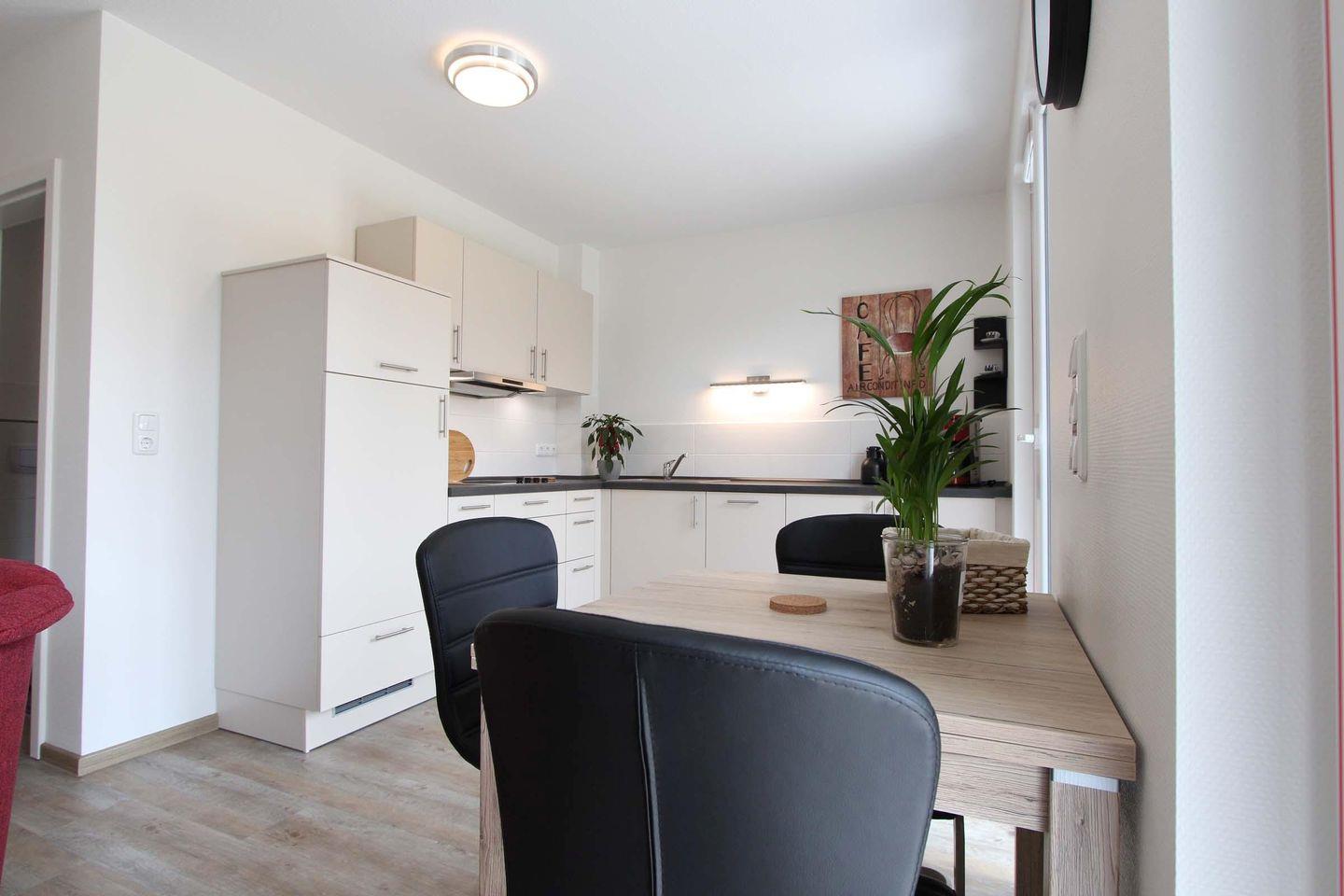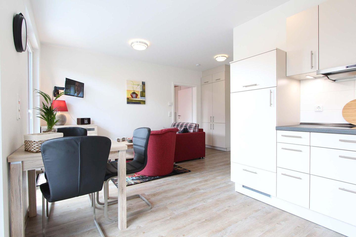 Der moderne Wohnbereich besticht mit Gemütlichkeit und Behaglichkeit. Direkt integriert ist die offene Küchenzeile mit Geschirrspüler, Multifunktionsmikrowelle und Gefriereinheit im Kühlschrank und dem Essbereich direkt angrenzend.