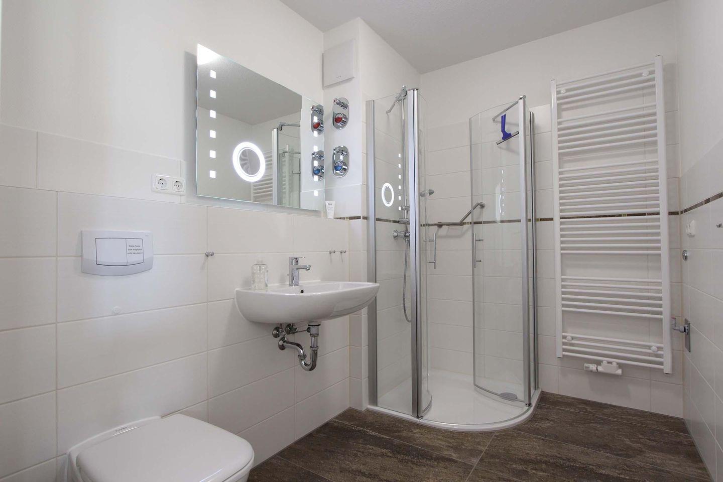 Im hellen, modernen Badezimmer mit Dusche befindet sich ebenfalls viel Ablagefläche für Pflegeprodukte und eine Handtuchheizung.