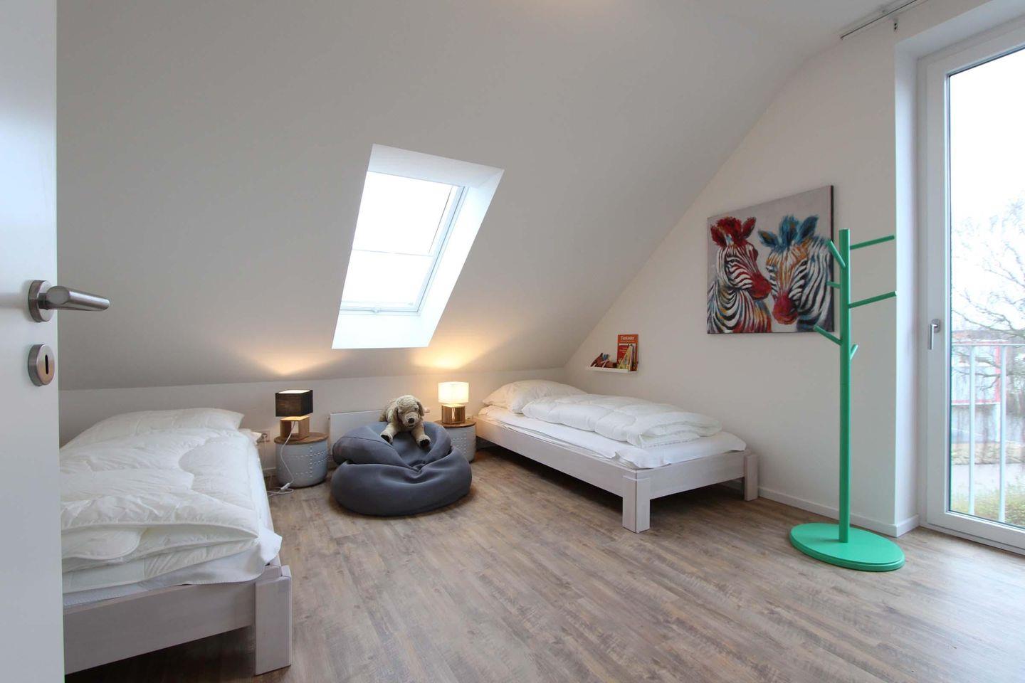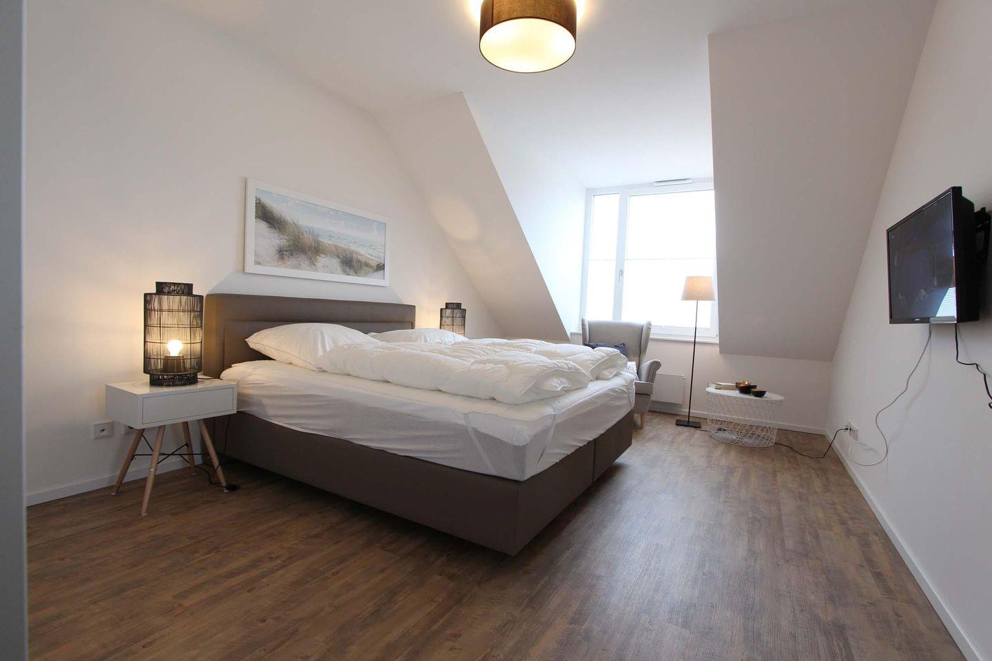 Die Wohnung verfügt über zwei separate Schlafzimmer: eines mit Doppel-Boxspringbett (Topper 1,80 x 2,00 m) sowie eines mit zwei Einzelbetten (je 0,90 x 2,00 m). Für kleine Gäste stehen ein Kinderreisebett und ein Hochstuhl bereit. Das moderne Badezimmer bietet eine ebenerdige Dusche, Badewanne und Tageslichtfenster.