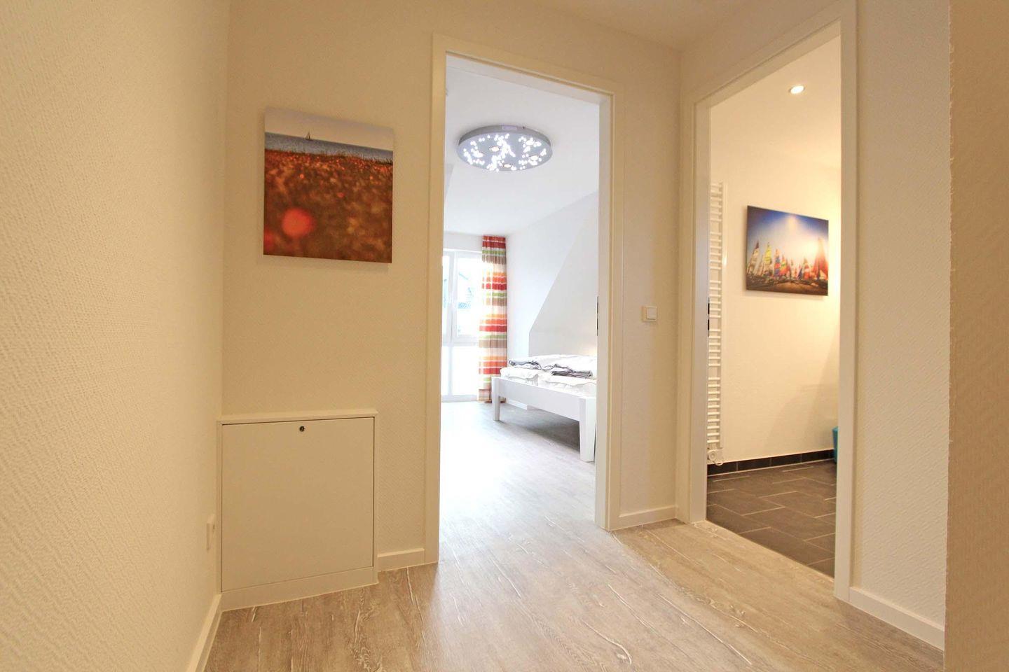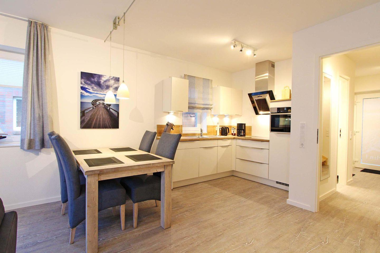 Dieses großzügige und stilvolle Reihenendhaus erstreckt sich mit ca. 75 qm auf zwei Ebenen. Ein sehr schicker, maritim, moderner Wohnbereich mit einer sehr hochwertigen Einrichtung lädt zum entspannen und wohlfühlen ein. Mit Sofaecke, Essbereich und offener Küchenzeile ist hier alles bestens vereint. Die Küche ist mit einem Multifunktionsofen (integrierte Mikrowelle und Grillfunktion) und einer Geschirrspülmaschine ausgestattet. Ansonsten ist im Erdgeschoss noch ein Gäste-WC und ein Hauswirtschaftsraum mit Waschmaschine und Trockner. Im Obergeschoss befinden sich dann 2 separate Schlafzimmer und ein Badezimmer. Das erste Schlafzimmer ist mit einem Doppelbett (2 Matratzen á 0,90x2,00m), einem geräumigen Kleiderschrank und einem Fernseher eingerichtet, wobei das zweite Schlafzimmer dann mit zwei Einzelbetten (0,90x2,00m) eingerichtet ist. Generell ist alles mit sehr viel liebe zum Detail eingerichtet und dekoriert. Die dazugehörige Terrasse hat eine schöne und sonnige Süd-West-Lage und lädt ebenfalls zum verweilen und entspannen ein. Das Haus "Merlin" liegt nur 8 Gehminuten vom Strand entfernt und auch dem Urlaub mit dem Haustier steht generell nichts im Wege, denn nach Rücksprache und gegen Aufpreis sind Haustiere gestattet. Sollte das Reisegepäck so gering wie möglich ausfallen, dann ist ein Wäschepaket für den Aufenthalt in Kellenhusen gegen Gebühr einfach buchbar.