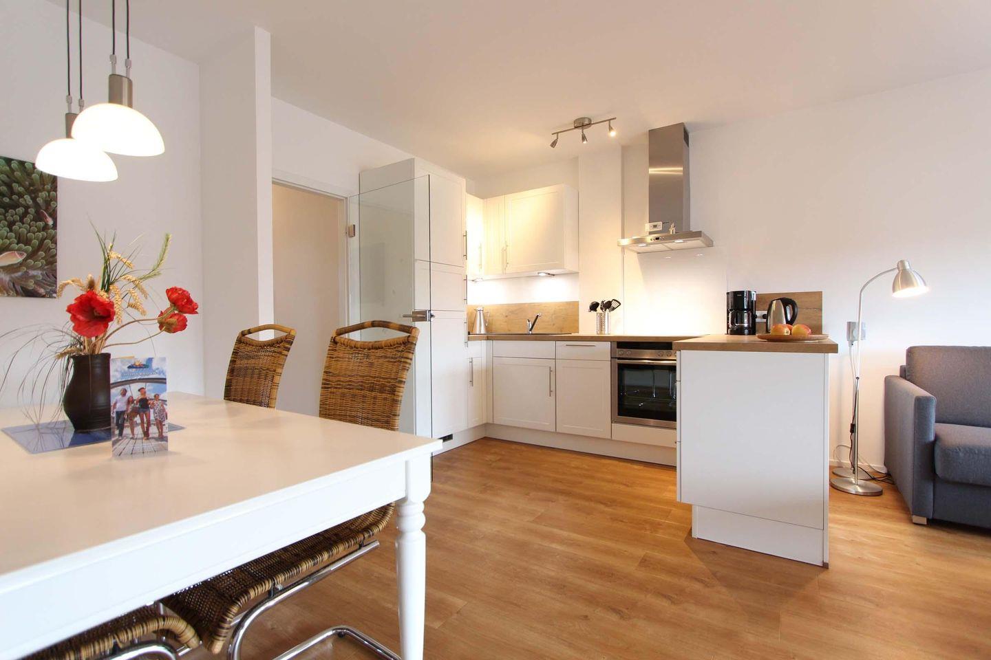 Diese geschmackvoll eingerichtete 2-Zimmer-Wohnung (Nichtraucher) befindet sich in der 1. Etage und bietet auf etwa 50 qm Wohnfläche Platz für bis zu drei Personen. Die gesamte Wohnung ist erst im Winter 2016/2017 aufwendig renoviert und modernisiert worden. Herzstück ist das großzügige Wohn-/Esszimmer, das durch große Fenster schön hell wirkt. Hier kann man gemeinsam essen oder es sich auf dem großen Ecksofa gemütlich machen. Die Sitzecke im Wohnzimmer bietet durch die Schlaffunktion (1,40x2,00m) eine Schlafmöglichkeit für eine dritte Person. Vom Wohn-/Esszimmer hat man Zugang zu einem großzügigen, überdachten Balkon mit Ost-Lage, der bei schönem Wetter zum Essen im Freien einlädt. Das Schlafzimmer, sowie der Wohn-/Essbereich sind durch Verdunkelungsplissees als Schlafräume voll nutzbar. Eine hochwertige Küche mit Backofen, Geschirrspüler, Herd mit 4-Platten-Cerankochfeld, Mikrowelle, Toaster und Kaffeemaschine ist im Wohn/Essbereich integriert. Ein Schlafzimmer mit Ehebett (1,40x2,00m) und einem geräumigen Schiebetürenschrank, sowie ein neu gestaltetes, modernes Duschbad, mit bodentiefer, geräumiger Dusche und WC runden die Ausstattung der Wohnung