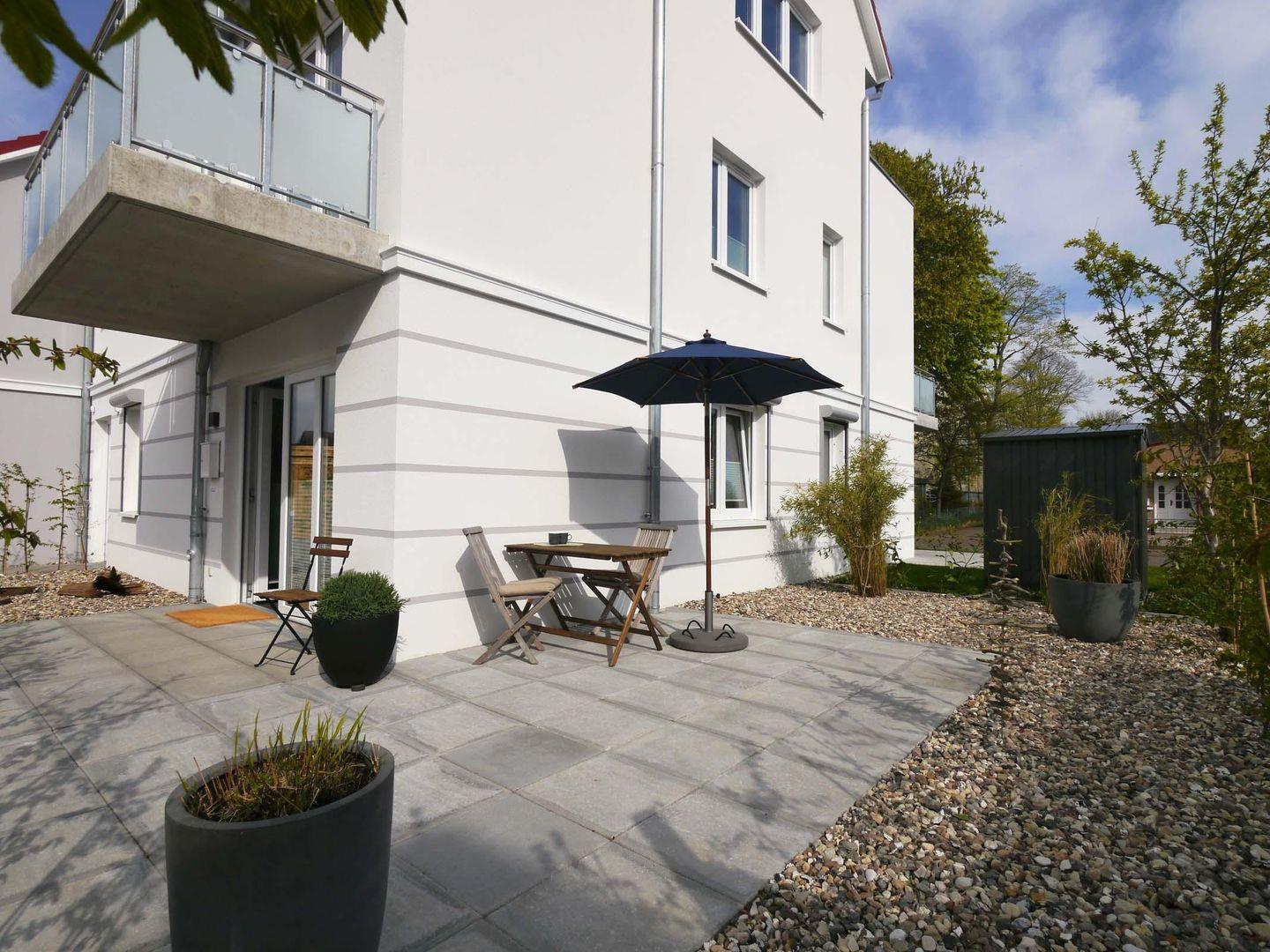 Zu dieser Wohnung gehört eine Terrasse mit einer sonnigen Süd-West-Lage. Über diese Terrasse erfolgt auch der Eingang der Wohnung.