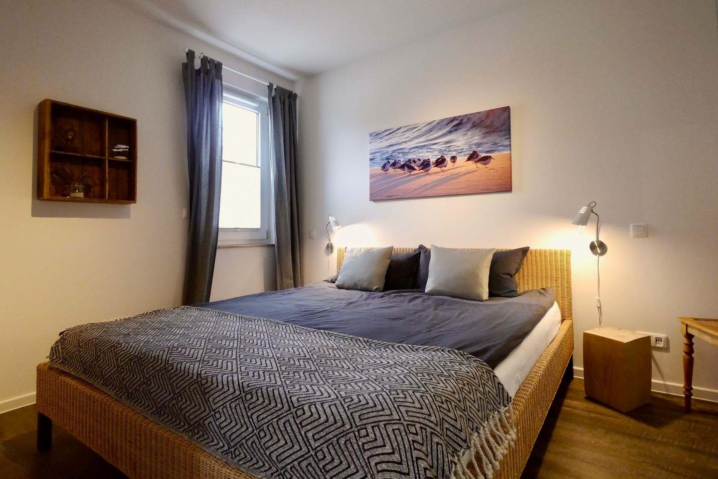 Der Wohnbereich ist mit der maritimen, rustikalen Dekoration besonders zum Entspannen geeignet. Ebenso bietet das separate Schlafzimmer einen Rückzugsort mit einem hochwertigen Doppelbett (2 Matratzen á 0,90x2,00m) und genügend Platz in dem großzügigen Kleiderschrank.