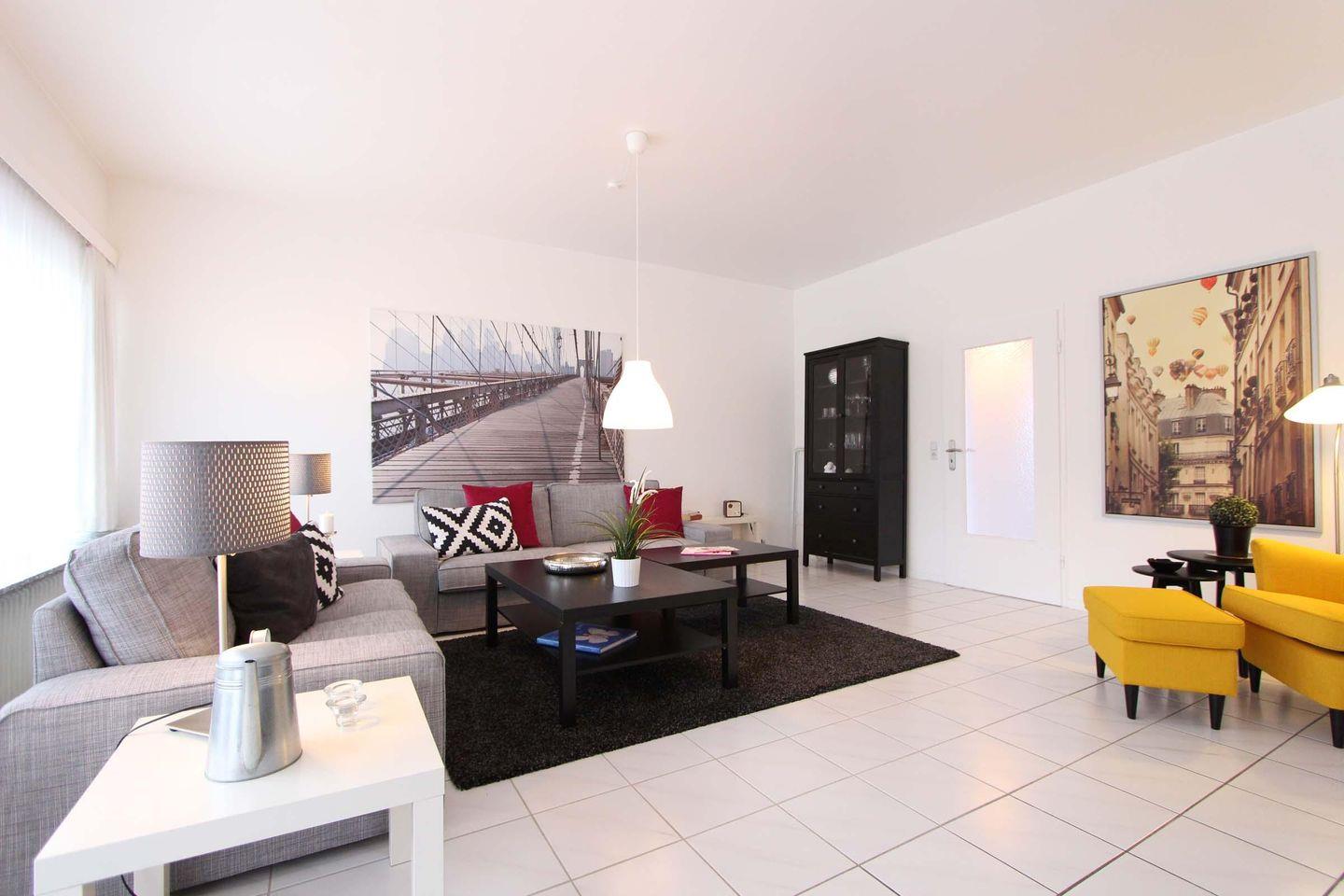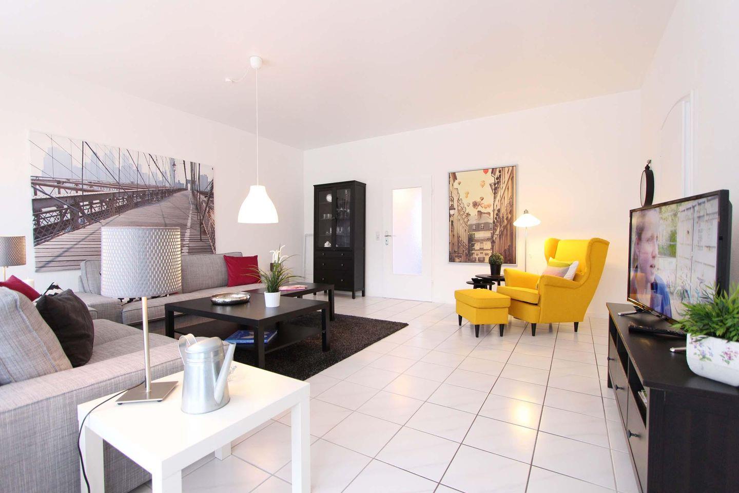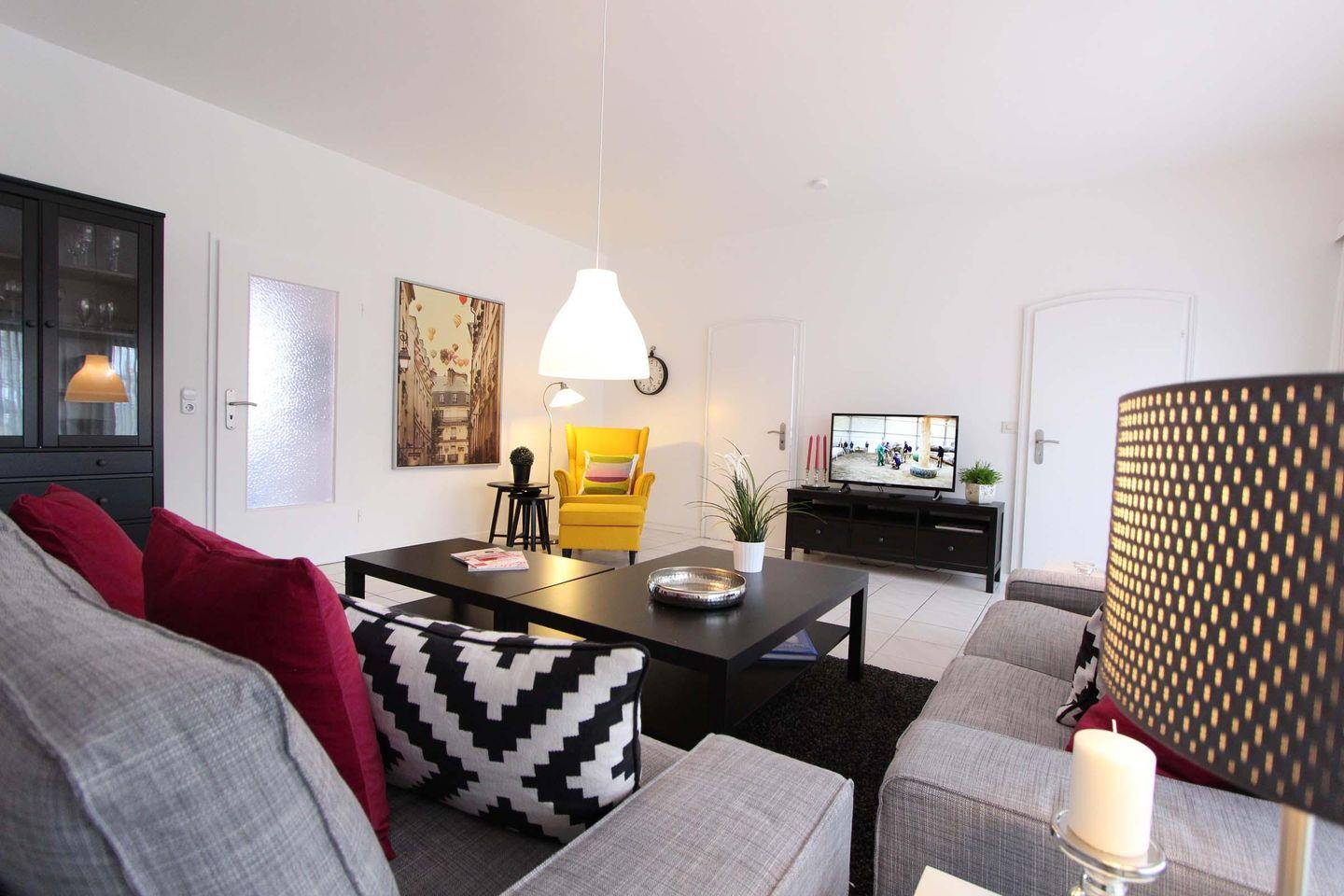 Sehr stilvolle und schicke Wohnung mit ca. 86 qm in bester Lage für max. 4 Personen. Das geschmackvolle Wohnzimmer ist sehr einladend und großzügig gehalten. Die angrenzende Küche mit Essbereich ist ebenfalls hochwertig ausgestattet und lädt zum Kochen ein. Mit Mikrowelle, Backofen, Gefrierfach im Kühlschrank und Geschirrspülmaschine hat man hier alles was man benötigt um die gemeinsamen Mahlzeiten vorzubereiten. Die zwei separaten Schlafzimmer haben jeweils einen Fernseher, eines ist mit Doppelbett (2 Matratzen á 0,90x2,00m) und eines ist mit zwei Einzelbetten (0,90x2,00m) ausgestattet. Für die ganz kleinen Gäste gibt es ein Kinder-Reisebett und einen Hochstuhl. Das Badezimmer ist mit Dusche und WC ausgestattet und zusätzlich verfügt die Wohnung noch über eine separate Toilette. Mit Süd-West-Lage ist die Terrasse sonnig und schön gelegen und bietet einen erholsamen Rückzugsort. Neben der tollen Wohnung und der Terrasse hat Kellenhusen natürlich auch einen schönen Sandstrand zu bieten, dieser ist von dem Objekt nur wenige Meter entfernt und kann fußläufig innerhalb von einer Minute erreicht werden. Auch dem Urlaub mit dem Haustier steht generell nichts im Wege, denn nach Rücksprache und gegen Aufpreis sind Haustiere gestattet. Bei diesem Objekt steht gegen Gebühr auch eine Waschmaschine und ein Trockner zur Verfügung, außerdem stellt der Eigentümer Ihnen kostenfrei eine Erstausstattung an Bettwäsche und Handtüchern zur Verfügung.