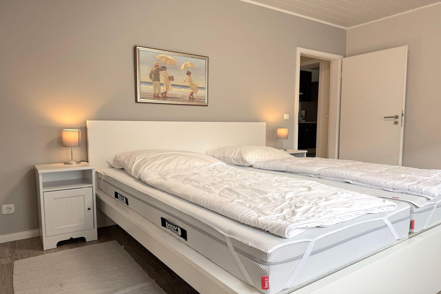 Für erholsame Nächte sorgen die beiden separaten Schlafzimmer, die jeweils mit einem komfortablen Doppelbett (zwei Matratzen à 90x200 cm) und großzügigen Kleiderschränken ausgestattet sind. Auf Wunsch stellen wir für die kleinsten Gäste gern ein Kinderreisebett und einen Hochstuhl bereit.