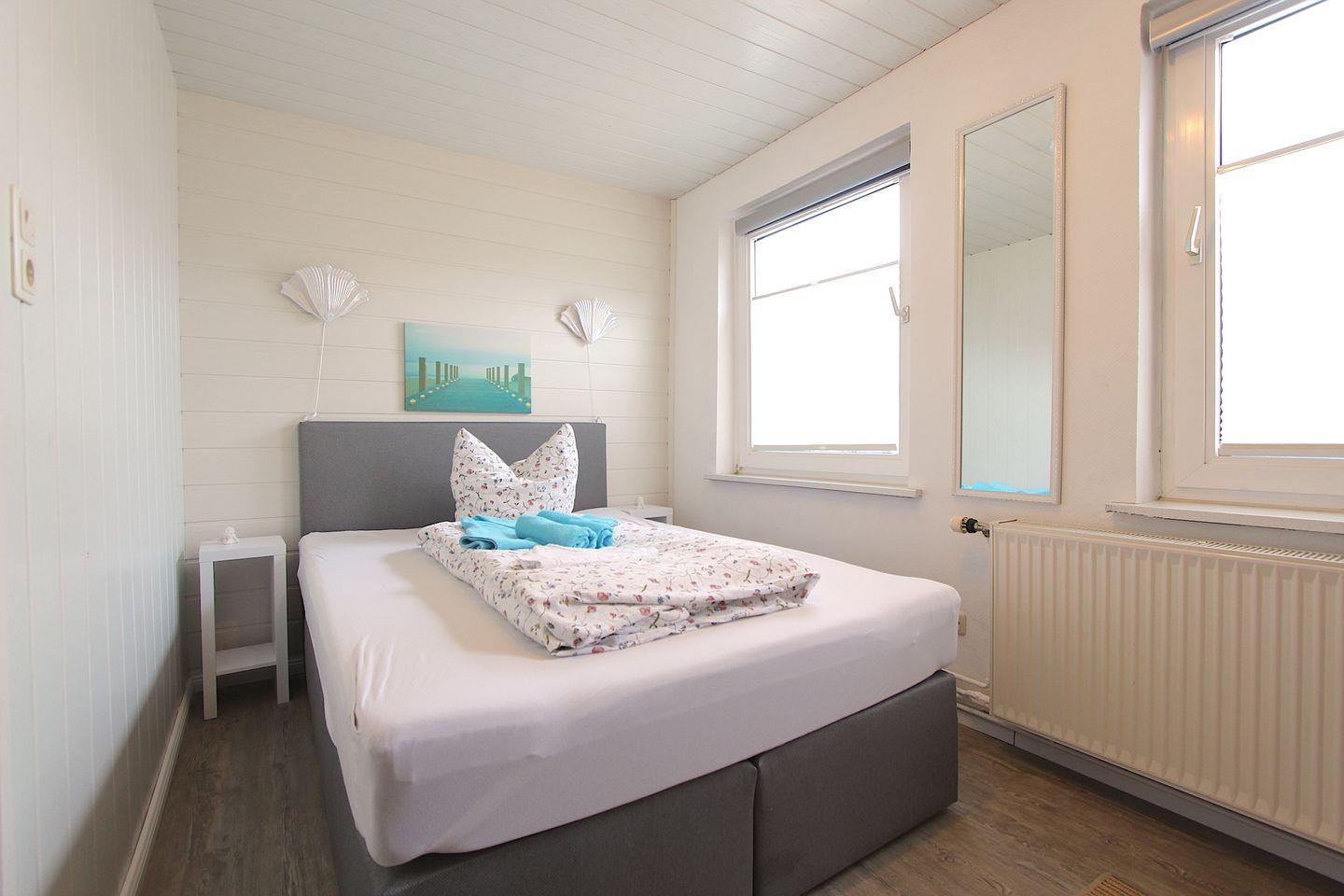 Das separate Schlafzimmer überzeugt mit einem bequemen französischen Boxspringbett (1,40 x 2,00 m) und einem geräumigen Kleiderschrank. Für die kleinsten Gäste stehen auf Anfrage ein Kinderreisebett und ein Hochstuhl bereit.