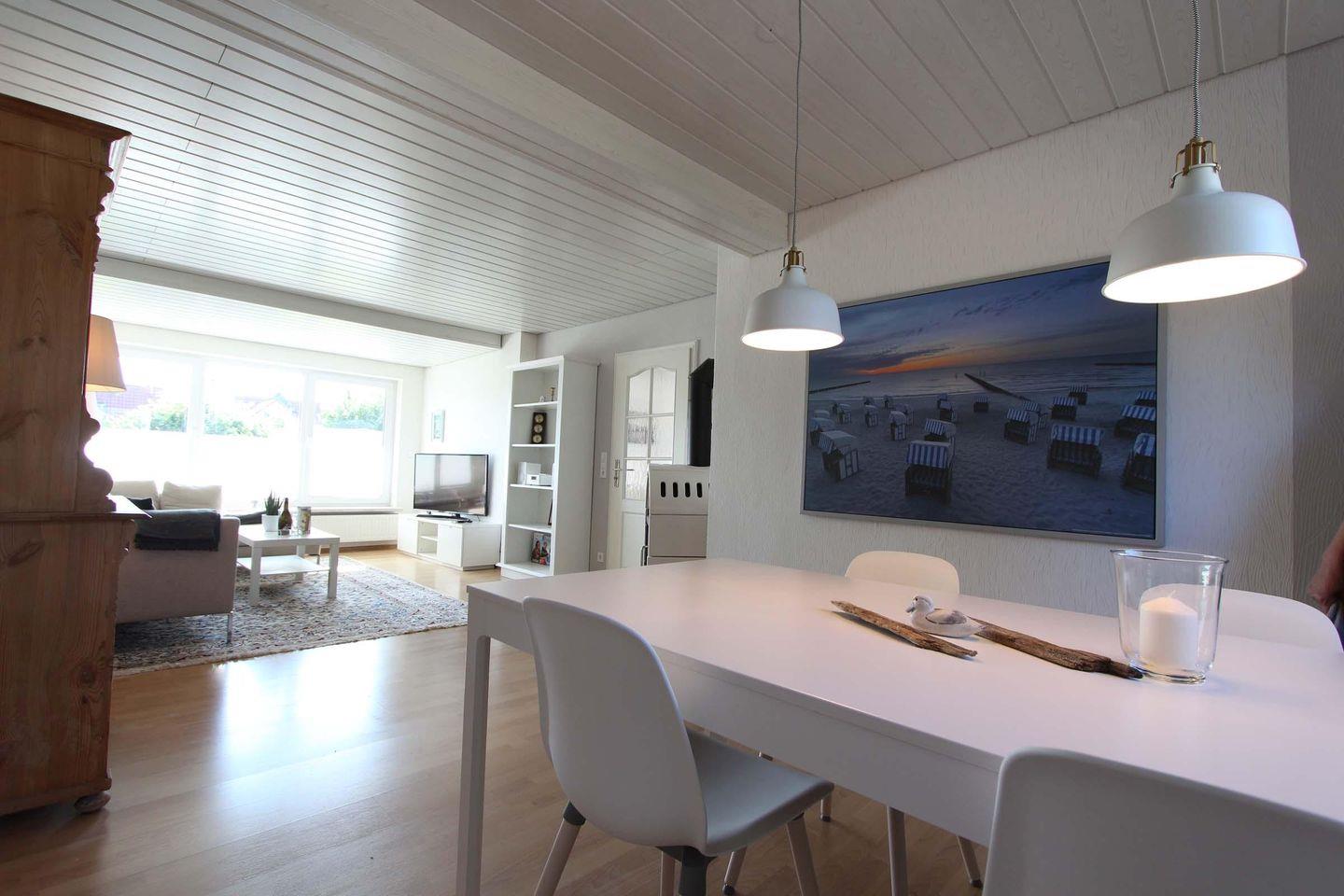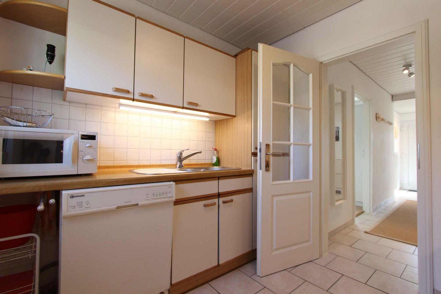Der separate Essbereich grenzt direkt an die geschlossene, vollausgestattete Küche – mit Ceran-Herd, Backofen, Mikrowelle, Kühlschrank, extra Gefrierschrank, Geschirrspüler, Toaster, Wasserkocher sowie Kaffeemaschine. Alles Nötige für die Selbstverpflegung und entspannte gemeinsame Mahlzeiten ist vorhanden, bis hin zu Küchenutensilien, Geschirr und Besteck. Ein Esstisch bietet Platz für gesellige Stunden am Morgen oder Abend.