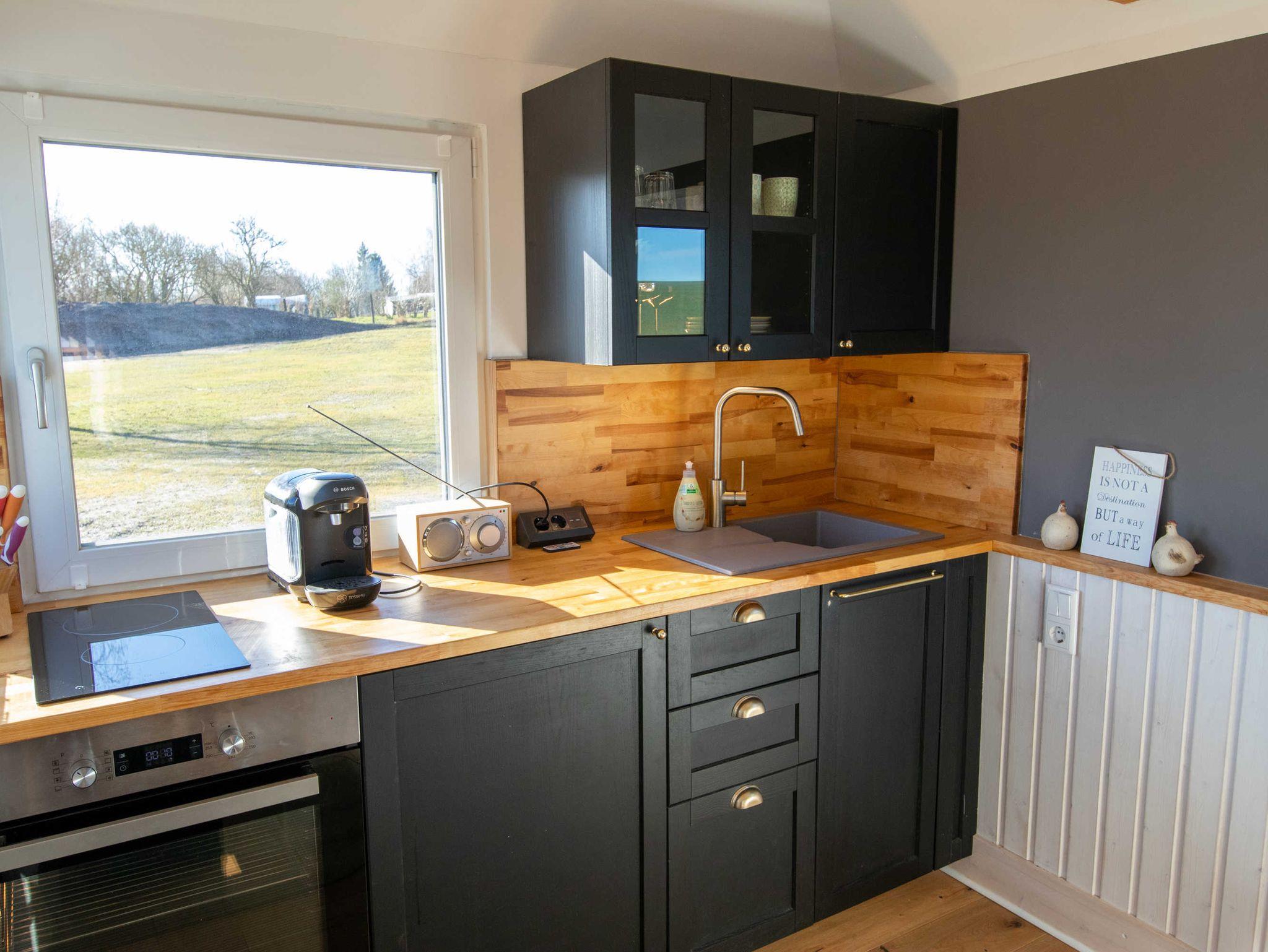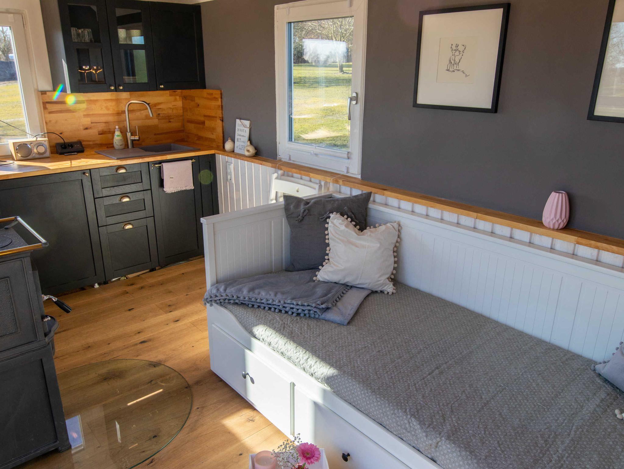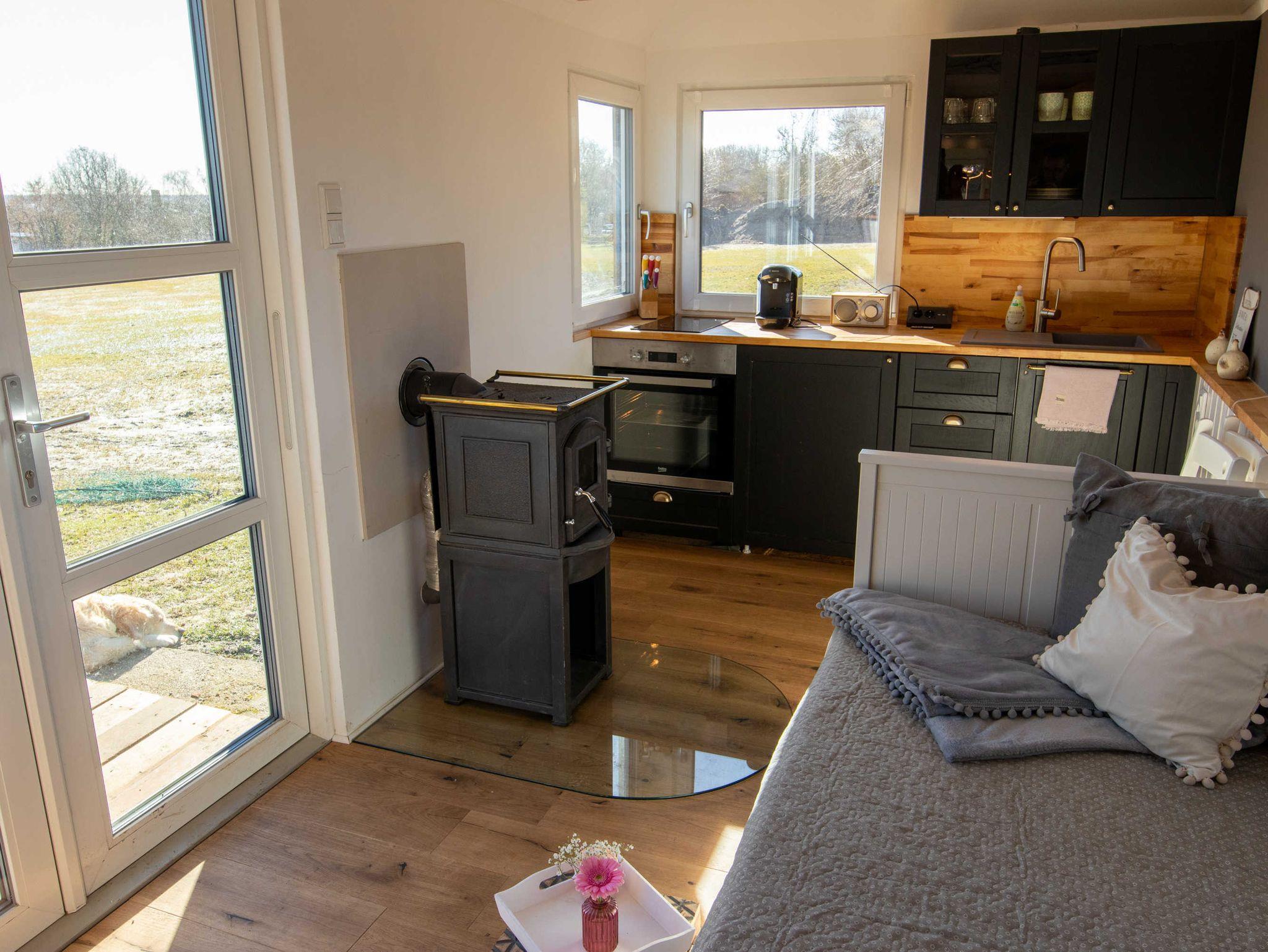 Charmantes Tiny House Hygge in Kenz-Küstrow mit Holzofen, Terrasse und Seeblick für erholsame Auszeiten.
