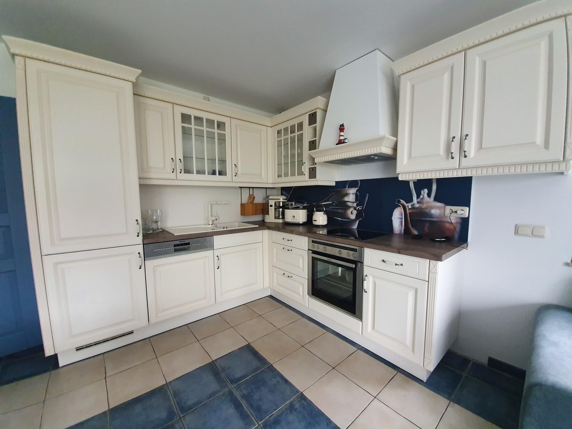 Koch/Essbereich 8 m², mit geschmackvoller Landhausküche, Geschirrspüler, Kühlschrank, Backofen, Kaffeemaschine, Toaster, Wasserkocher, Geschirr für 8 Personen