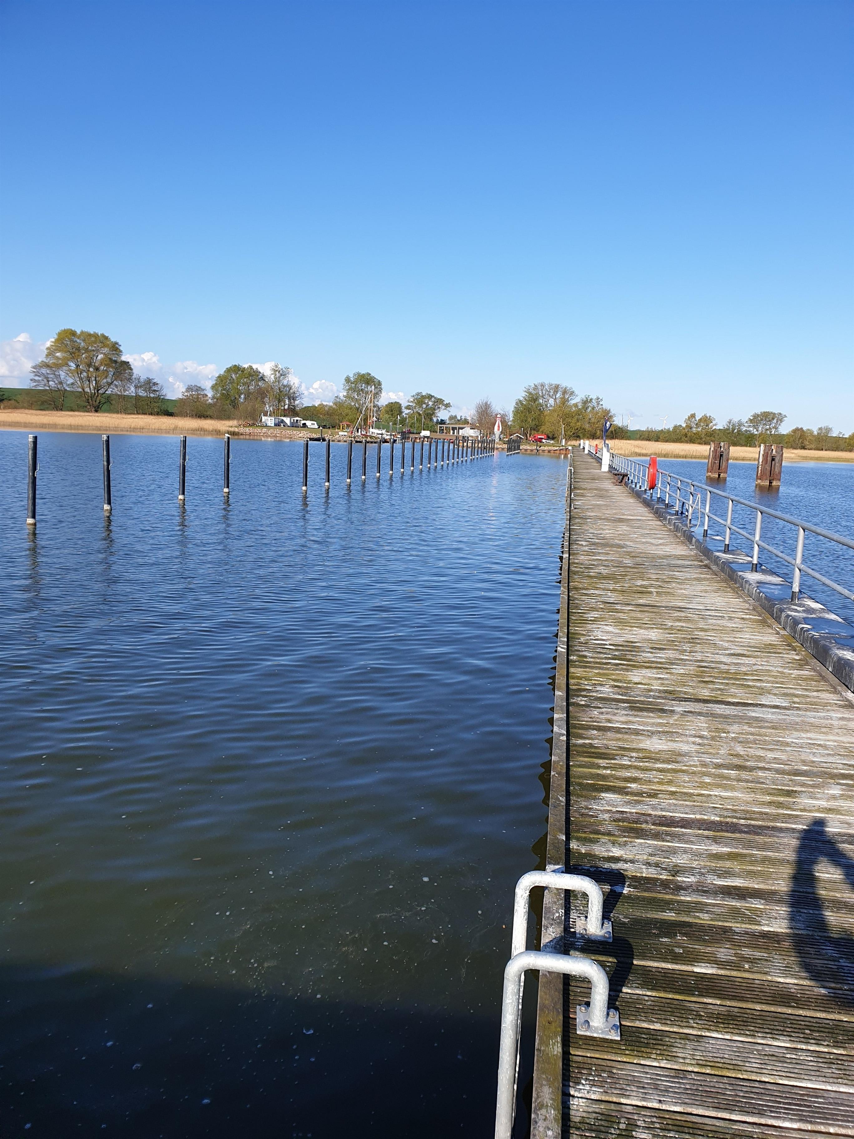 Vom Steg am Hafen gelangt man ins seichte Wasser (gute Surf/Kite-Bedingungen!).