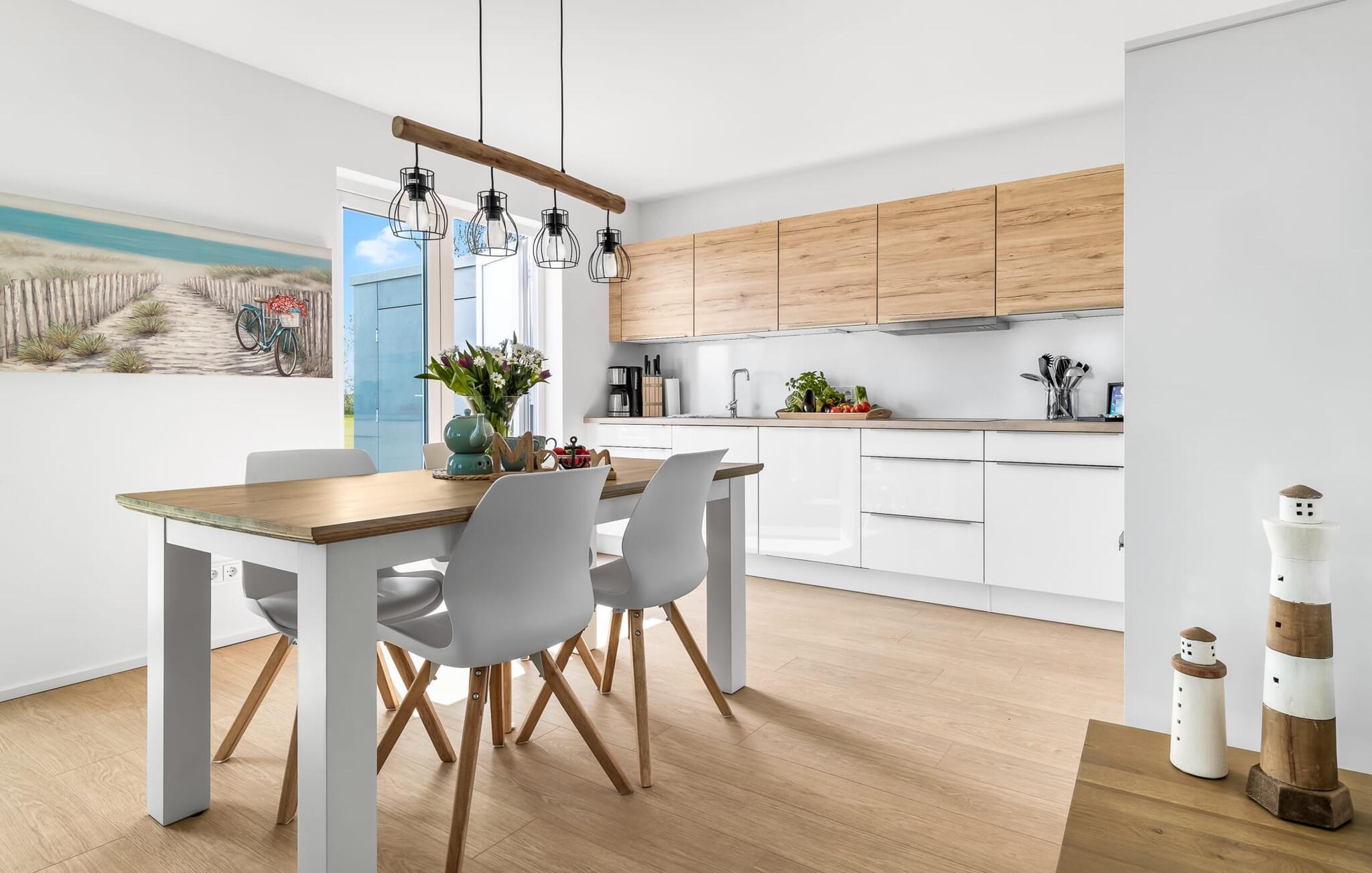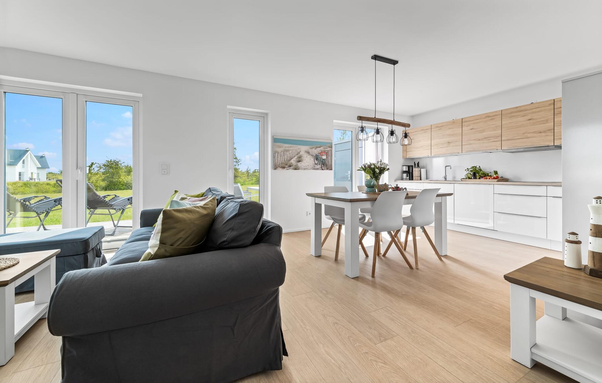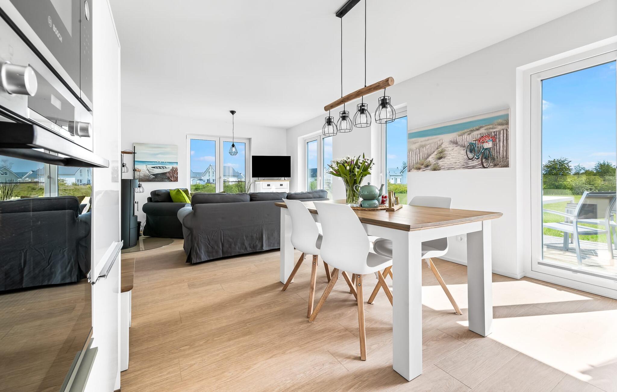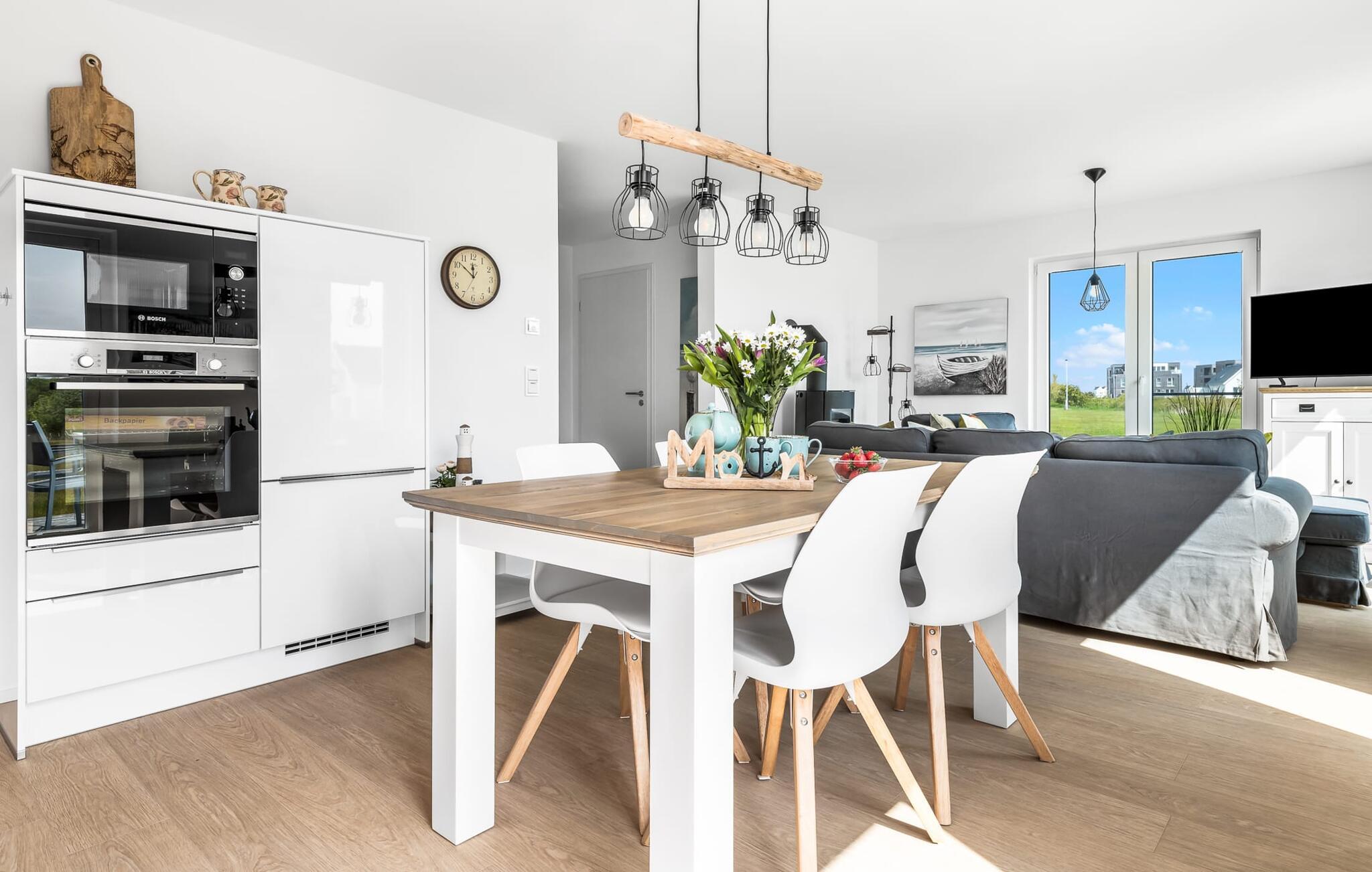 Mit seiner bodentiefen Fensterfront und der angrenzenden großen Terrasse ist der offene Wohn-/Essbereich das Herz der Wohnung. Hier hineinkommen und sich sofort Zuhause fühlen ist eins. Auf der Wohnlandschaft mit Kuschelfaktor zu entspannen, aus dem Fenster die Ruhe der Natur genießen oder fernsehen ist Entspannung und Erholung pur! Der Alltag entrückt immer mehr... Sollte das Wetter sich einmal von der nordischen Seite zeigen, sorgt der Kaminofen mit seinem prasselnden Feuer für weitere Behaglichkeit.