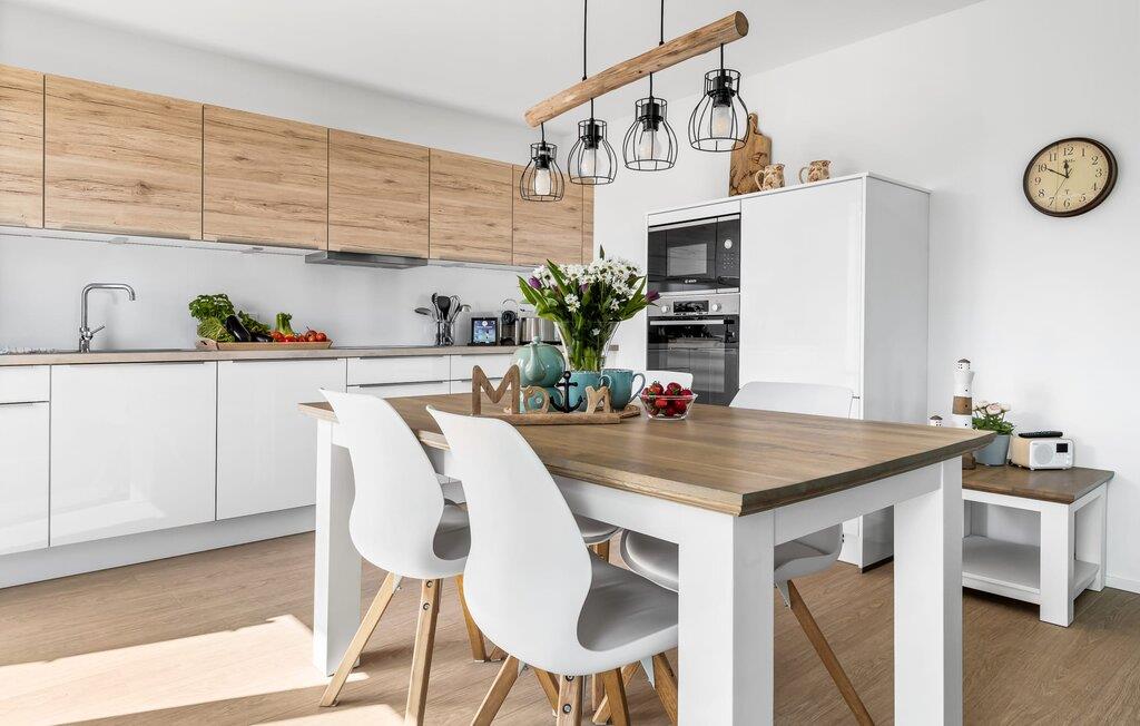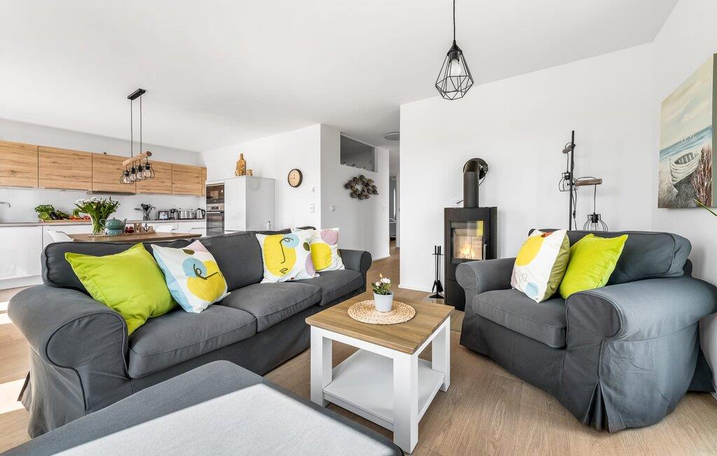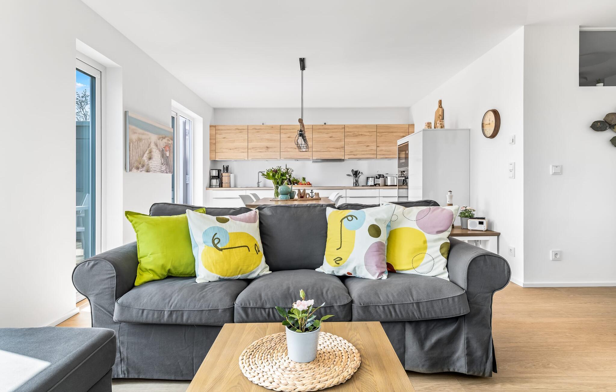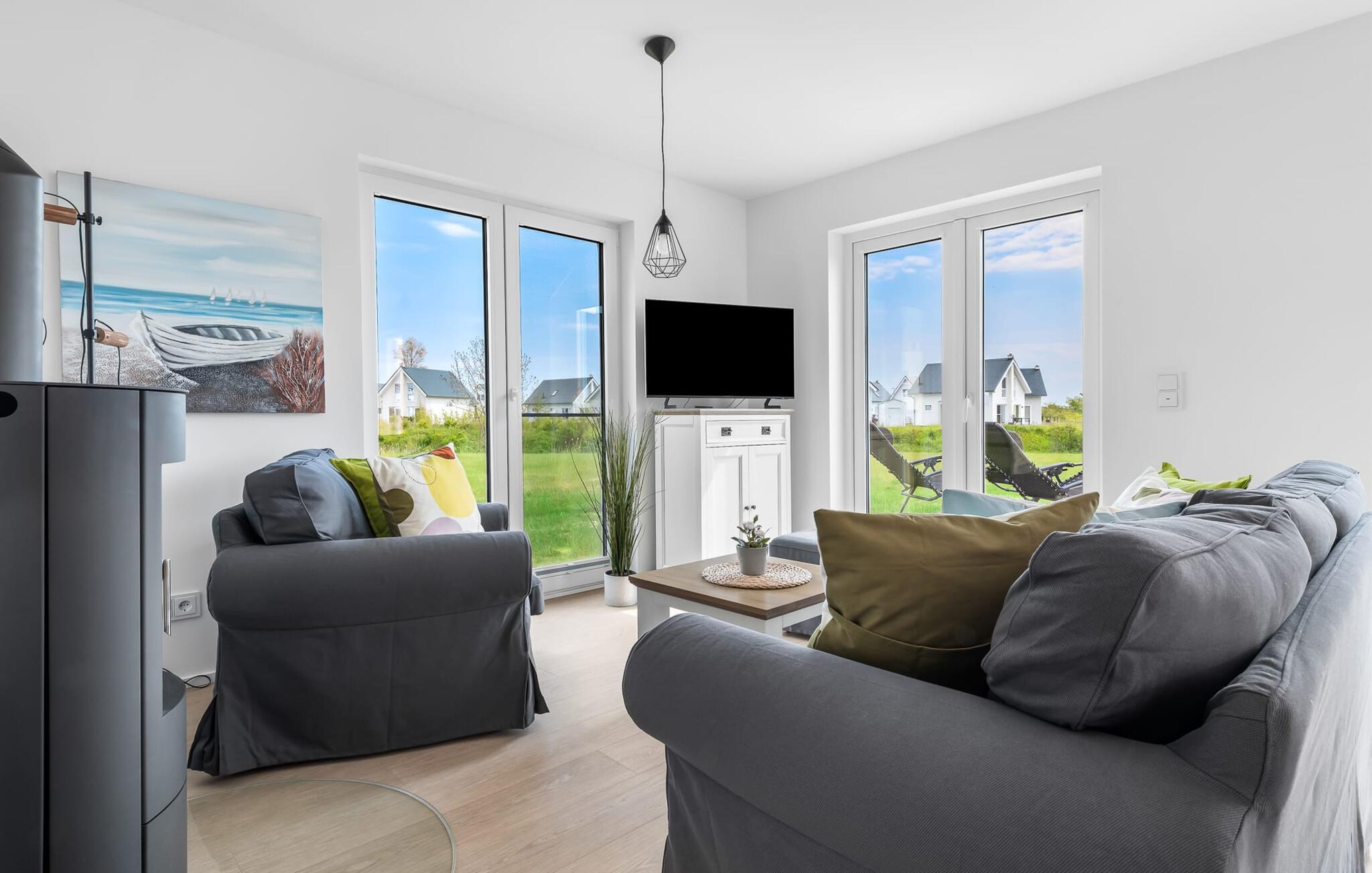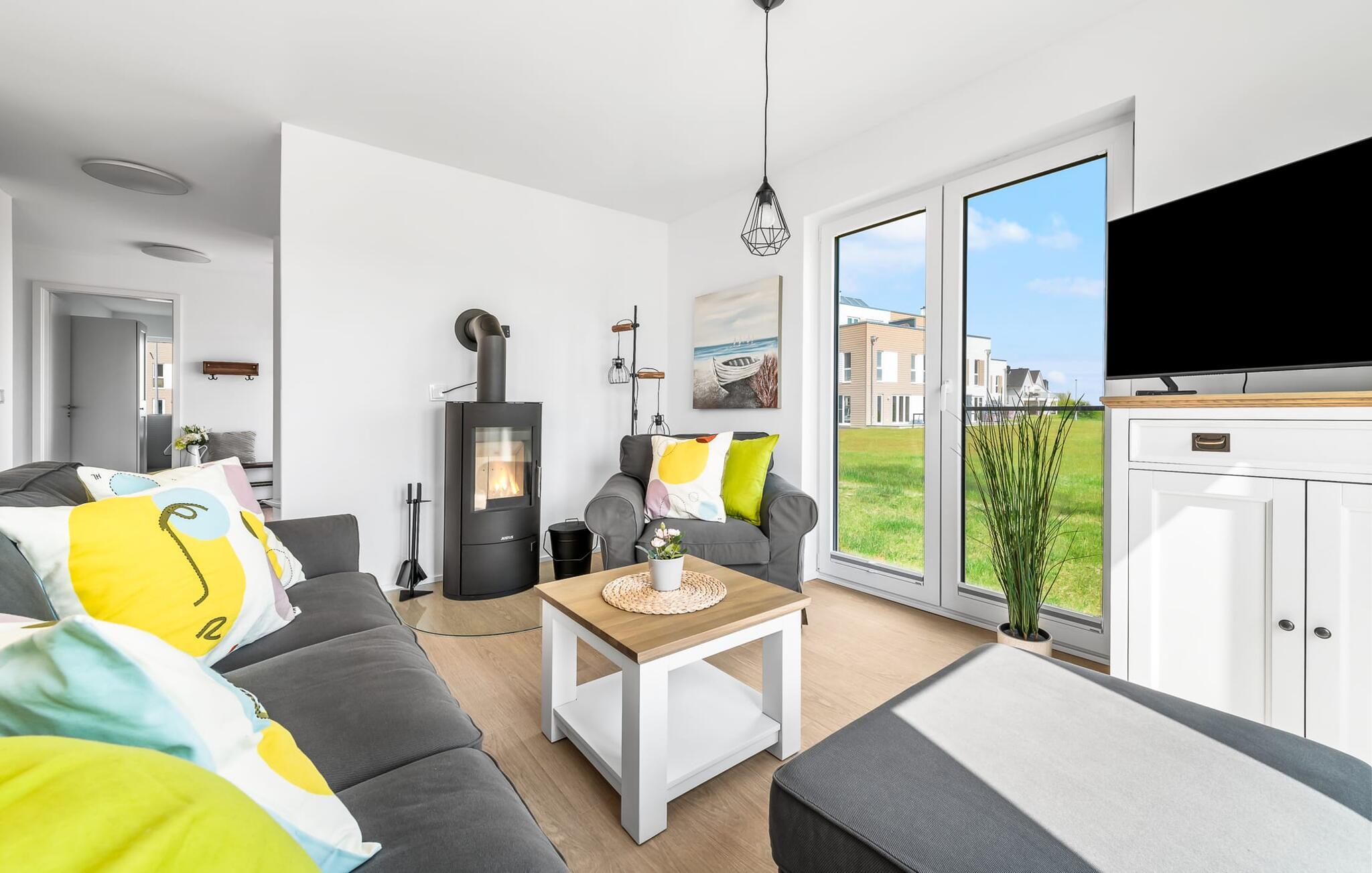 Mit seiner bodentiefen Fensterfront und der angrenzenden großen Terrasse ist der offene Wohn-/Essbereich das Herz der Wohnung. Hier hineinkommen und sich sofort Zuhause fühlen ist eins. Auf der Wohnlandschaft mit Kuschelfaktor zu entspannen, aus dem Fenster die Ruhe der Natur genießen oder fernsehen ist Entspannung und Erholung pur! Der Alltag entrückt immer mehr... Sollte das Wetter sich einmal von der nordischen Seite zeigen, sorgt der Kaminofen mit seinem prasselnden Feuer für weitere Behaglichkeit.