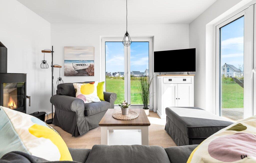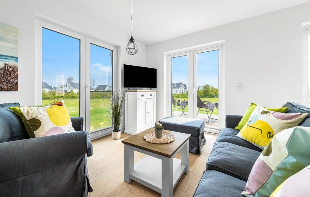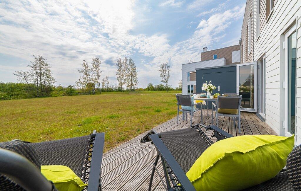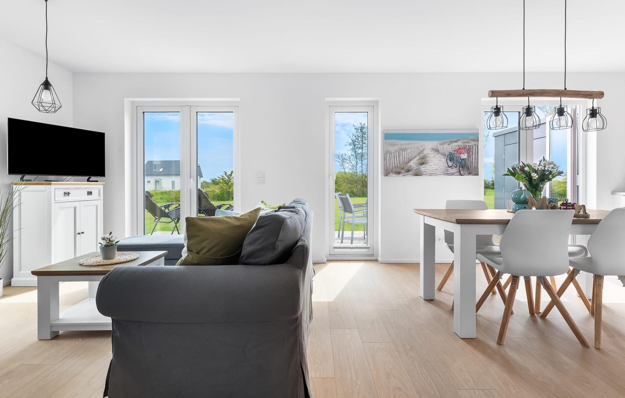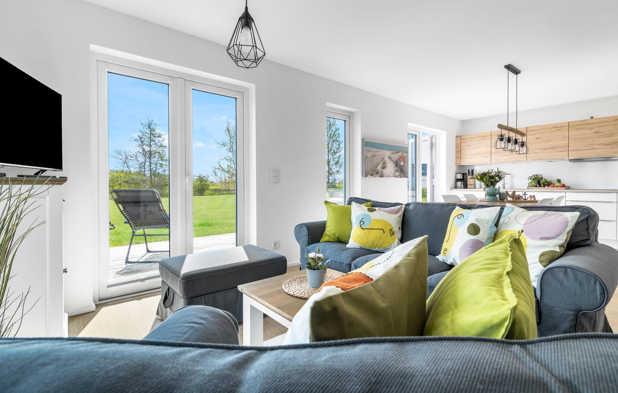 Moderne Design-Ferienlounge mit Terrasse und Blick auf Naturschutzgebiet am OstseeResort Olpenitz.