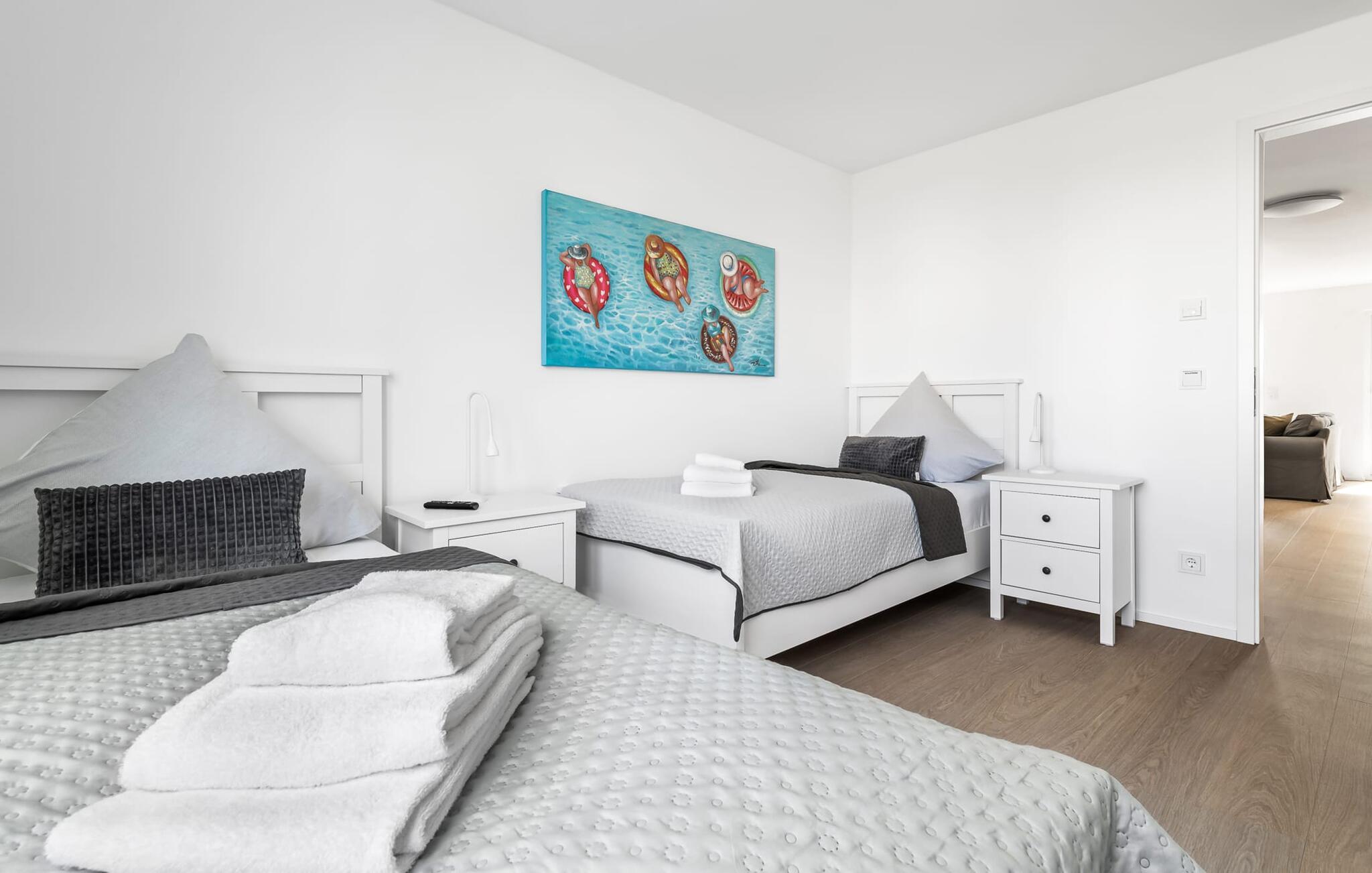 Für die nächtliche Erholung stehen zwei Schlafzimmer bereit. Das erste Schlafzimmer verwöhnt euch mit einem gemütlichen Dopppelbett, während das zweite Schlafzimmer mit zwei komfortablen Einzelbetten euch zum Träumen einlädt.