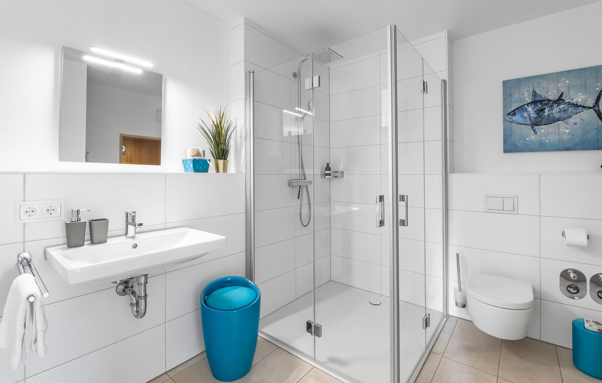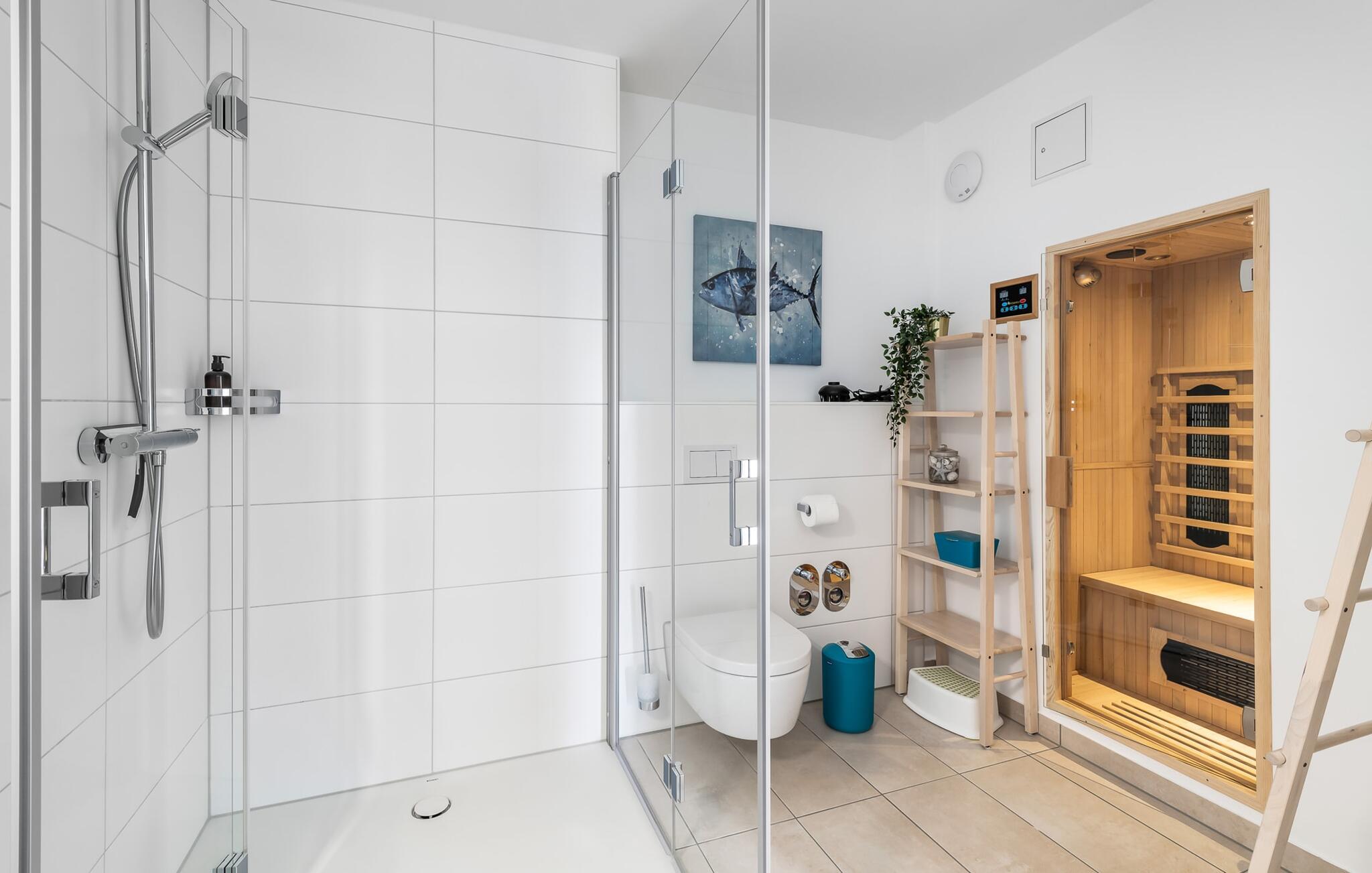 Das Duschbad mit bodengleicher Dusche und einer Infrarot-Sauna sorgt für unvergessliche Wellnessmomente von denen ihr noch lange zehren könnt.
