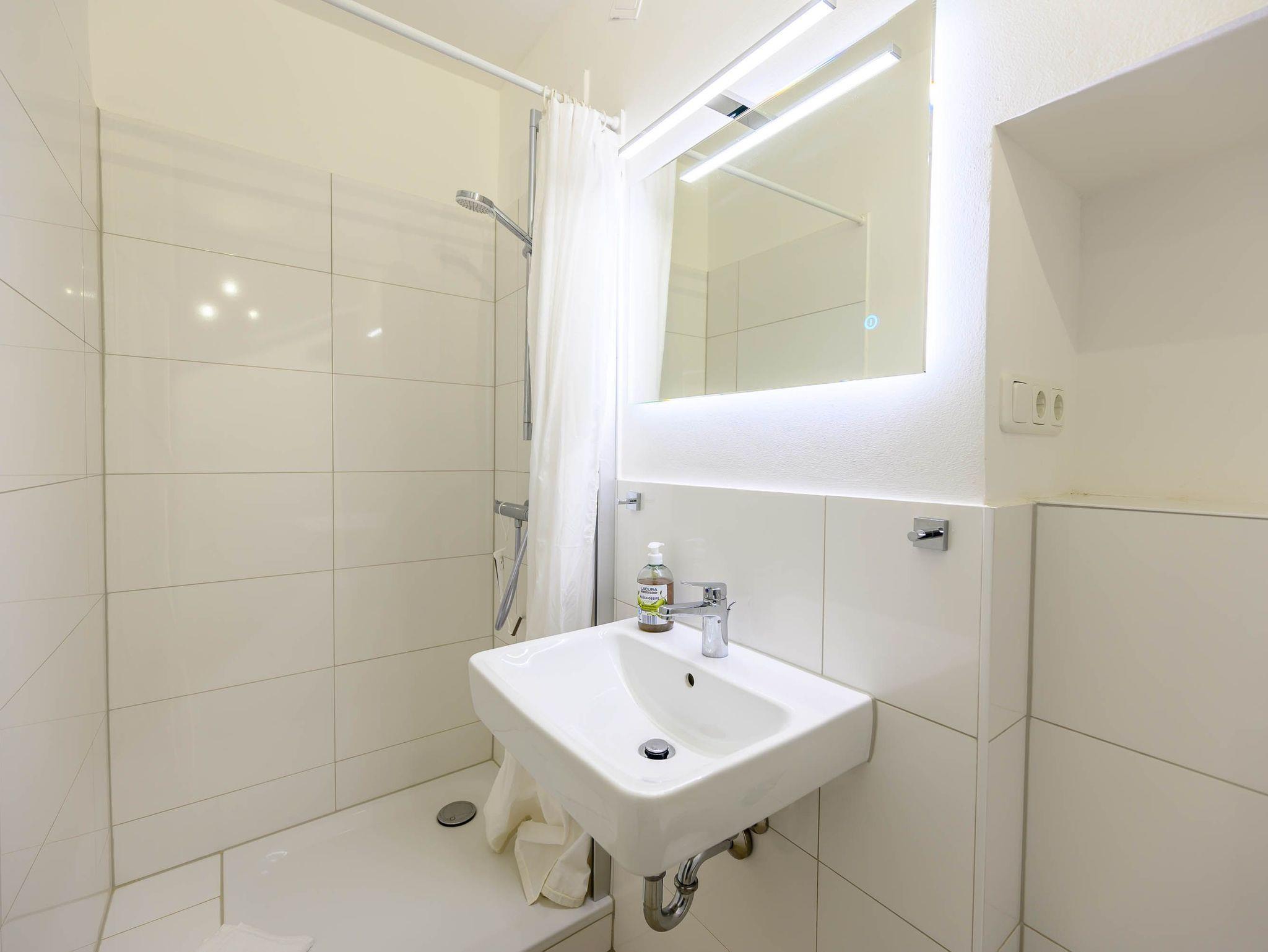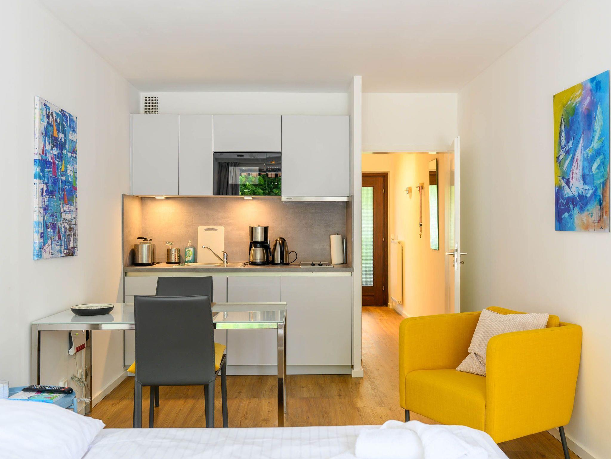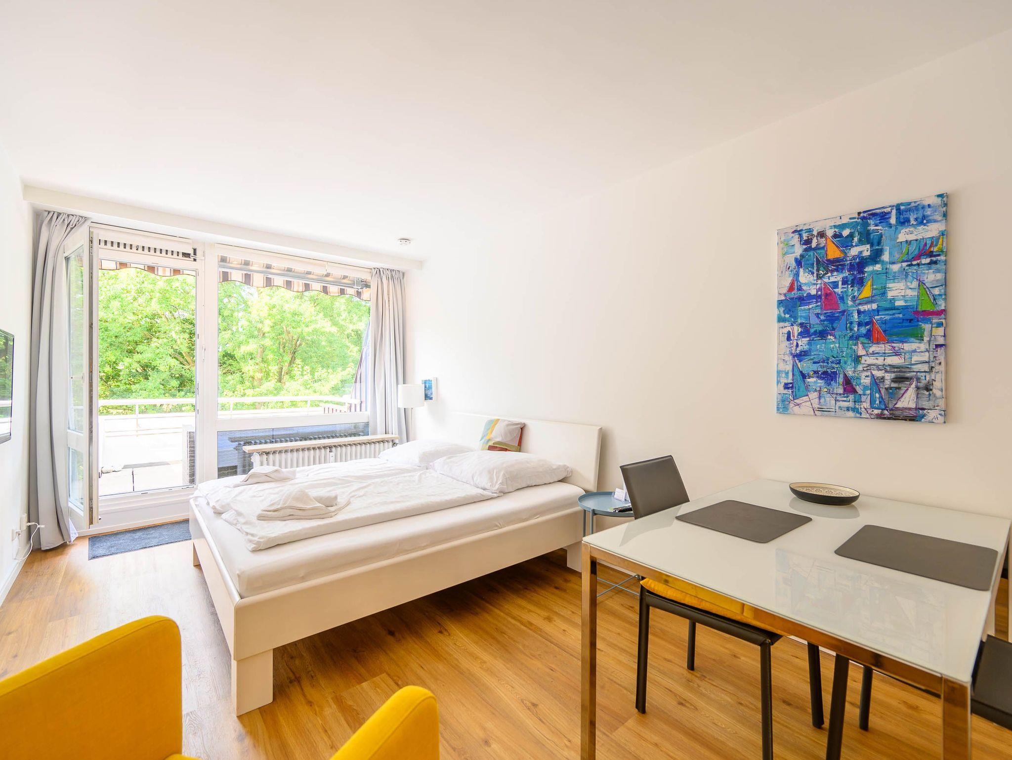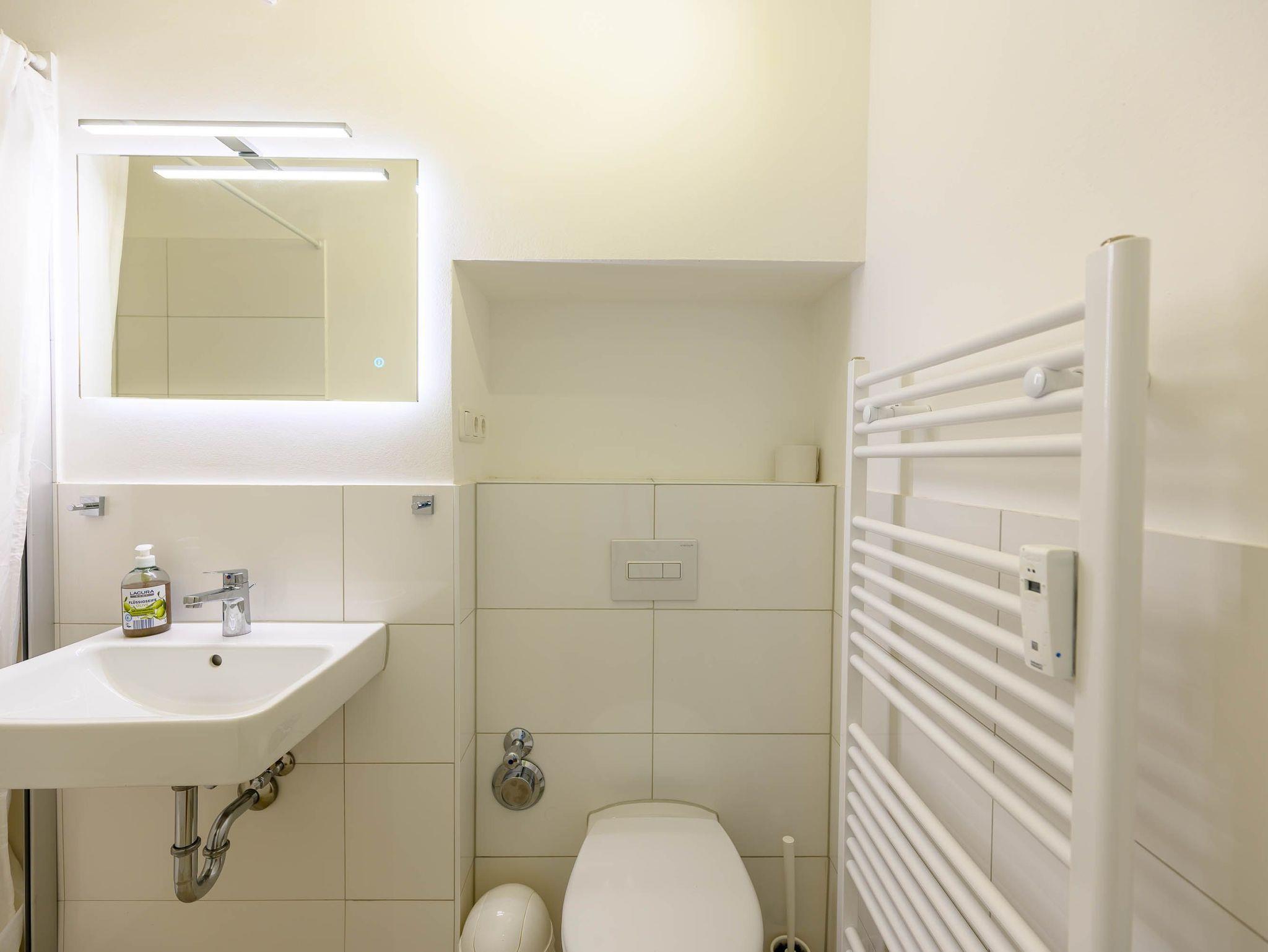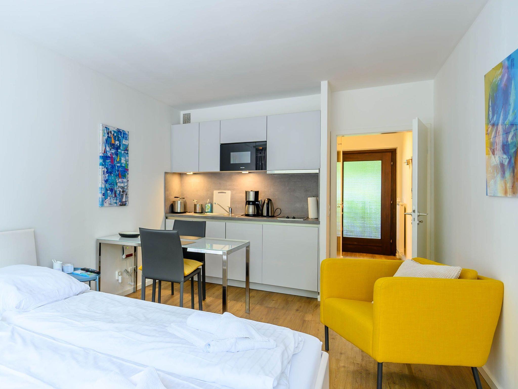 Die 1-Zimmer-Wohnung ist freundlich eingerichtet. Beim Betreten der Wohnung gelangen Sie zuerst in einen kleinen Flur mit Möglichkeiten Ihr Gepäck zu verstauen. Von hier aus erreichen Sie das voll ausgestattete Badezimmer, sowie den Wohn-, Ess-, und Schlafbereich. Das Apartment lässt sich bei Bedarf mit Gardinen abdunkeln. Zum Übernachten steht Ihnen eine Doppelbett (Liegefläche von 180 x 200 cm) zur Verfügung.
