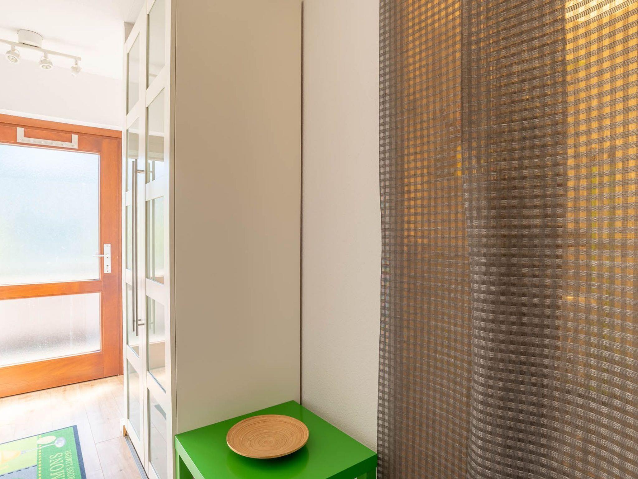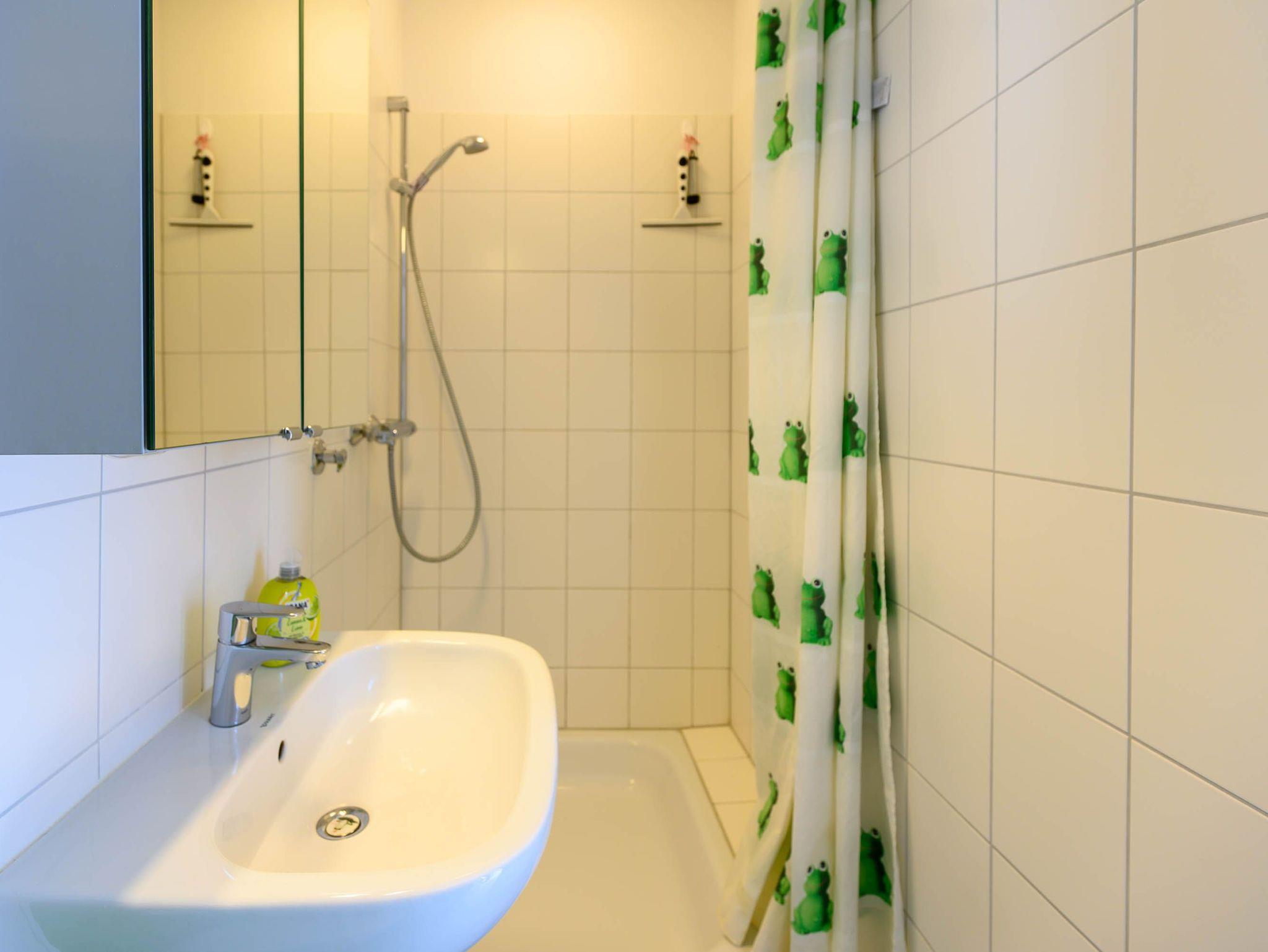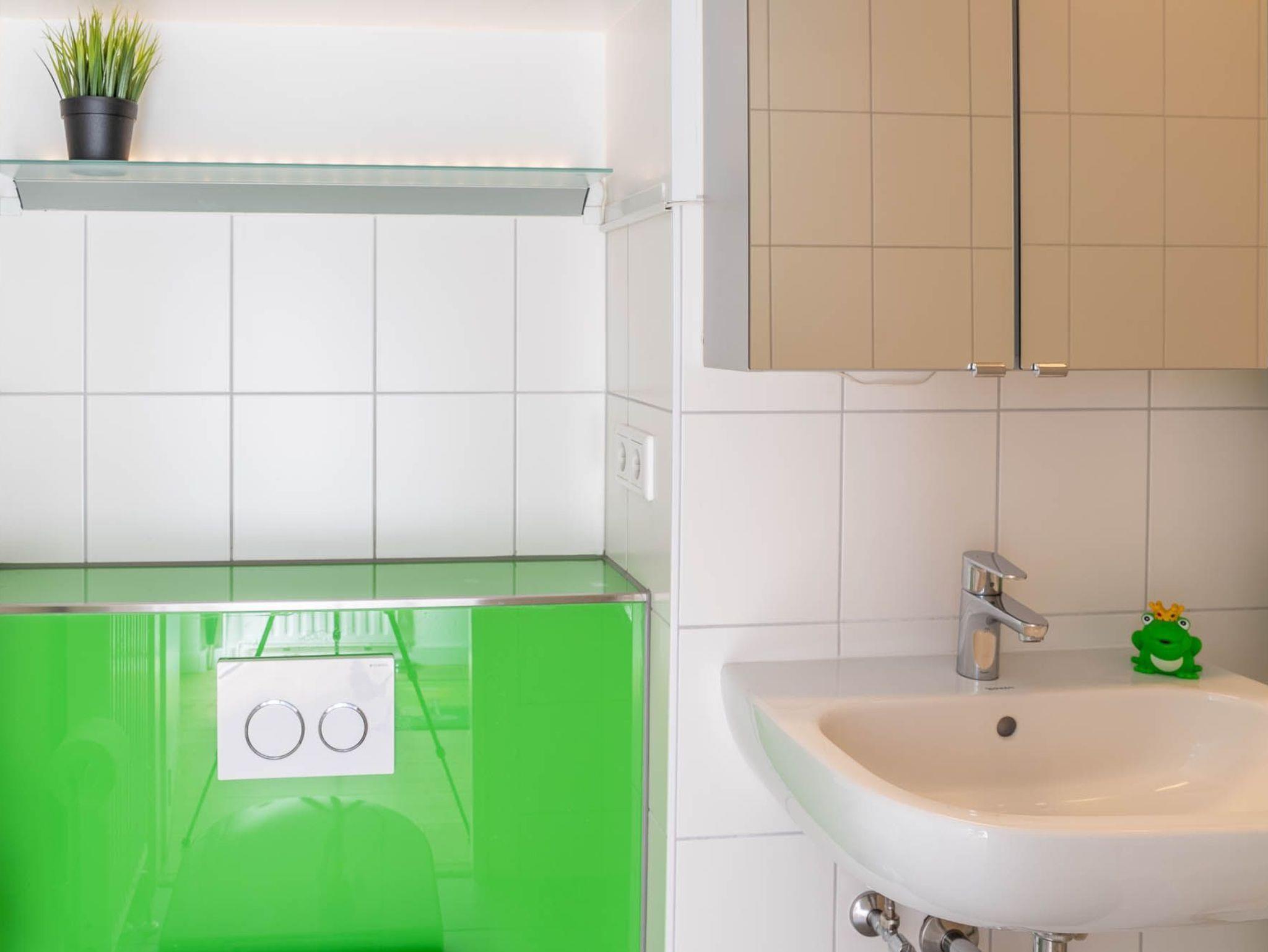 Das Duschbad ist hell, freundlich und durch die Farbgestaltung auf den Froschkönig abgestimmt. Im Flur befindet sich ein Schrank, der während Ihres Aufenthalts ausreichend Stauraum bietet.