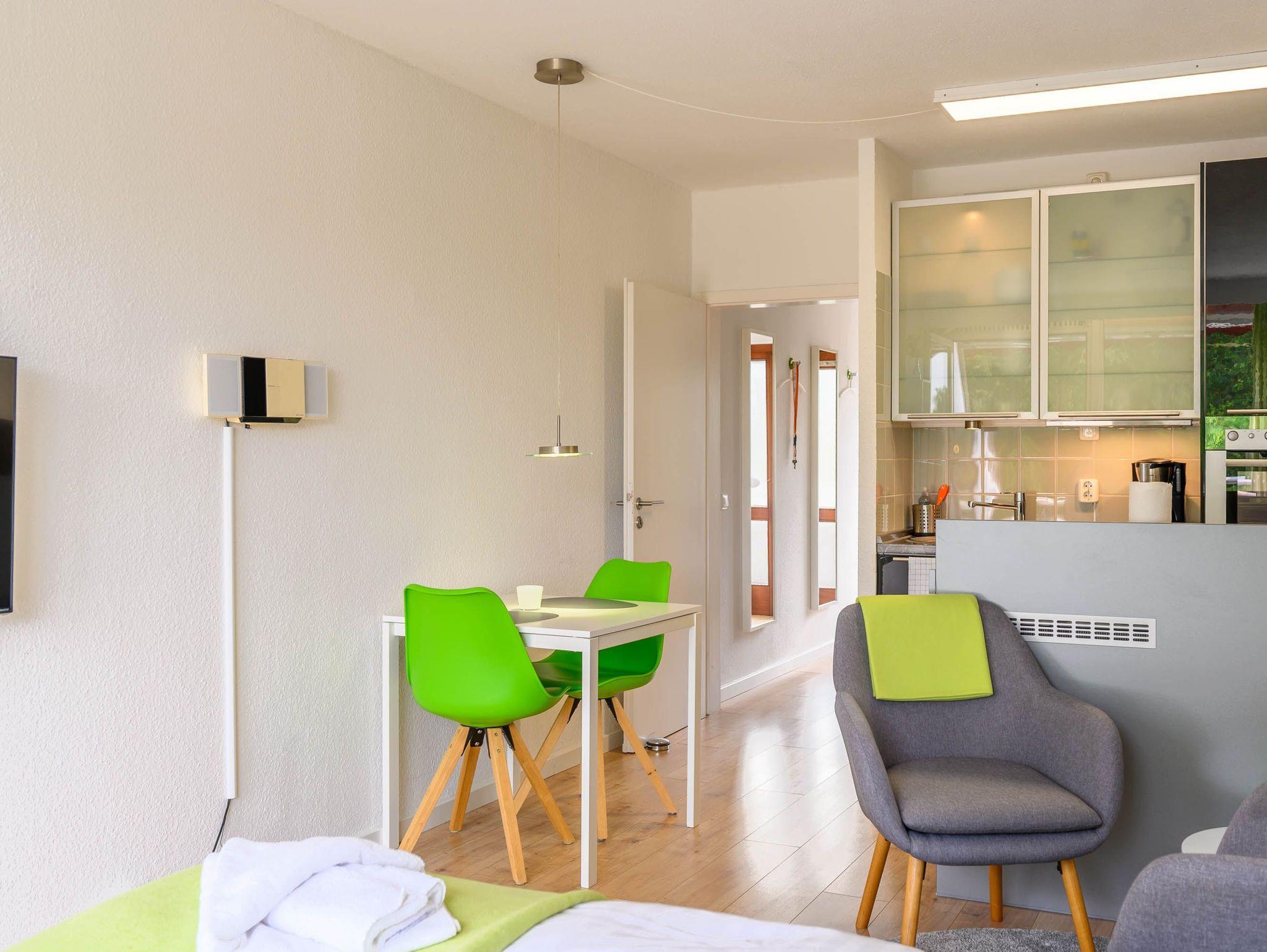 Ein Esstisch mit zwei Stühlen bietet eine angenehme Sitz-, und Aufenthaltsmöglichkeit. Aber auch der Balkon ist mit zwei Stühlen, einem Tisch und einer Markise ausgestattet. Genießen Sie bis in den Abend hinein die Sonne und den entspannenden Blick ins Grüne.