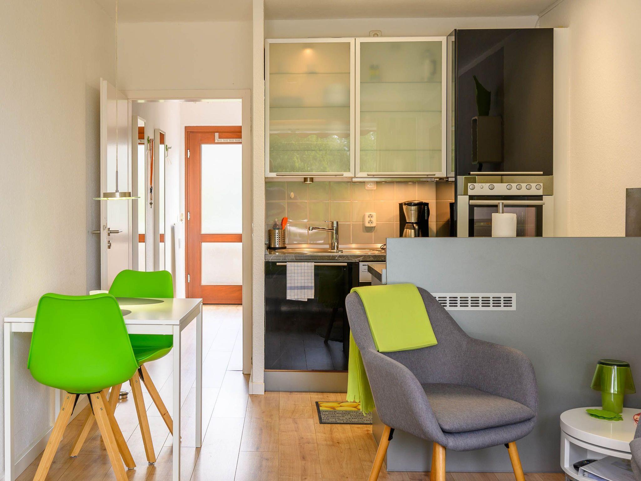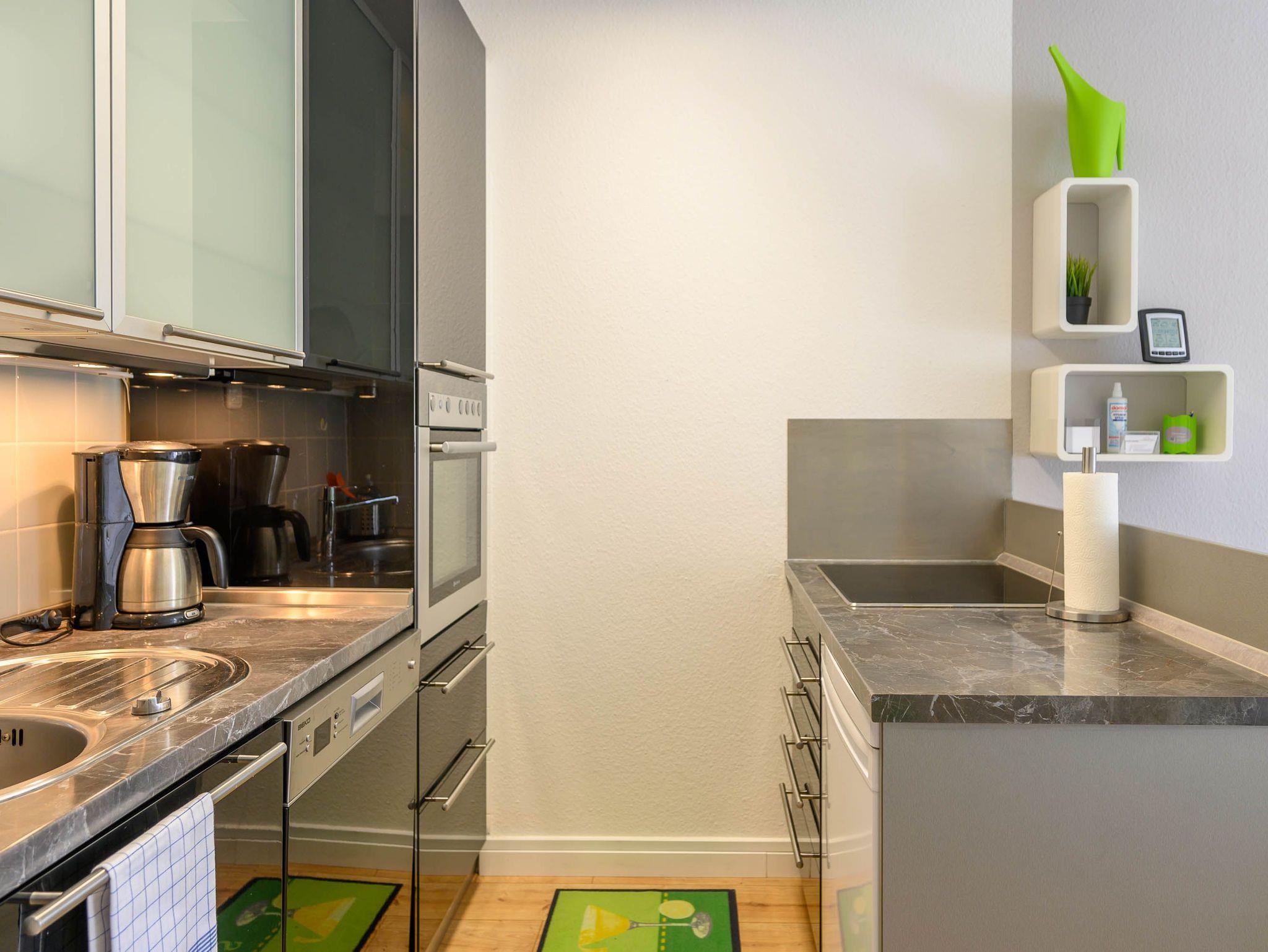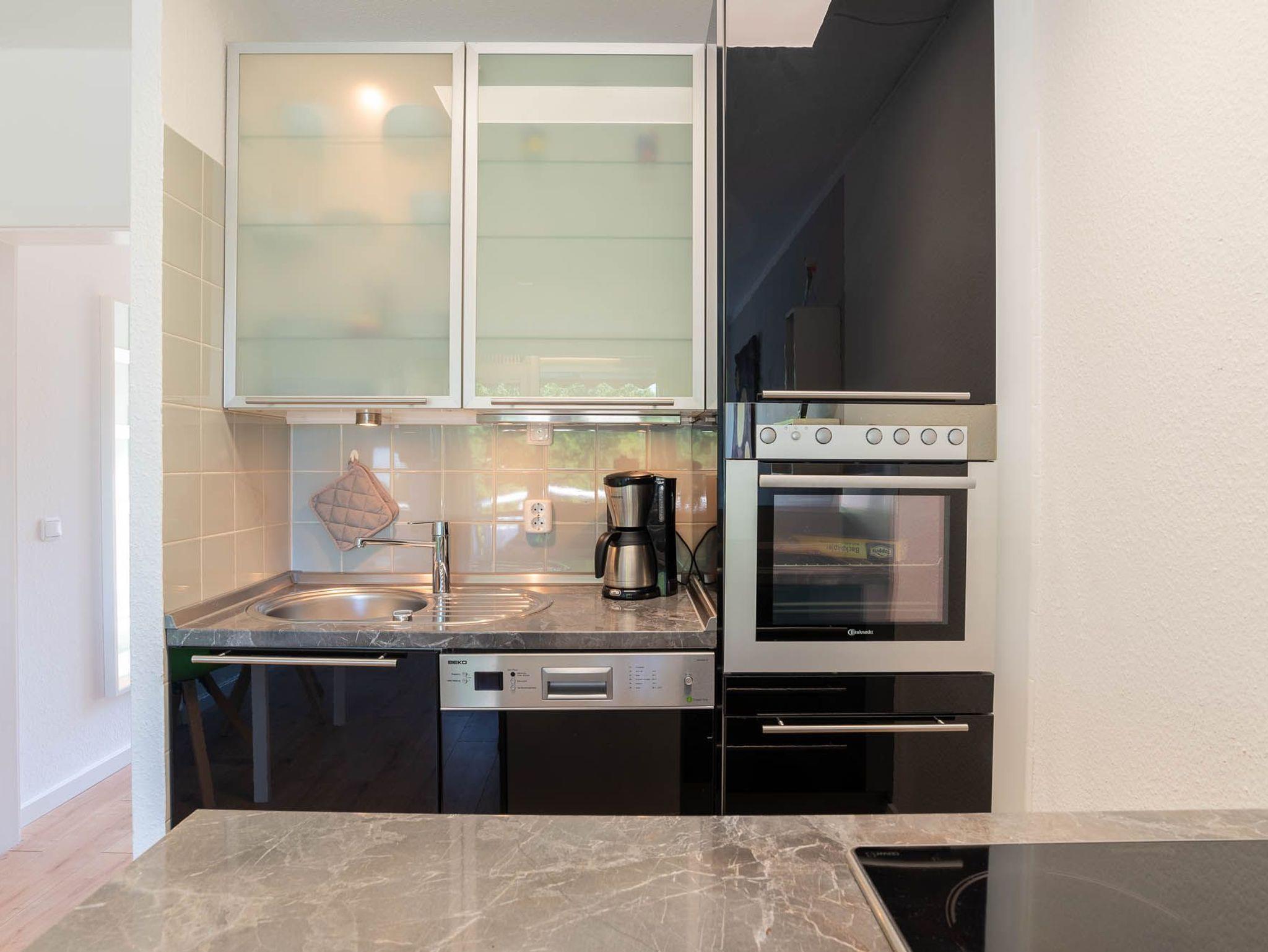 Die mit einer halbhohen Wand abgetrennte moderne Einbauküche hat ein Cerankochfeld, eine Geschirrspülmaschine, sowie einen Kühlschrank mit Gefrierfach. Eine Besonderheit ist der Backofen in erhöhter Position.