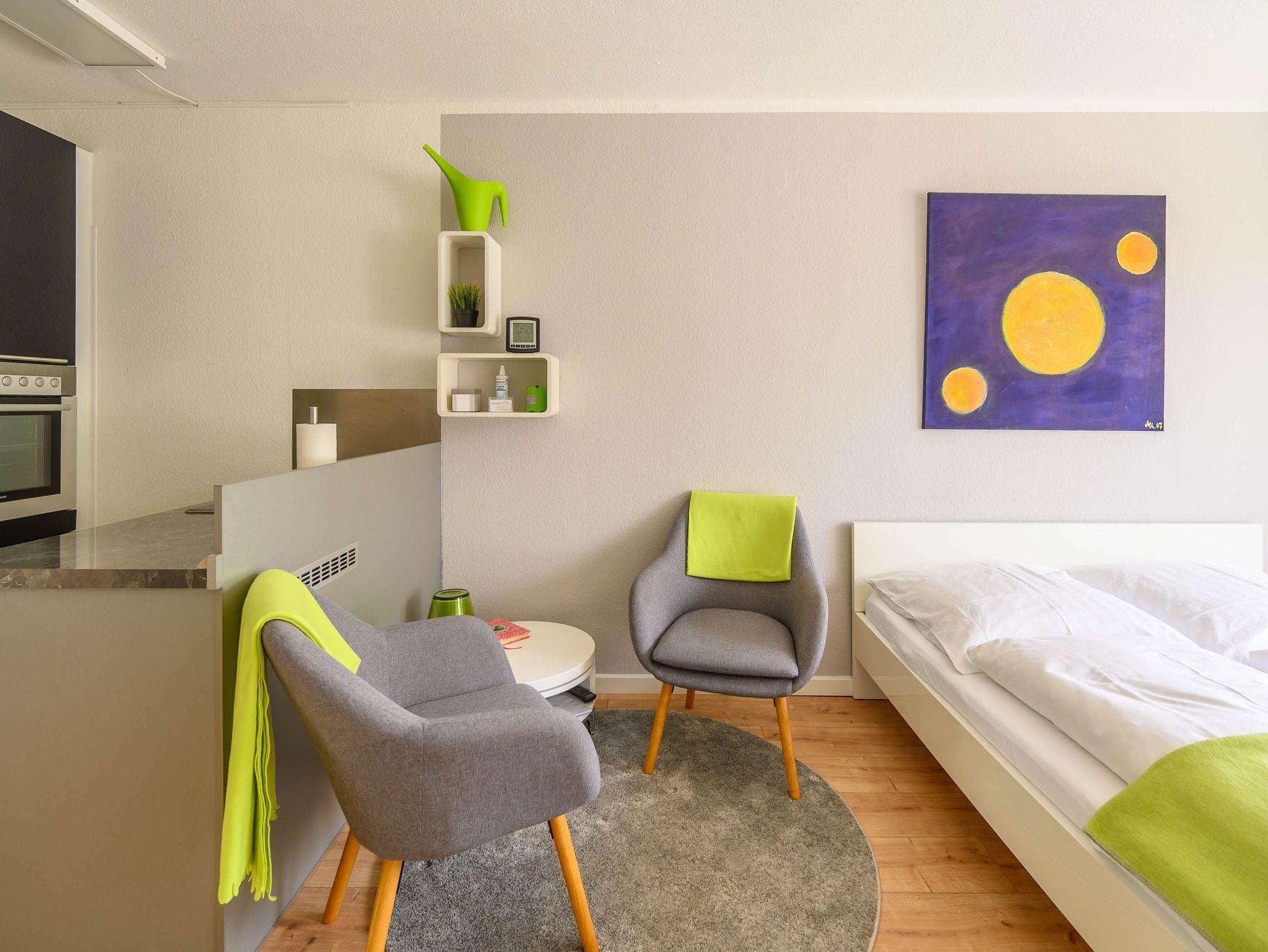 Der kombinierte Wohn- und Schlafraum verfügt über ein Doppelbett in der Größe von 160x200 cm mit getrennten Matratzen. Von hier, oder von dem schicken Sessel aus, können Sie bequem fernsehen. Neben einem LCD-Fernseher ist die Wohnung zudem mit einer Stereoanlage ausgestattet.