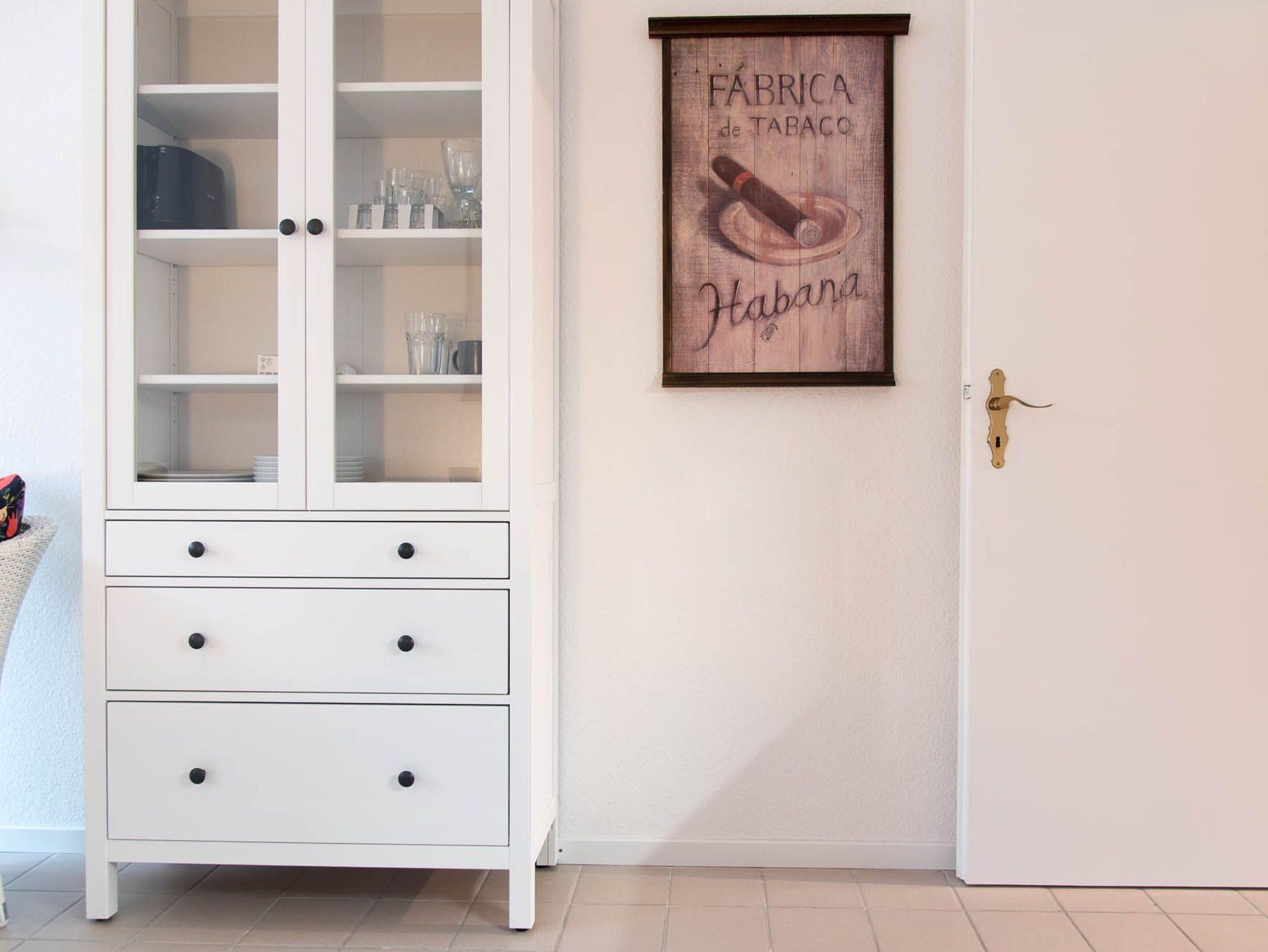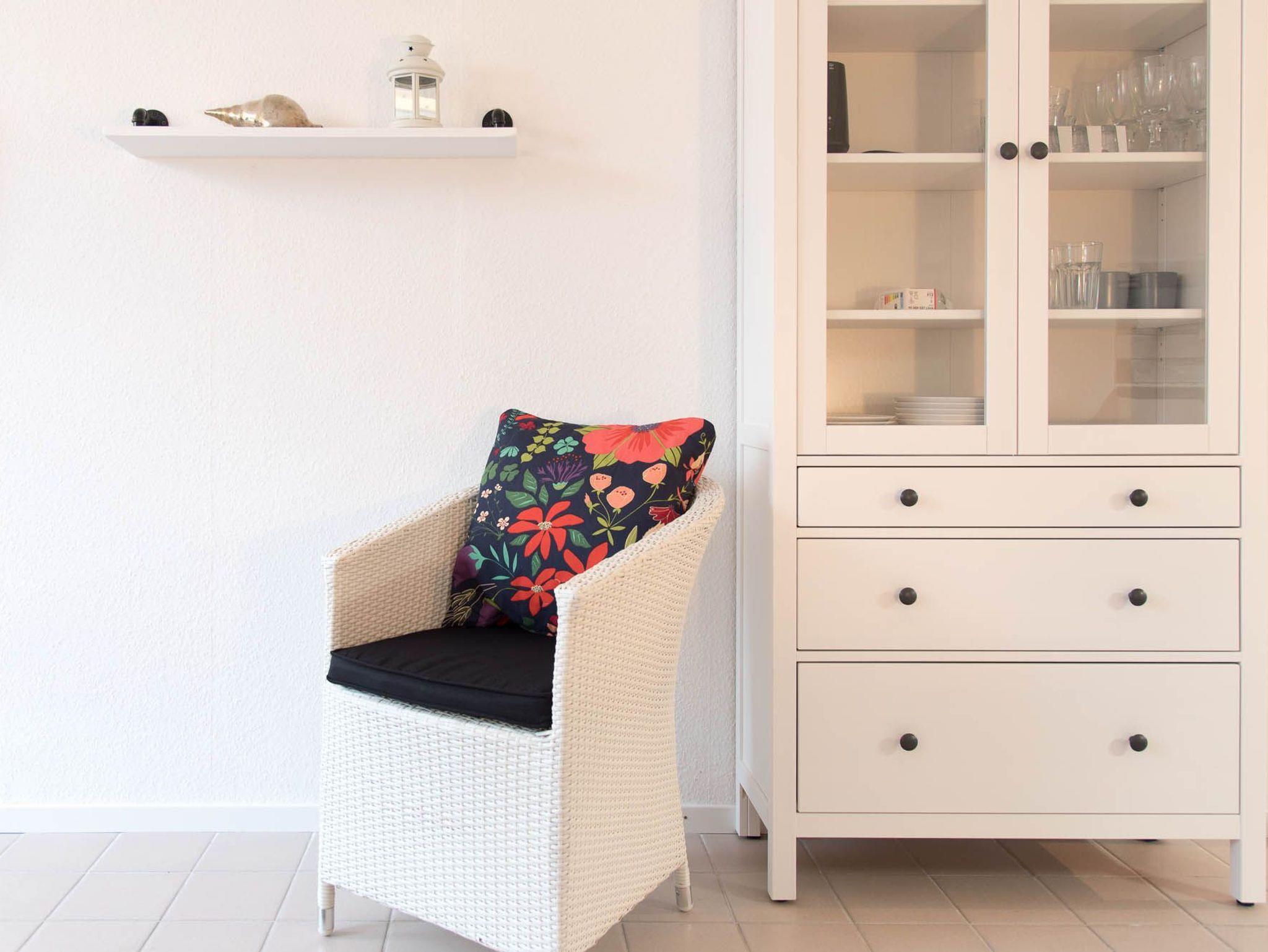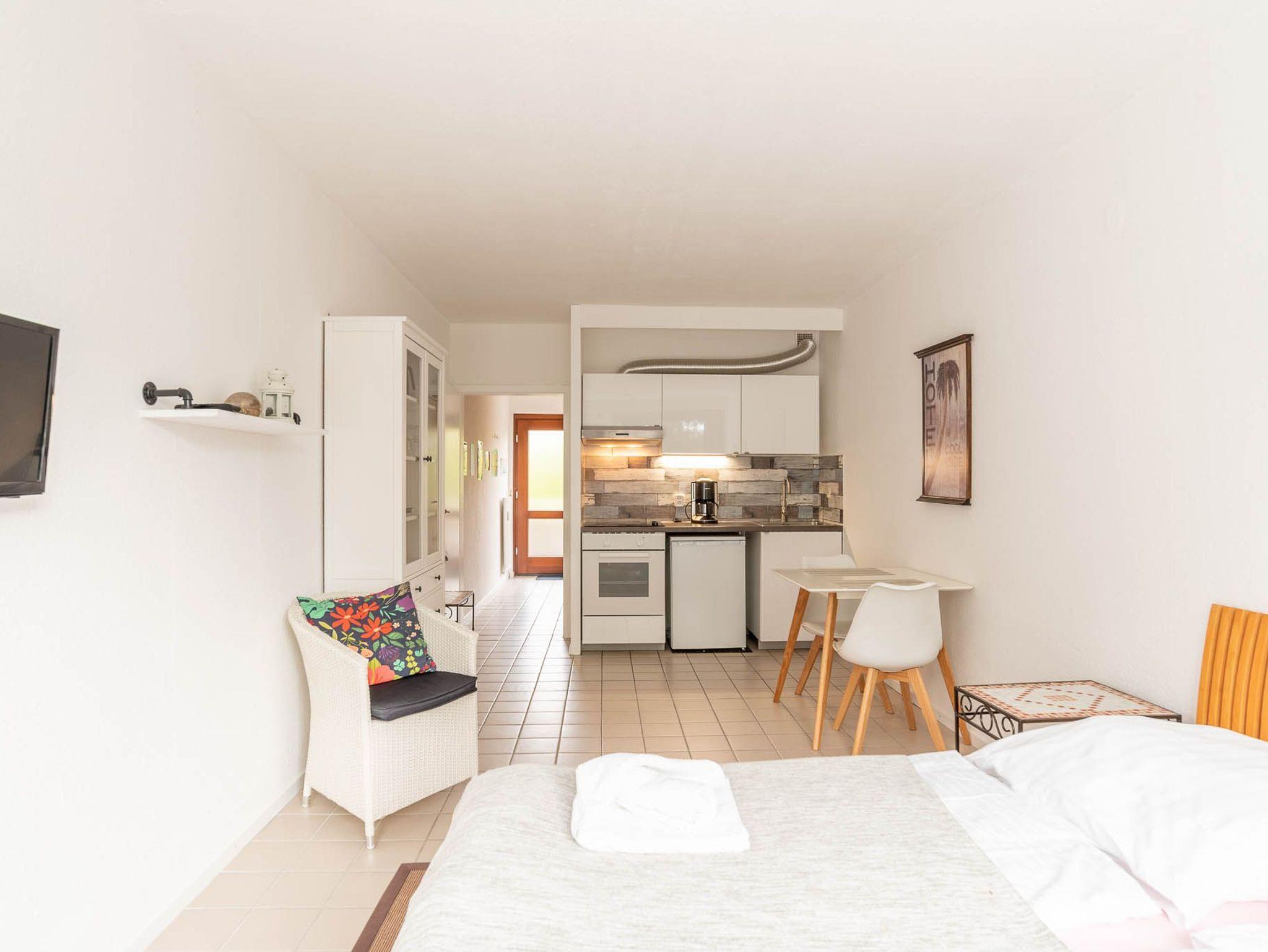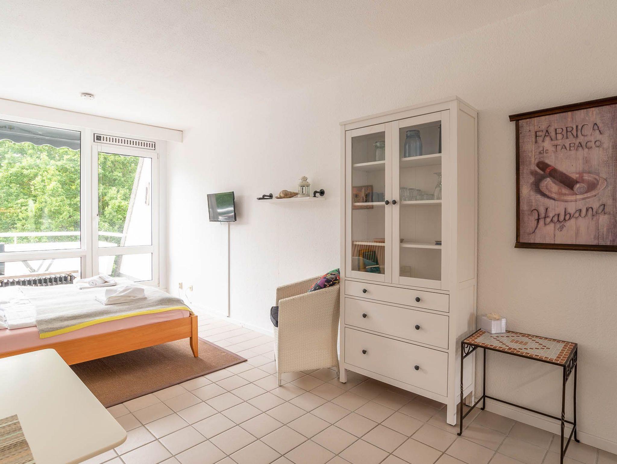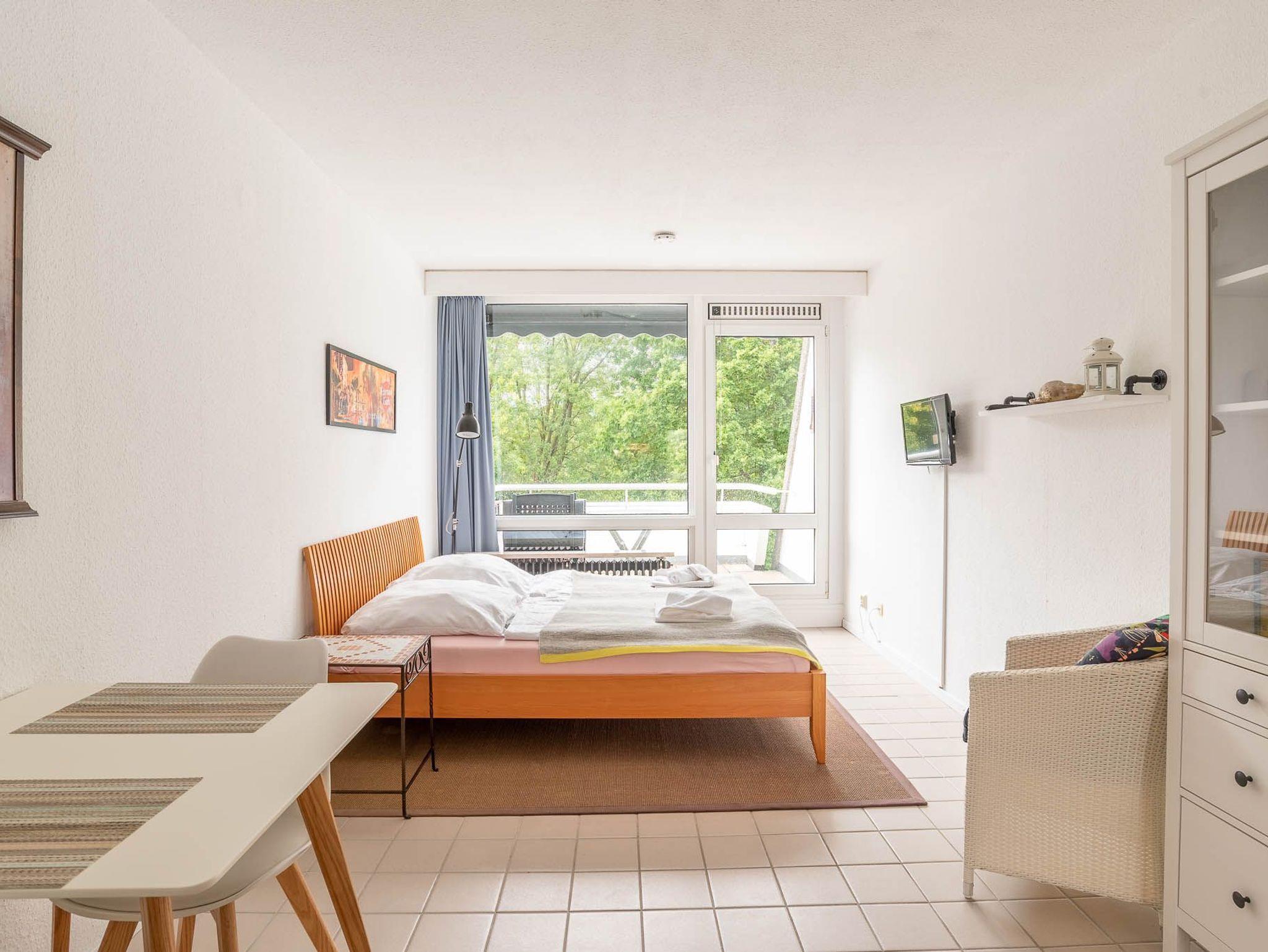 Die 1-Zimmer-Wohnung ist freundlich eingerichtet. Beim Betreten der Wohnung gelangen Sie zuerst in einen kleinen Flur mit Möglichkeiten Ihr Gepäck zu verstauen. Von hier aus erreichen Sie das voll ausgestattete Badezimmer, sowie den Wohn-, Ess-, und Schlafbereich. Das Apartment lässt sich bei Bedarf mit Gardinen abdunkeln. Zum Übernachten steht Ihnen ein Doppelbett (Liegefläche von 160 x 200 cm) zur Verfügung. Neben einer Vitrine, die ausreichend Stauraum bietet und einem Sessel ist zudem ein kleiner Flatscreen-Fernseher in diesem Apartment für Sie vorhanden.