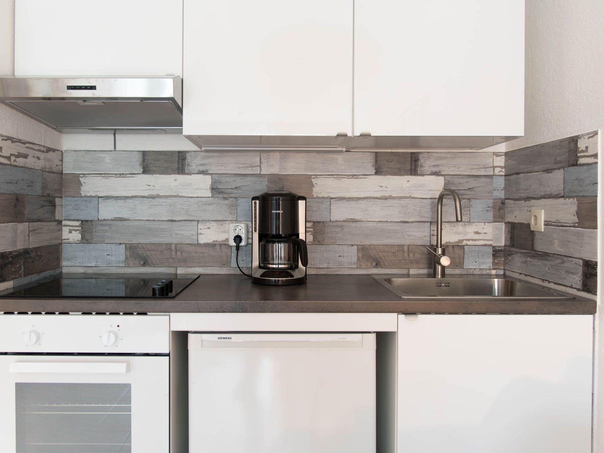 Die offene Küche ist mit gut ausgestattet, was Sie für den täglichen Bedarf benötigen: Von der Kaffeemaschine über das Ceran-Kochfeld, den Ofen, Toaster, Kühlschrank mit Gefrierfach bis hin zum Wasserkocher und ausreichendem Geschirr und Gläser, sollte es Ihnen an nichts fehlen. An der Küchenzeile schließt sich der Essbereich mit einem Tisch und zwei Stühlen an.