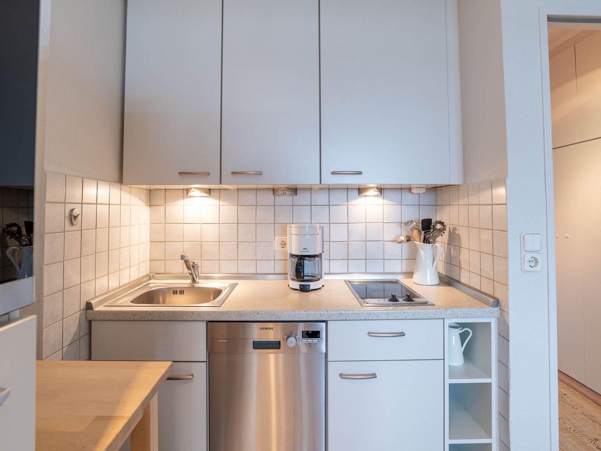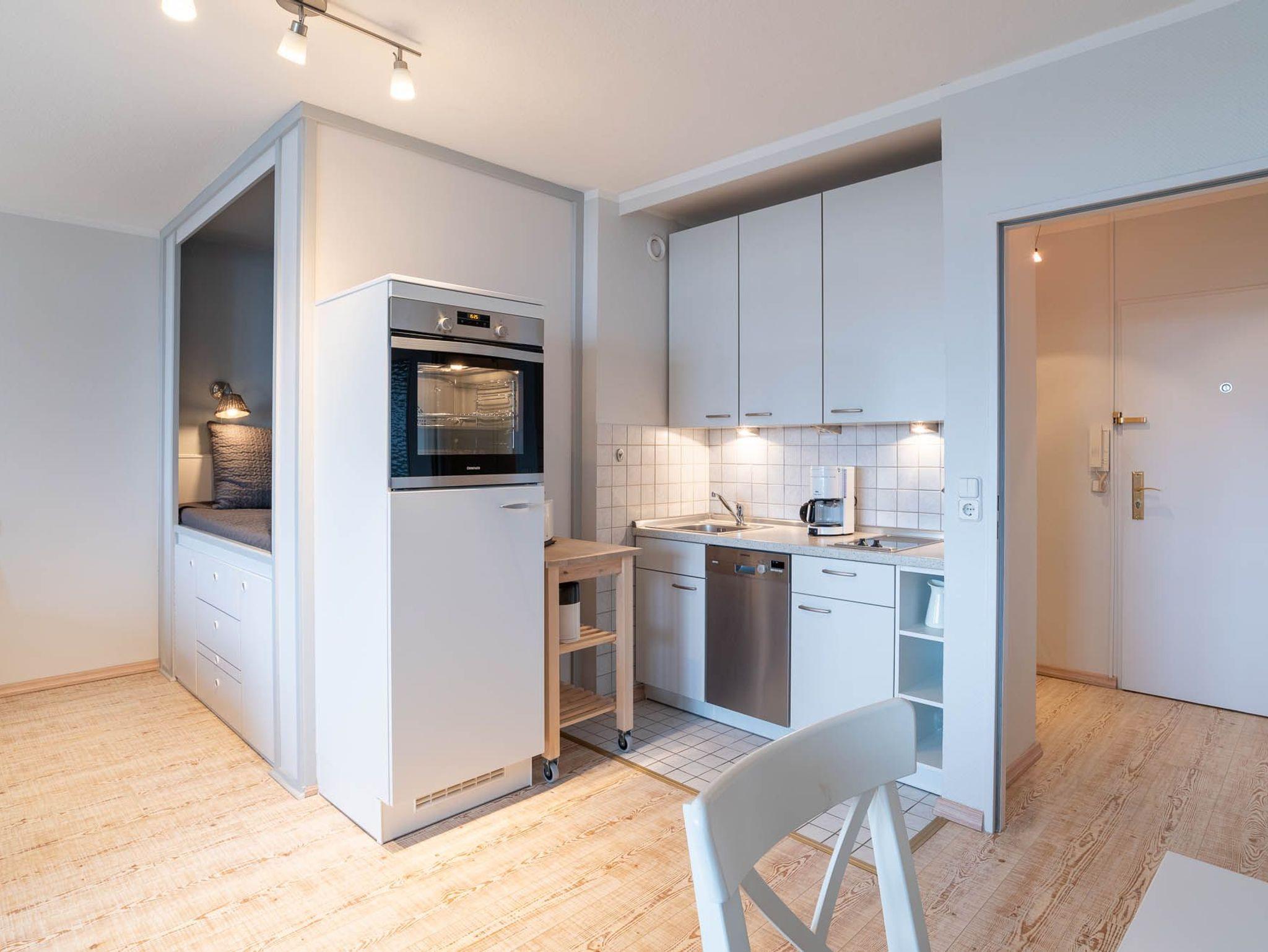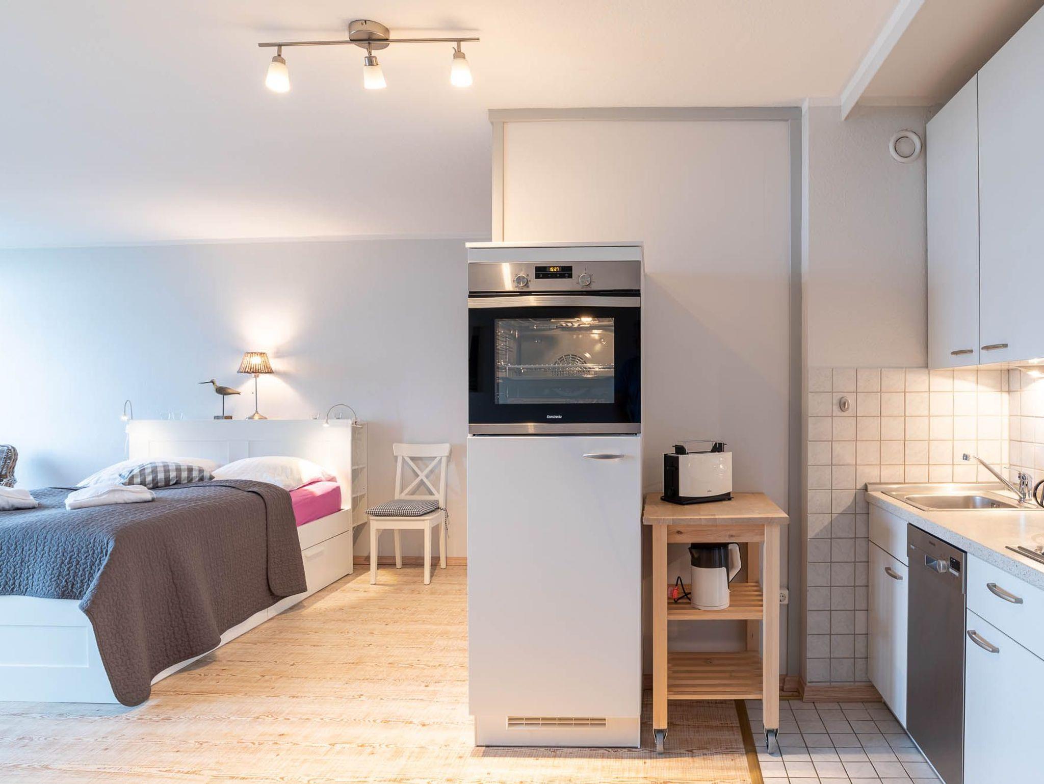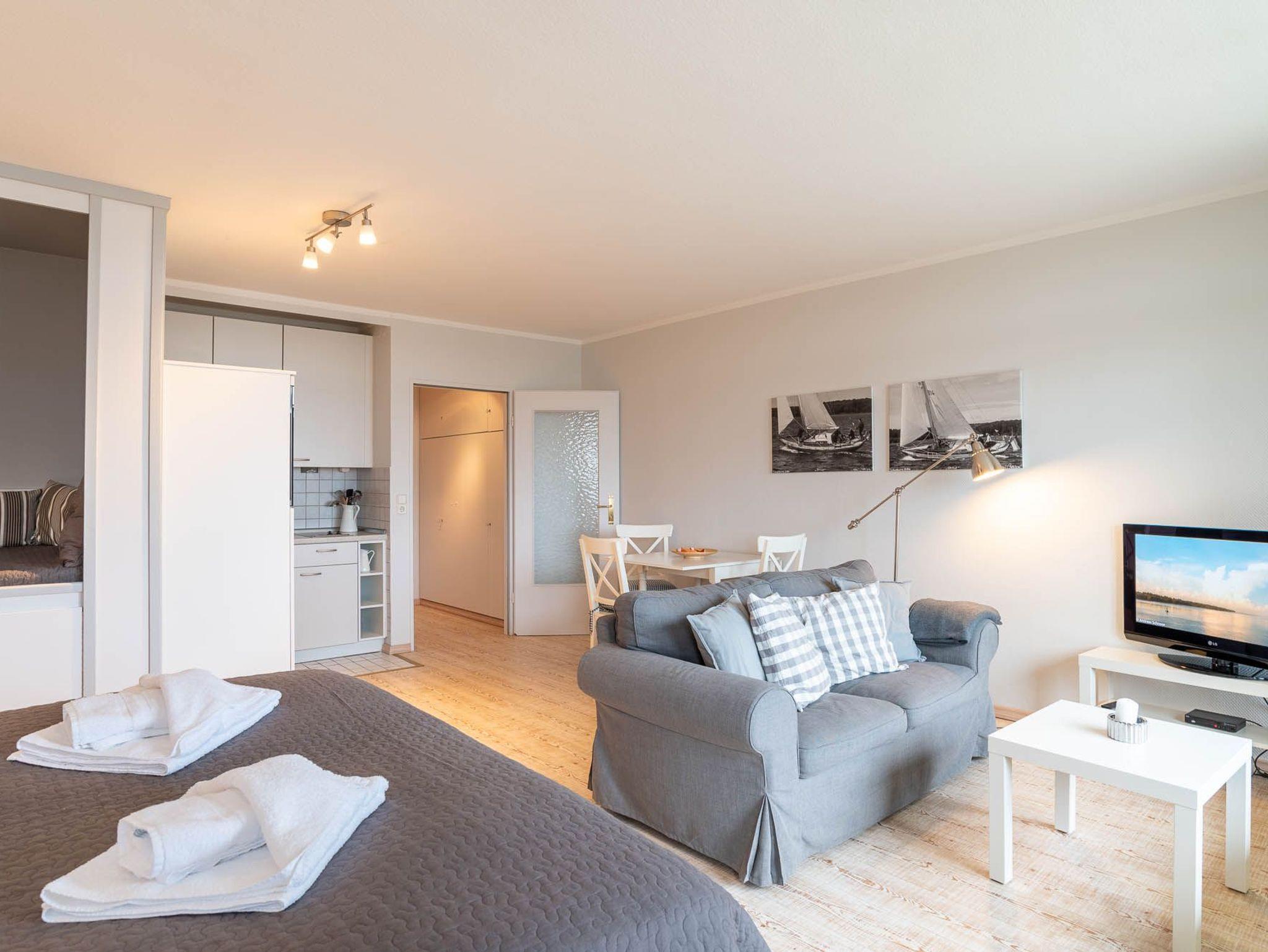 Im Tageshellen Wohn- und Essbereich befindet sich ein gemütliches Sofa, ein Flachbild-TV sowie ein Esstisch für drei Personen. Die angrenzende Küchenzeile ist funktionell mit einem Backofen in Griffhöhe und einem Geschirrspüler eingerichtet und hat alles Notwendige, um sich Mahlzeiten zuzubereiten. Der Kühlschrank verfügt über ein integriertes Gefrierfach.