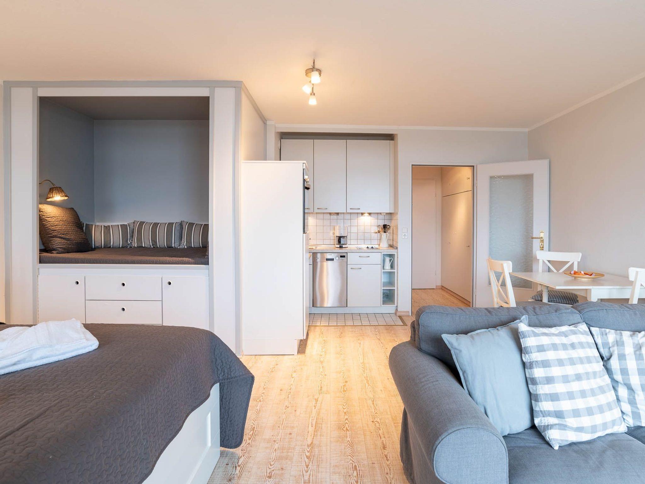 Namensgeber und Highlight dieser Wohnung ist ein hübscher Alkoven, also eine Bettnische. Diese ?Schlafhöhle? hat eine Liegefläche von 120x200 cm und ist für eine dritte Person geeignet. Direkt gegenüber befindet sich das Doppelbett (160x200). Durch die sich darunter befindenden Schubladen hat das Bett eine angenehme Komforthöhe und verfügt über ausreichend Stauraum, zum Beispiel für die Unterbringung Ihrer Kleidung. Das Apartment lässt sich mit Gardinen abdunkeln.