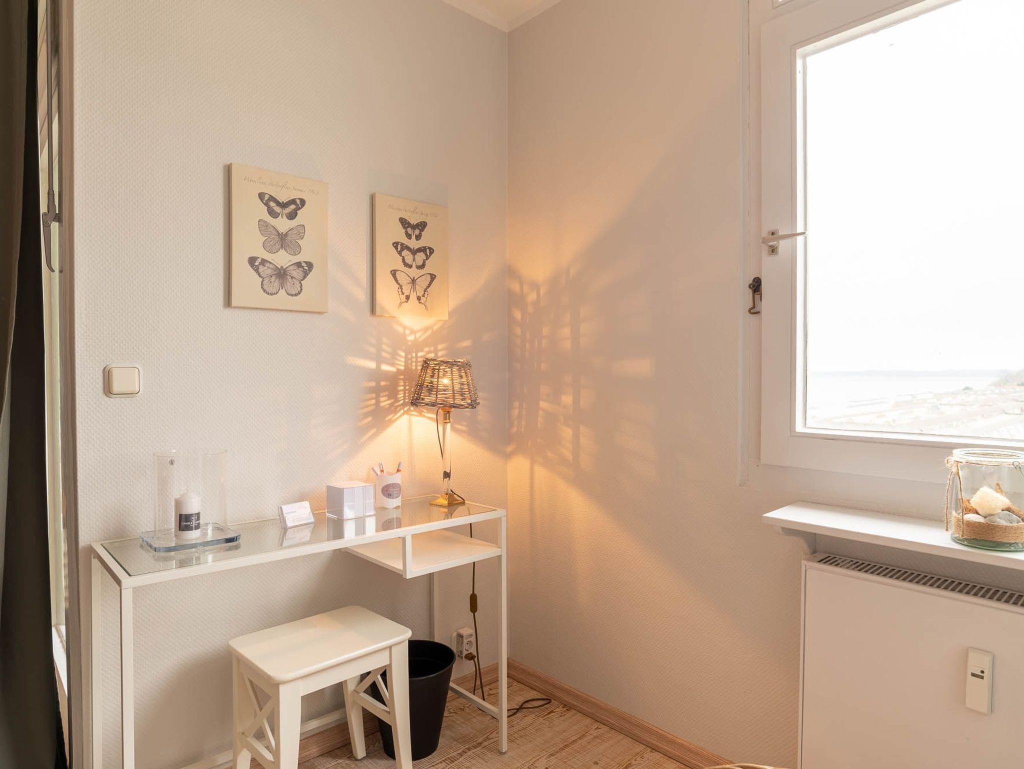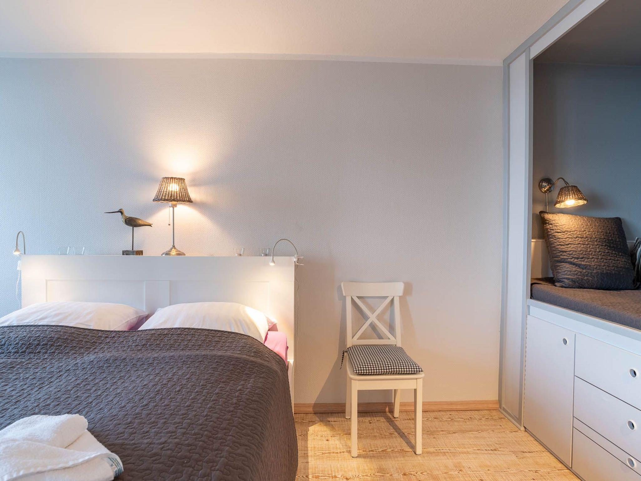 Namensgeber und Highlight dieser Wohnung ist ein hübscher Alkoven, also eine Bettnische. Diese „Schlafhöhle“ hat eine Liegefläche von 120x200 cm und ist für eine dritte Person geeignet. Direkt gegenüber befindet sich das Doppelbett (160x200). Durch die sich darunter befindenden Schubladen hat das Bett eine angenehme Komforthöhe und verfügt über ausreichend Stauraum, zum Beispiel für die Unterbringung Ihrer Kleidung. Das Apartment lässt sich mit Gardinen abdunkeln.