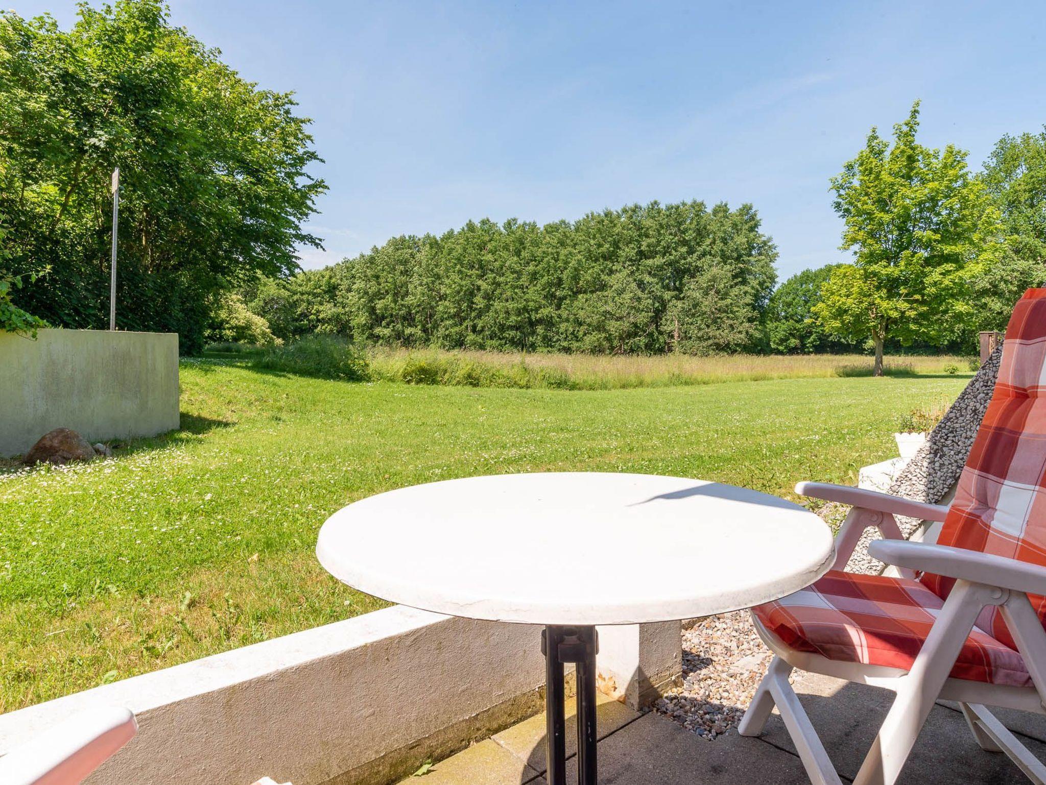 Die Ferienwohnung befindet sich im Erdgeschoss und verfügt über eine schöne Terrasse, die zur Sonnenseite gelegen ist. Zwei Gartenstühle und ein Tisch stehen für Sie bereit. Genießen Sie ab der Mittagszeit die Sonne und den Blick in den grünen Park. Zum Sonnenschutz verfügt die Terrasse über eine ausfahrbare Markise.