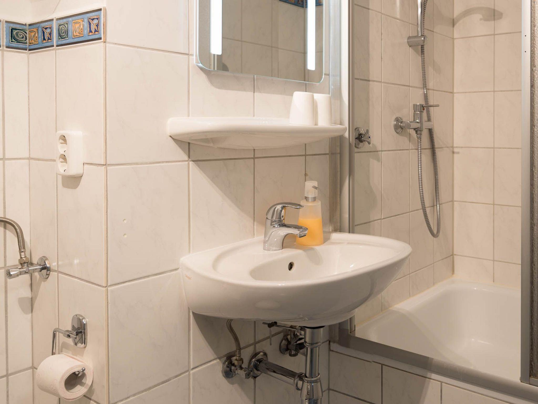 Das Badezimmer befindet sich in einem gepflegten Zustand und ist mit einer Dusche ausgestattet.