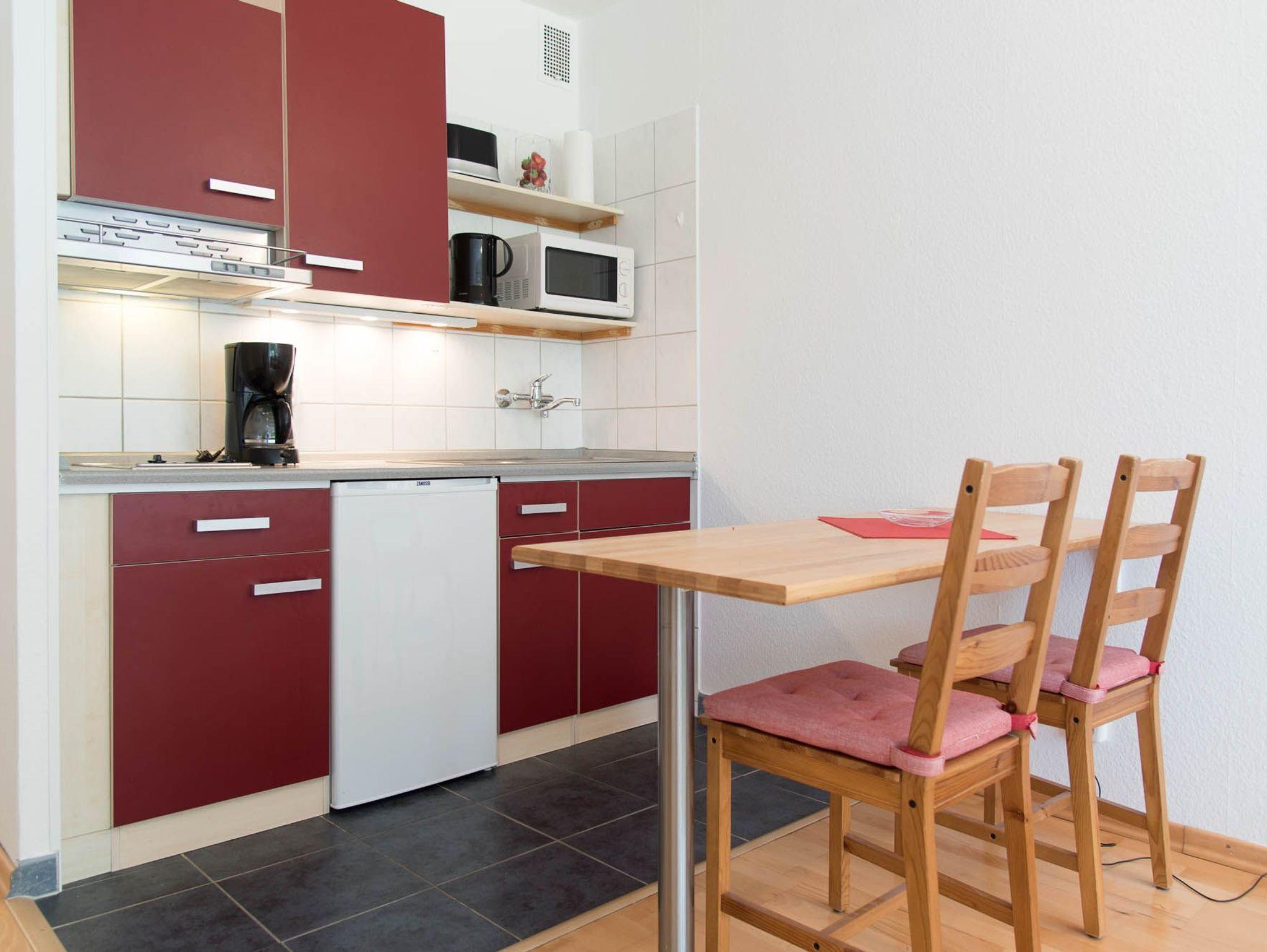 Die Küche ist funktionell eingerichtet und hat alles Notwendige, um zu frühstücken, oder kleinere Mahlzeiten zu kochen. Neben dem Cerankochfeld mit zwei Kochfeldern verfügt der Kühlschrank über ein kleines Gefrierfach und die vorhandene Mikrowelle ist mit Grillfunktion ausgestattet.