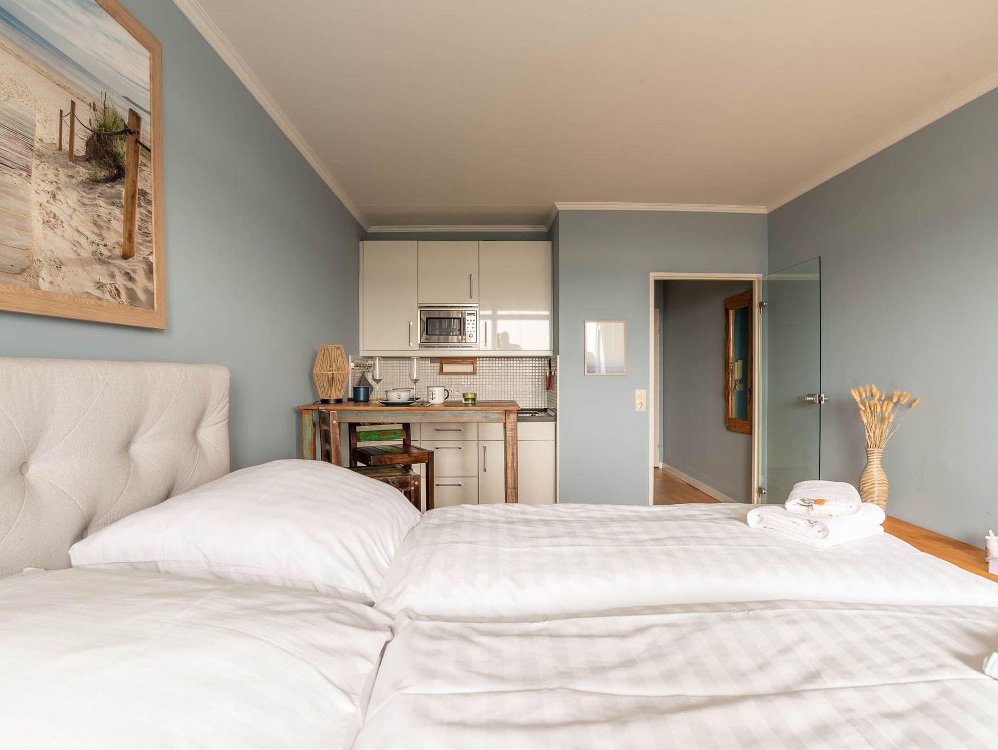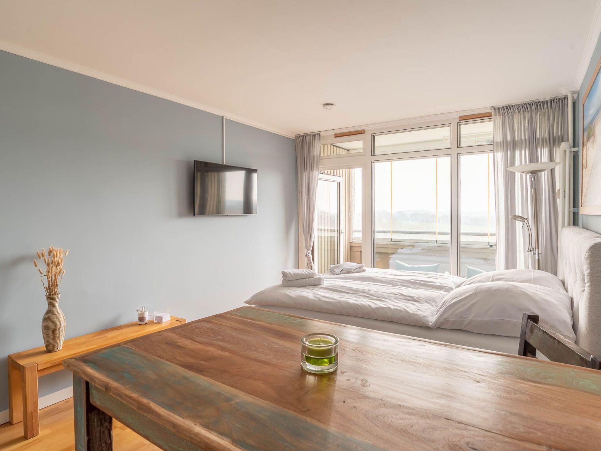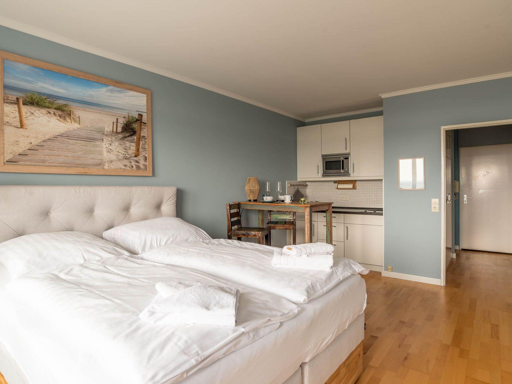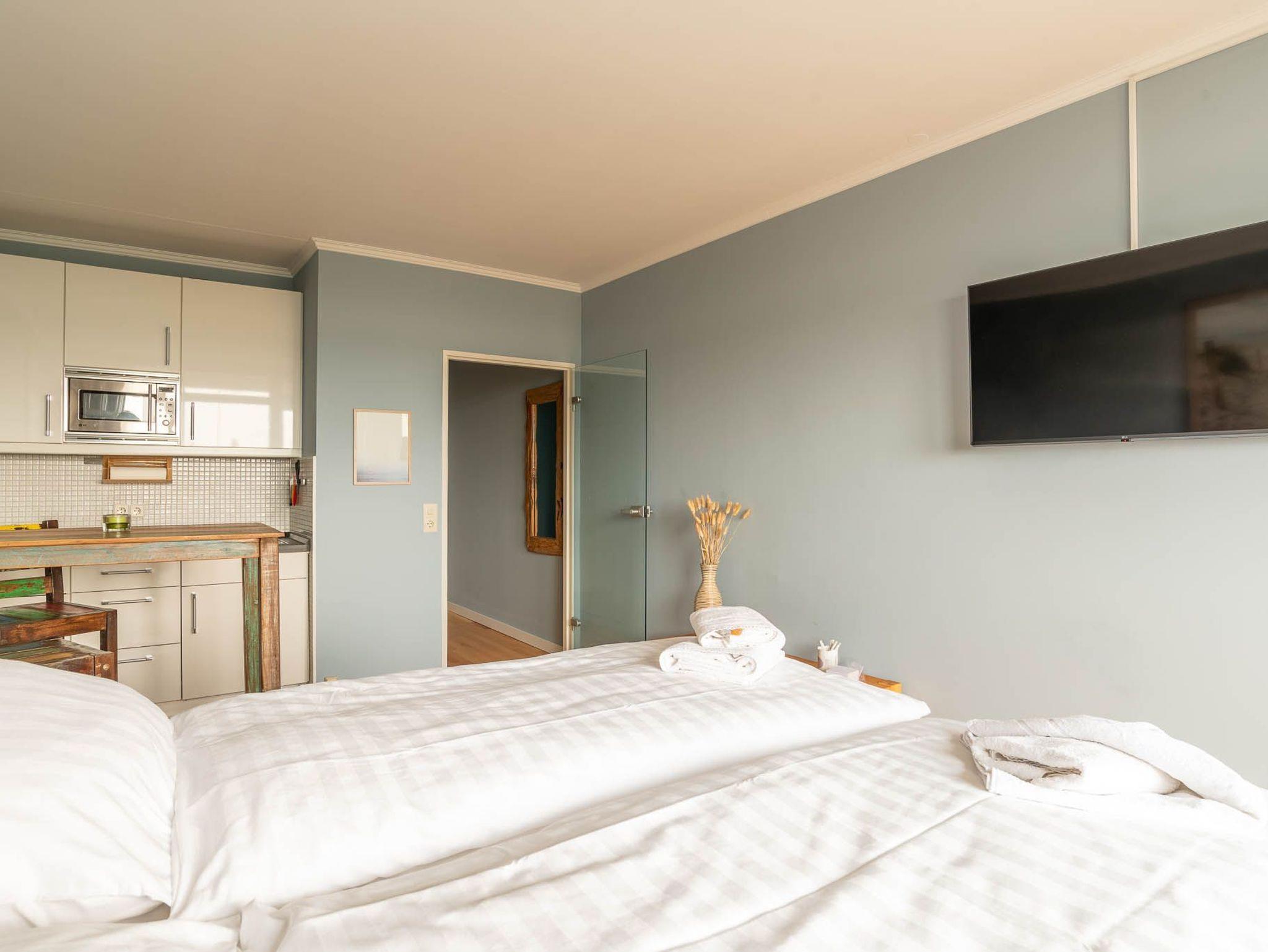 Im freundlichen Appartement befindet sich ein bequemes Boxspringbett (Liegefläche von 160x200 cm). An der Wand gegenüber ist ein LCD- Fernseher angebracht.