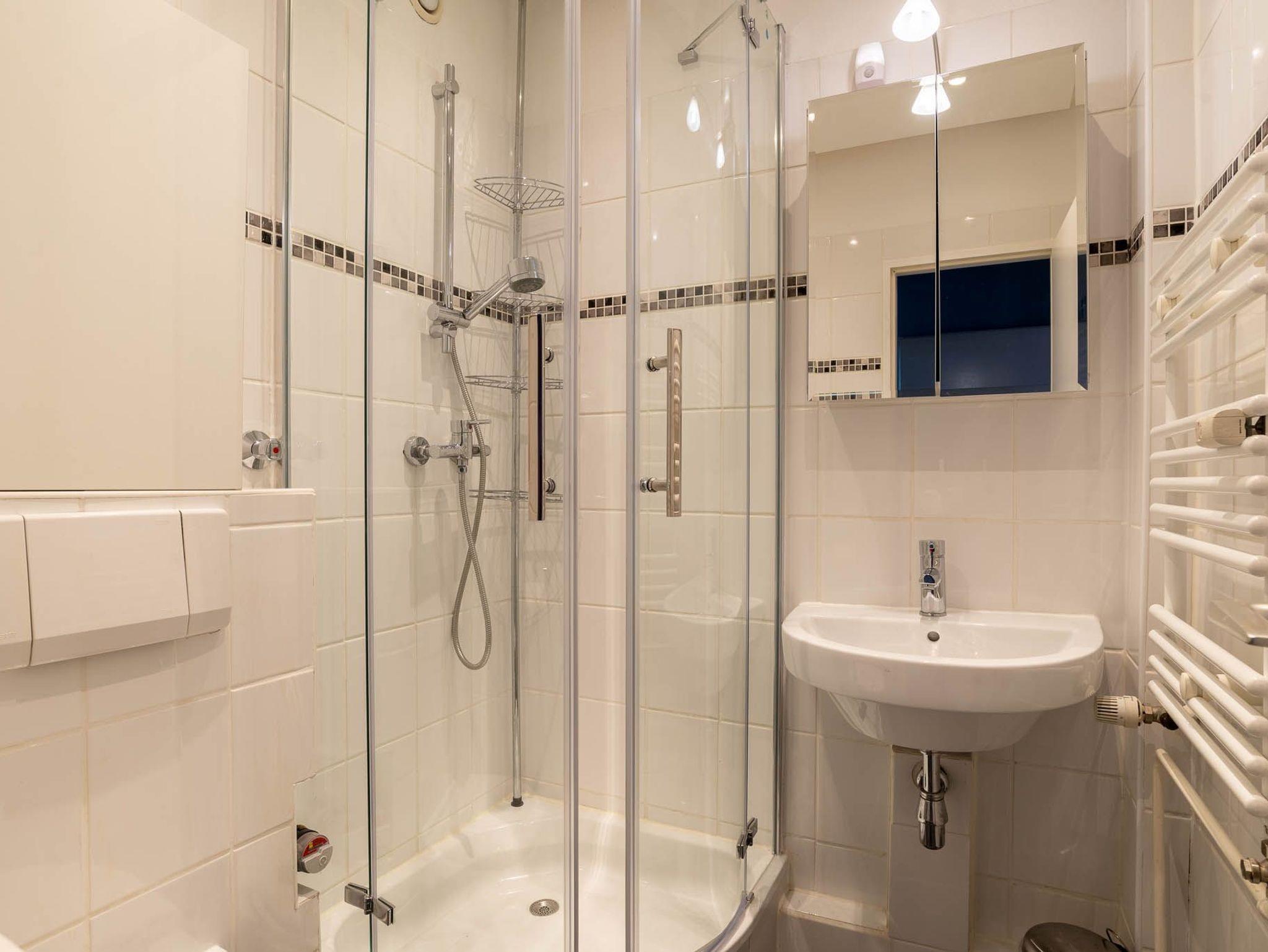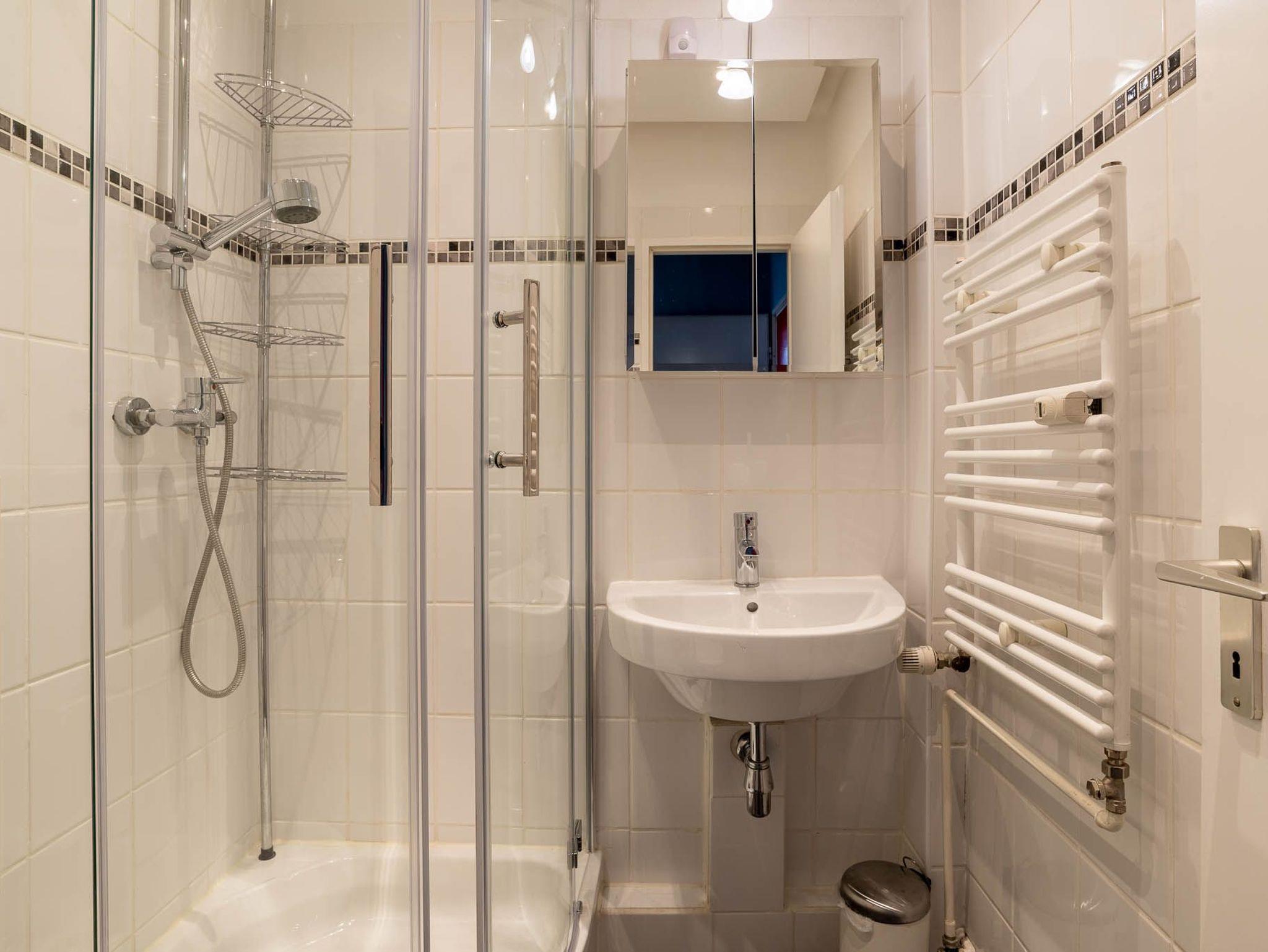 Das separate Badezimmer mit Eckdusche befindet sich in einem gepflegten und modernen Zustand.