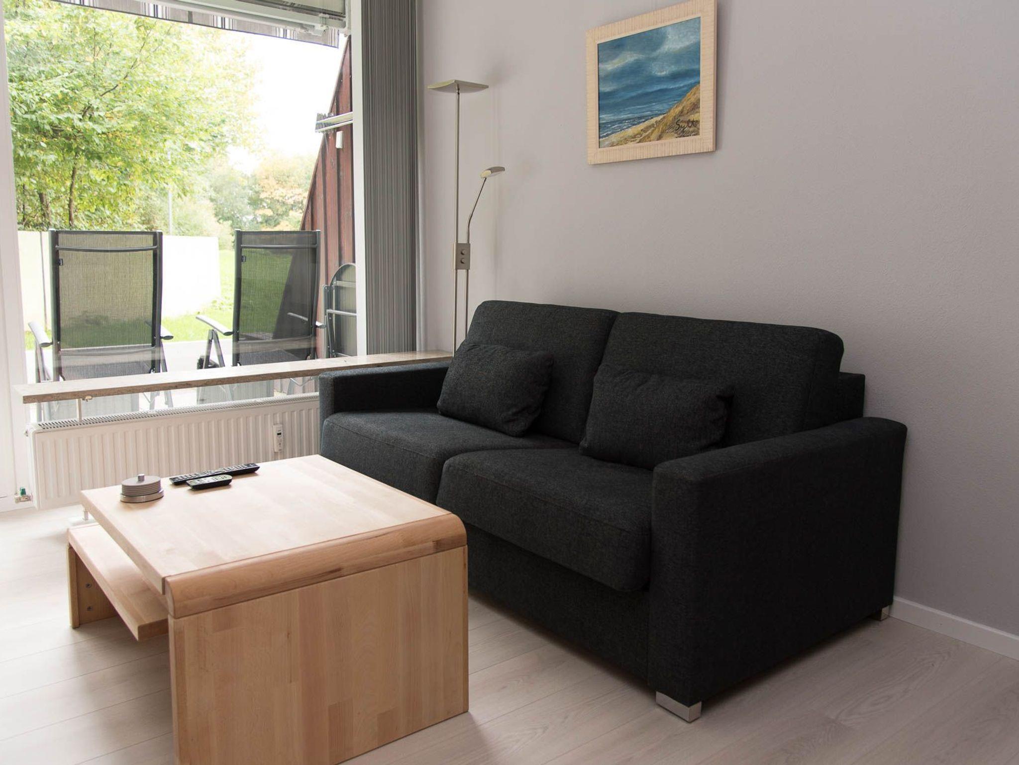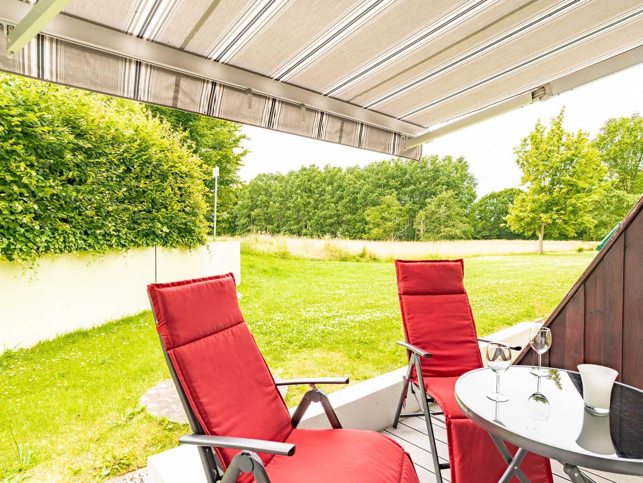 Durch die schöne Süd-West-Ausrichtung der Immobilie können Sie auf der Terrasse die Sonne fast den ganzen Tag genießen. Hierfür stehen Liegestühle und ein Gartentisch für Sie bereit. Die elektrische Markise bietet bei Bedarf ausreichenden Sonnenschutz. Aber auch der Strand ist in nur 150 Metern schnell zu erreichen. Ihre Strandtücher können Sie auf einem Wäscheständer im Garten aufhängen. Im Abstellraum finden Sie ebenfalls eine Waschmaschine mit Trocknerfunktion, sowie ein Bügelbrett und Bügeleisen. Das Duschbadezimmer ist mit einem großen Spiegel und Föhn ausgestattet.