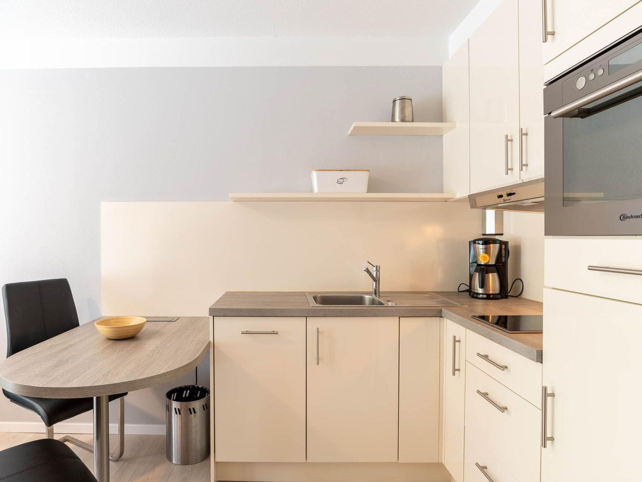 An der Couch angrenzend befindet sich ein Esstisch mit zwei Stühlen. Die weiße Einbauküche verfügt über einen Backofen mit Mikrowellenfunktion, eine Spülmaschine, ein Cerankochfeld, sowie einen Kühlschrank mit Gefrierkombination. Mit einer Kaffeemaschine, einem Wasserkocher, Toaster, Eierkocher und Handmixer kann einem gemütlichen Frühstück nichts mehr im Wege stehen.