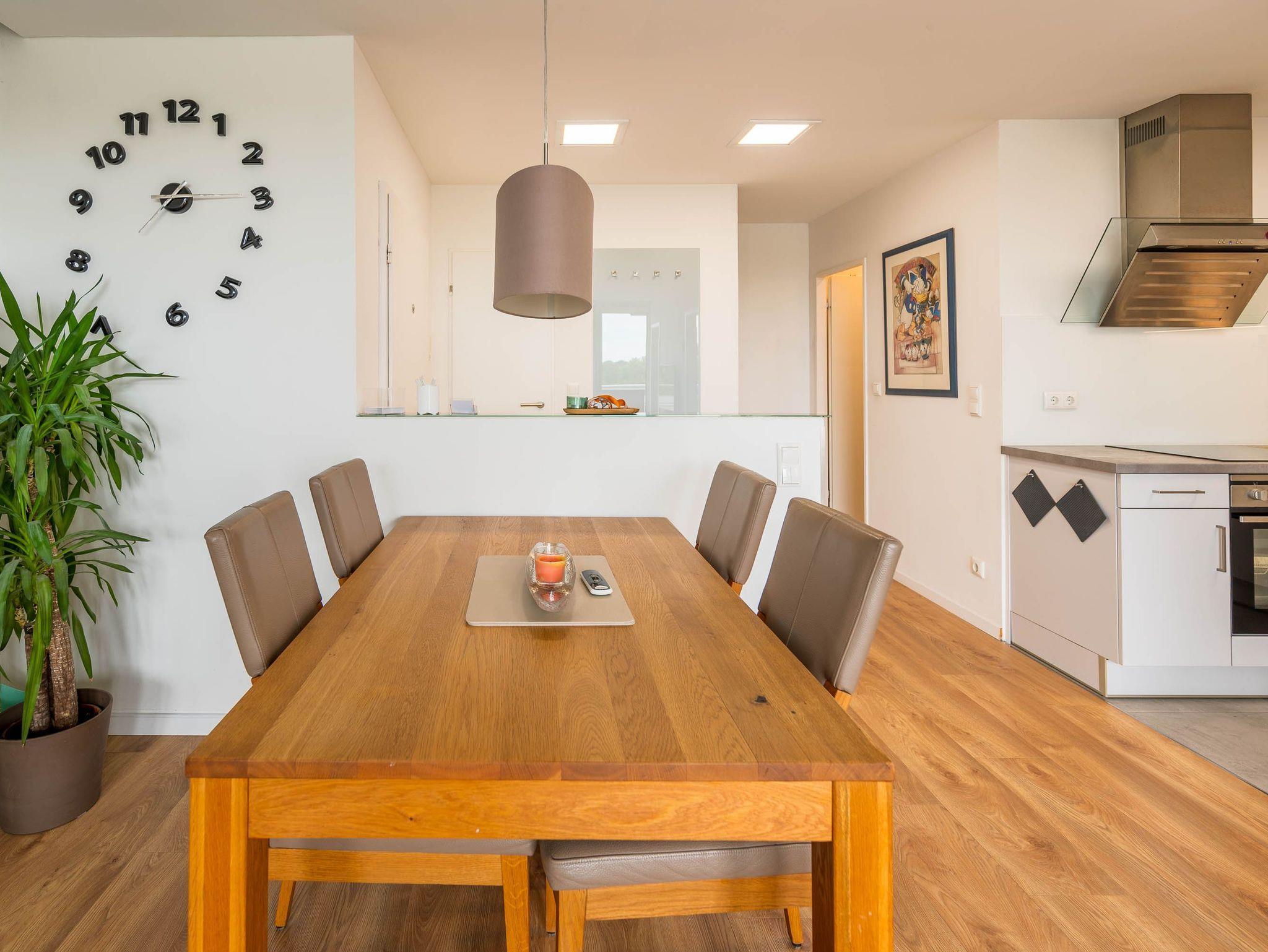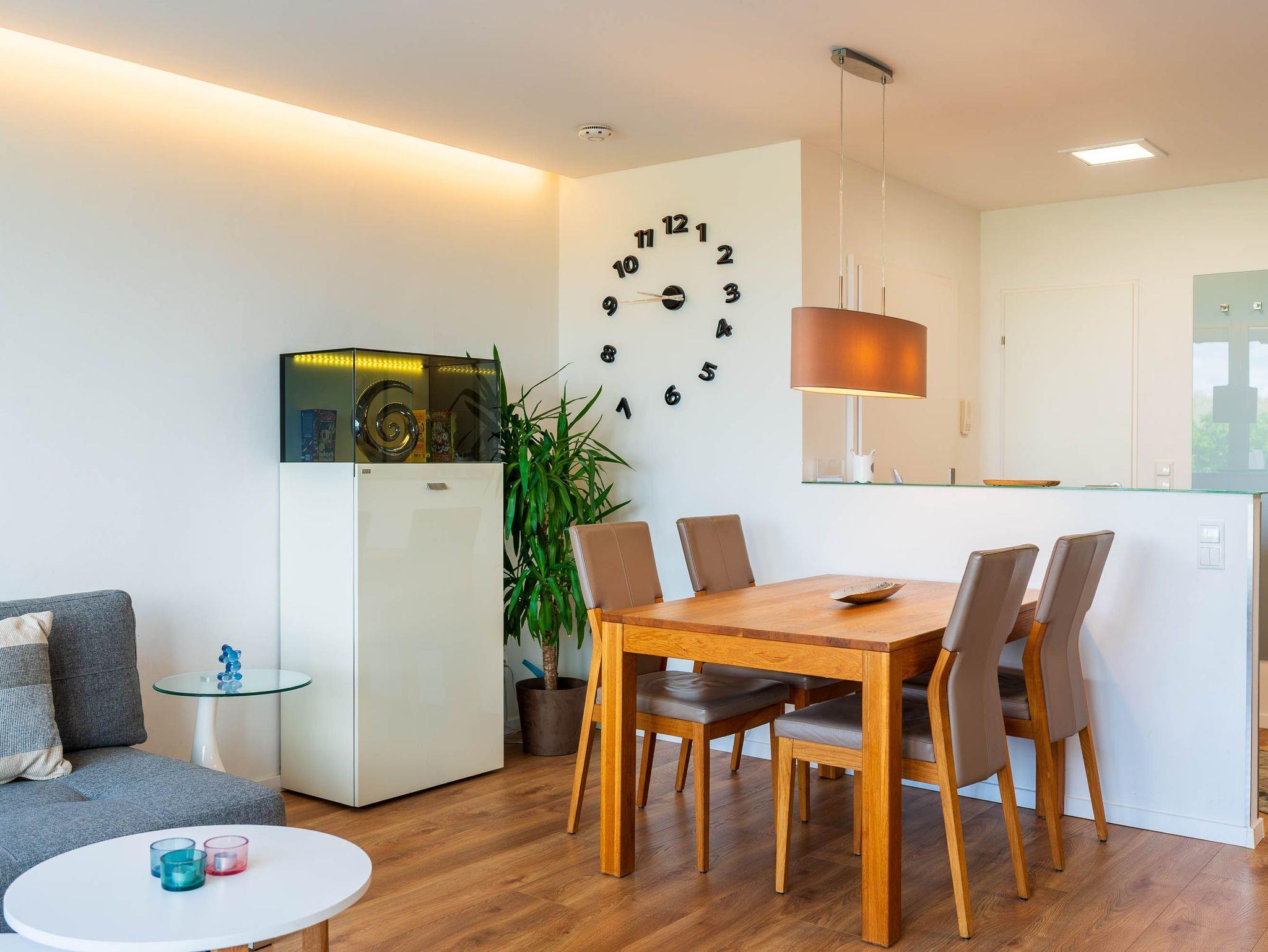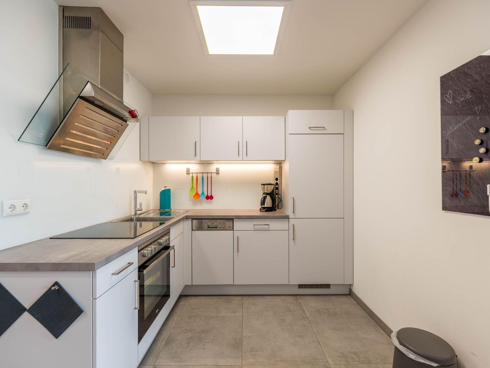 Im Wohnbereich bietet ein großer Holztisch mit vier bequemen Stühlen ausreichend Platz ? perfekt für ein Essen in gemeinsamer Runde. Direkt gegenüber befindet sich die angrenzende Einbauküche. Die offene Küche mit Arbeitsfläche in Betonoptik ist mit hochwertigen Elektrogeräten ausgestattet. Ceranherd, Backofen und Geschirrspüler, Kühlschrank mit separatem Gefrierfach, Wasserkocher, Toaster und eine Kaffeemaschine bietet eine Ausstattung fast wie zu Hause.