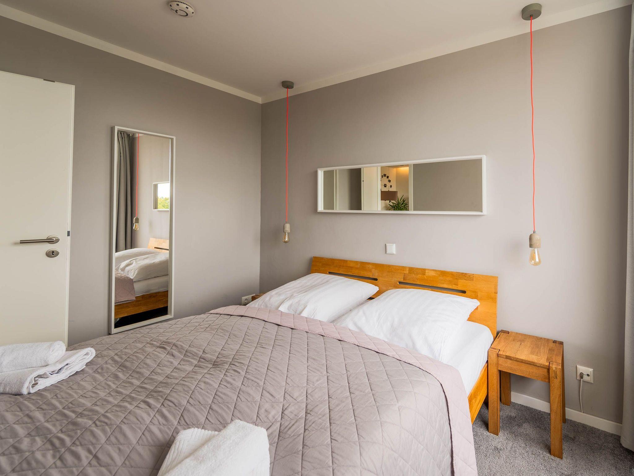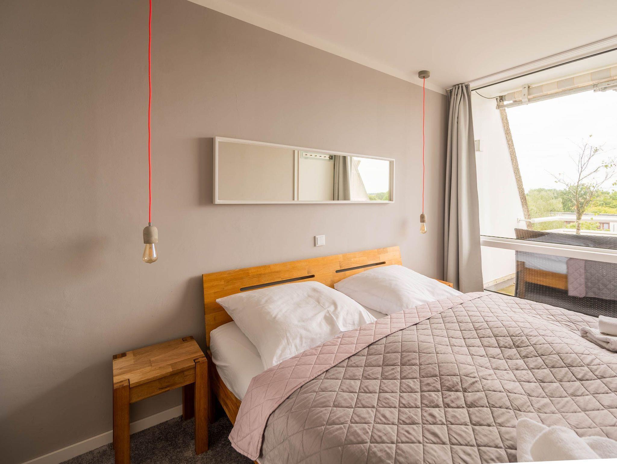 Das Schlafzimmer verfügt über ein Doppelbett (200x160) und ist mit Teppichboden ausgelegt. Ein Licht- bzw. Sichtschutz, der den Schlafbereich gut abdunkelt, ist vorhanden sowie auch im Wohnbereich.