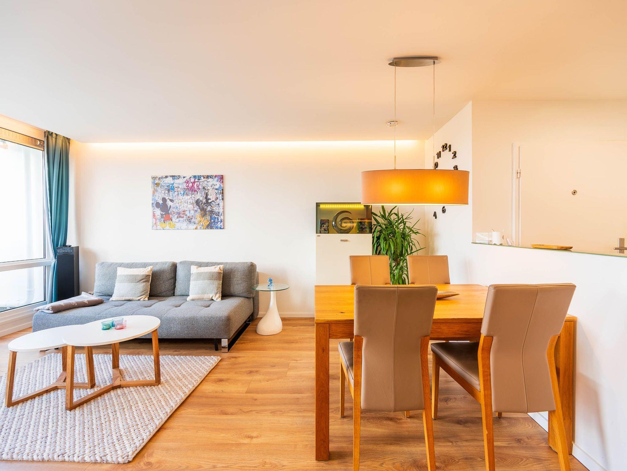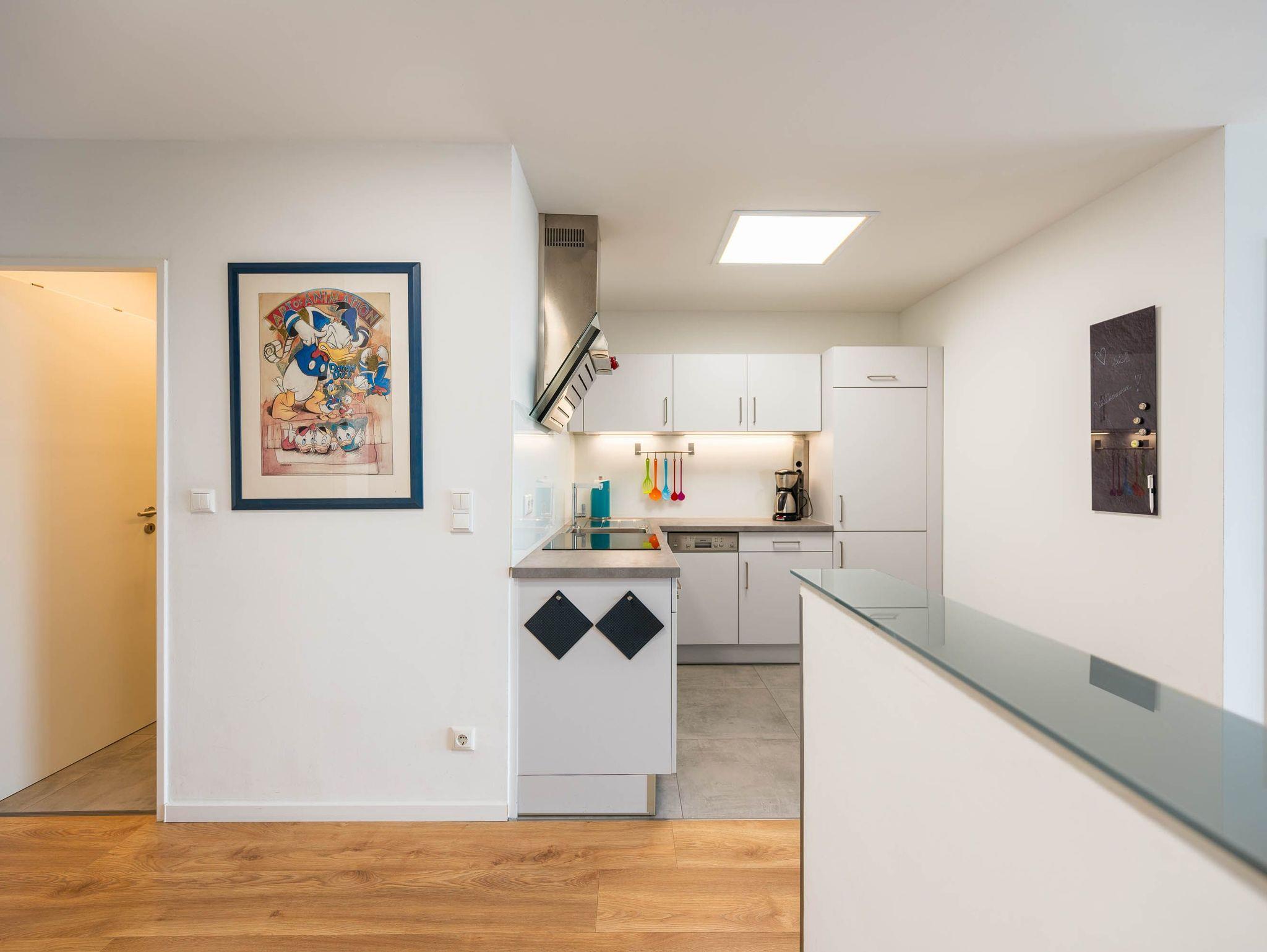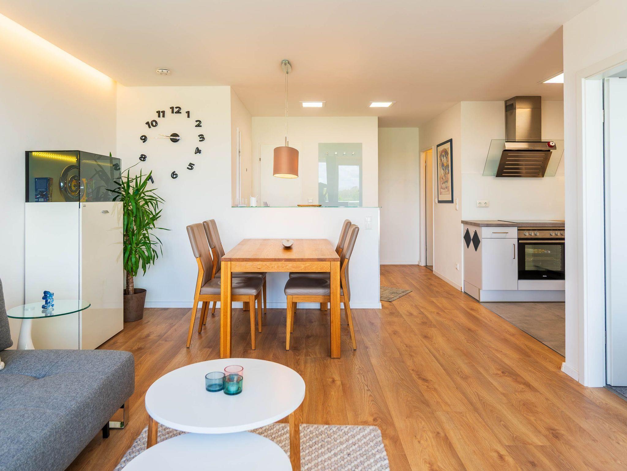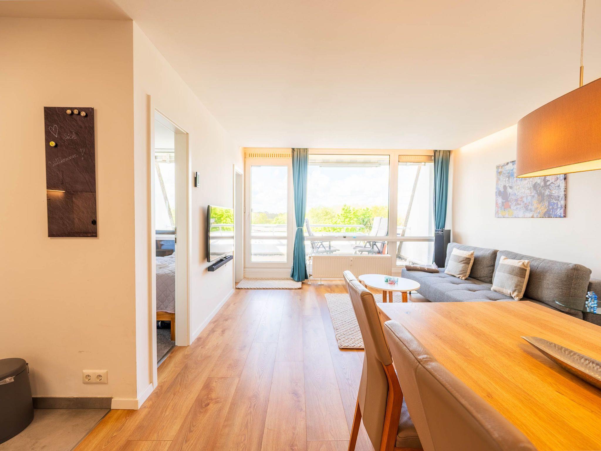 Diese komplett renovierte und modern eingerichtete Ferienwohnung ist durch die bodentiefe Fensterfront in südwestlicher Richtung komplett lichtdurchflutet und lädt mit dem hellen Laminat-Fußboden zum Wohlfühlen ein. Durch eine eingezogene halbhohe Wand wird der Eingangsbereich optisch geschickt vom Wohn- und Essbereich getrennt. Somit bekommt das Apartment einen loftartigen-Charakter. Im Flurbereich befinden sich eine Abstellkammer und ein Kleiderschrank.