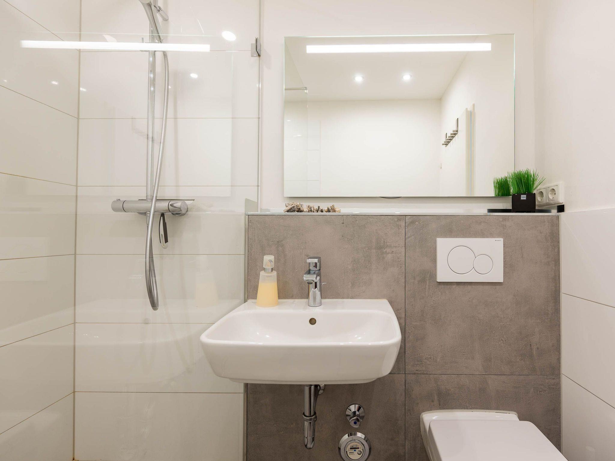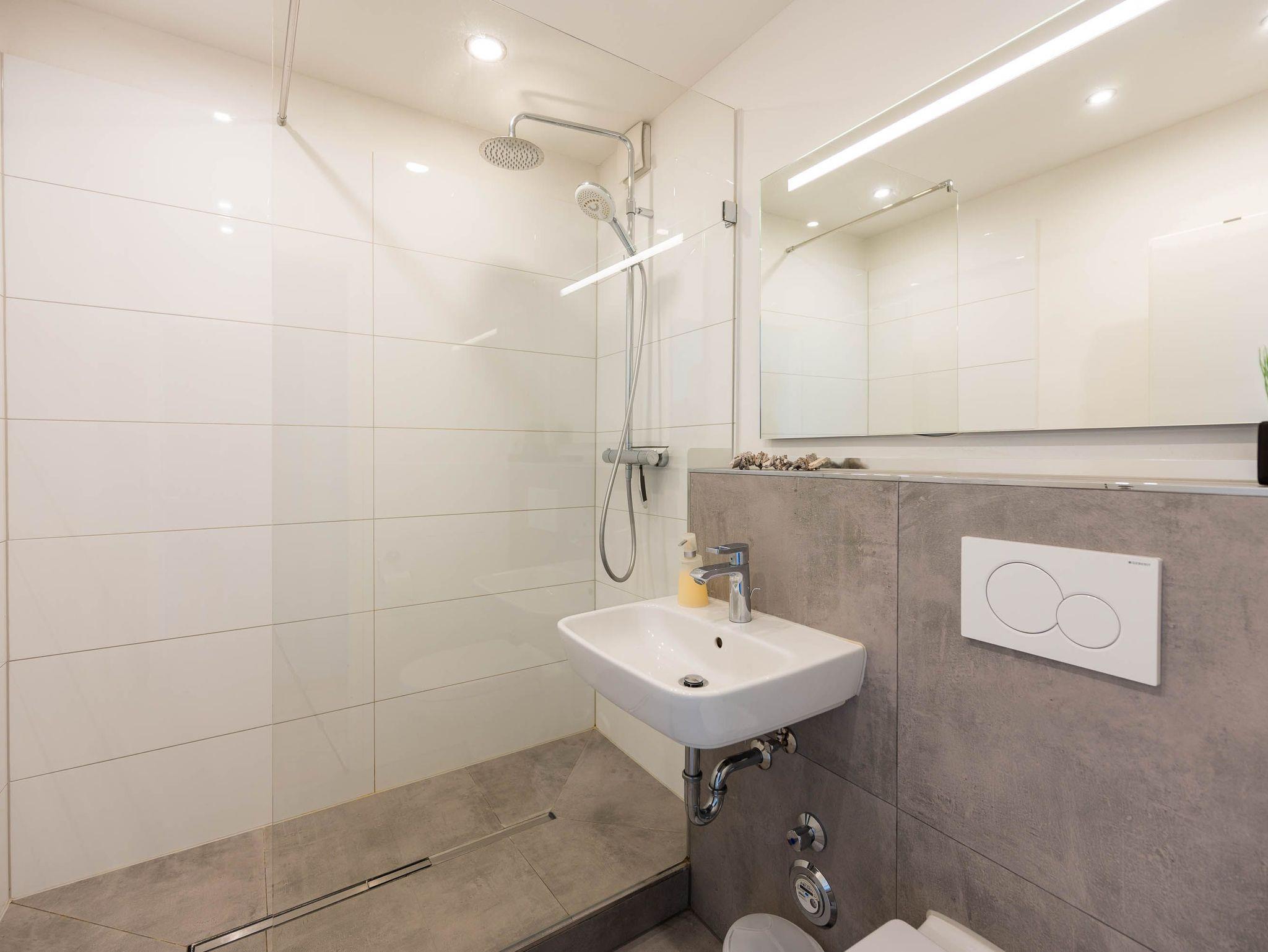 Das gepflegte Badezimmer besticht mit einer großen Dusche (Regenkopf- und Handbrause) und einem Handtuchheizkörper.