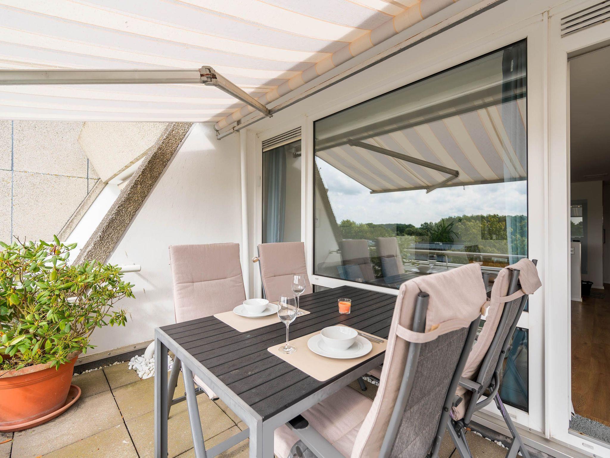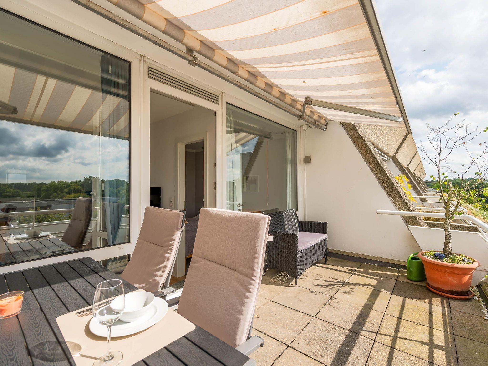 Der Balkon, welcher sich über die gesamte Breite des Apartments verläuft, ist mit Tisch und Stühlen sowie einer Markise ausgestattet. Durch die südwestliche Lage können Sie auch abends die Sonne in vollen Zügen genießen.