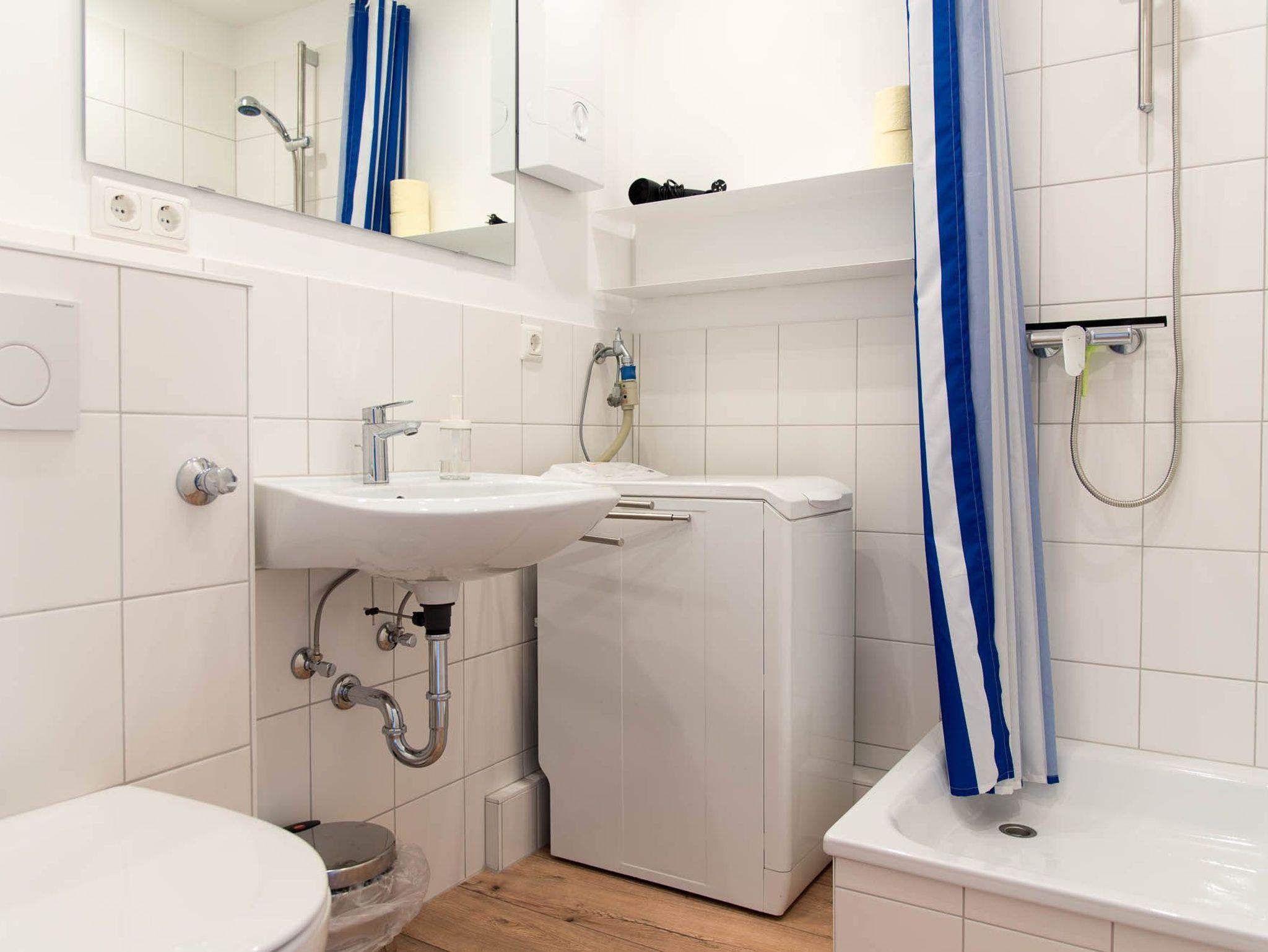 Das moderne Badezimmer ist vom Flur aus zu erreichen und ist auch mit Holzfußboden ausgelegt. Neben einer Dusche, einem WC, Waschbecken und einem großen Spiegel verfügt das Badezimmer zusätzlich über eine Waschmaschine.