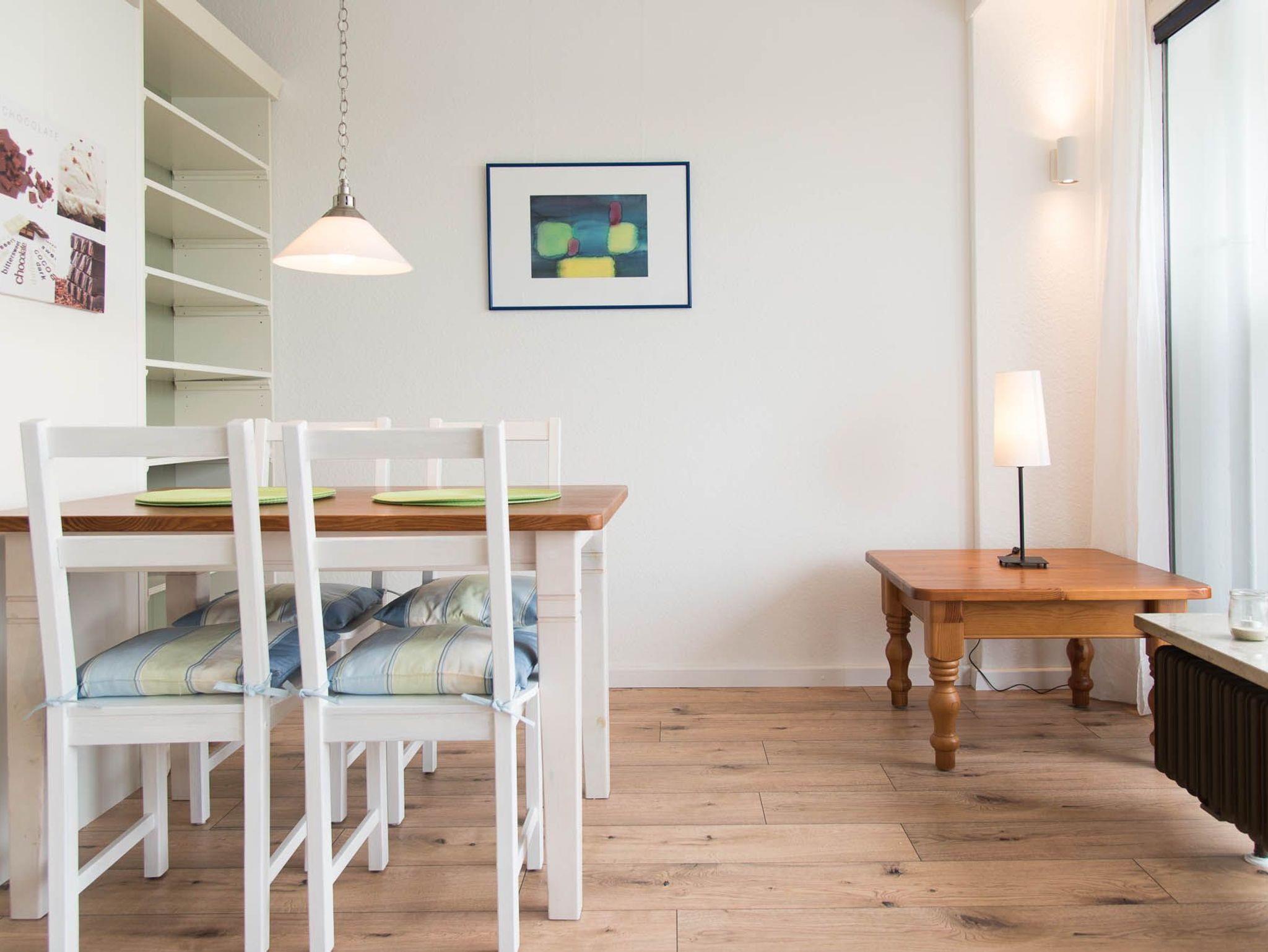 Gegenüber vom Wohnbereich befindet sich am Fenster der Essbereich mit einem großen Esstisch und Stühlen für bis zu 4 Personen.