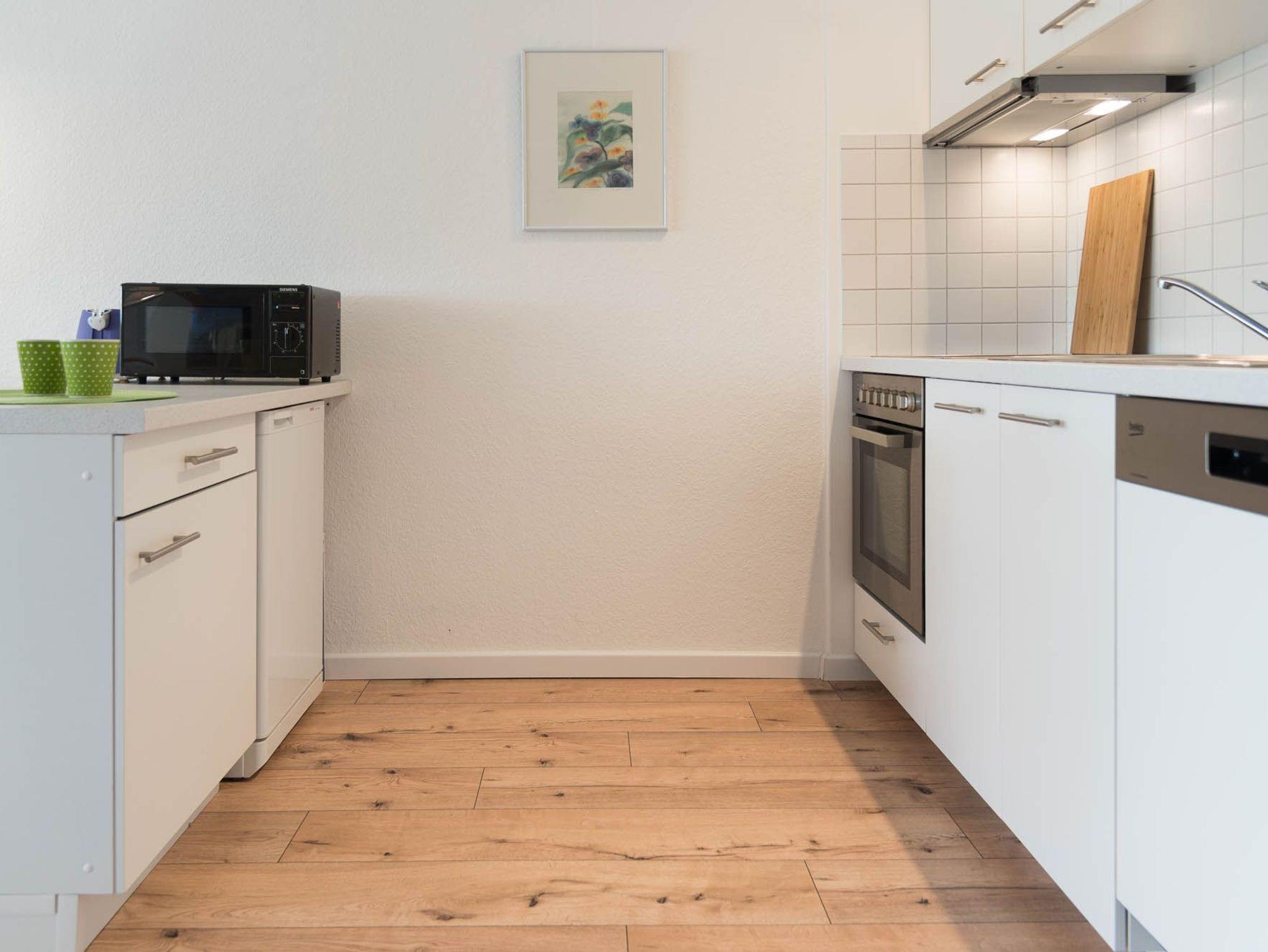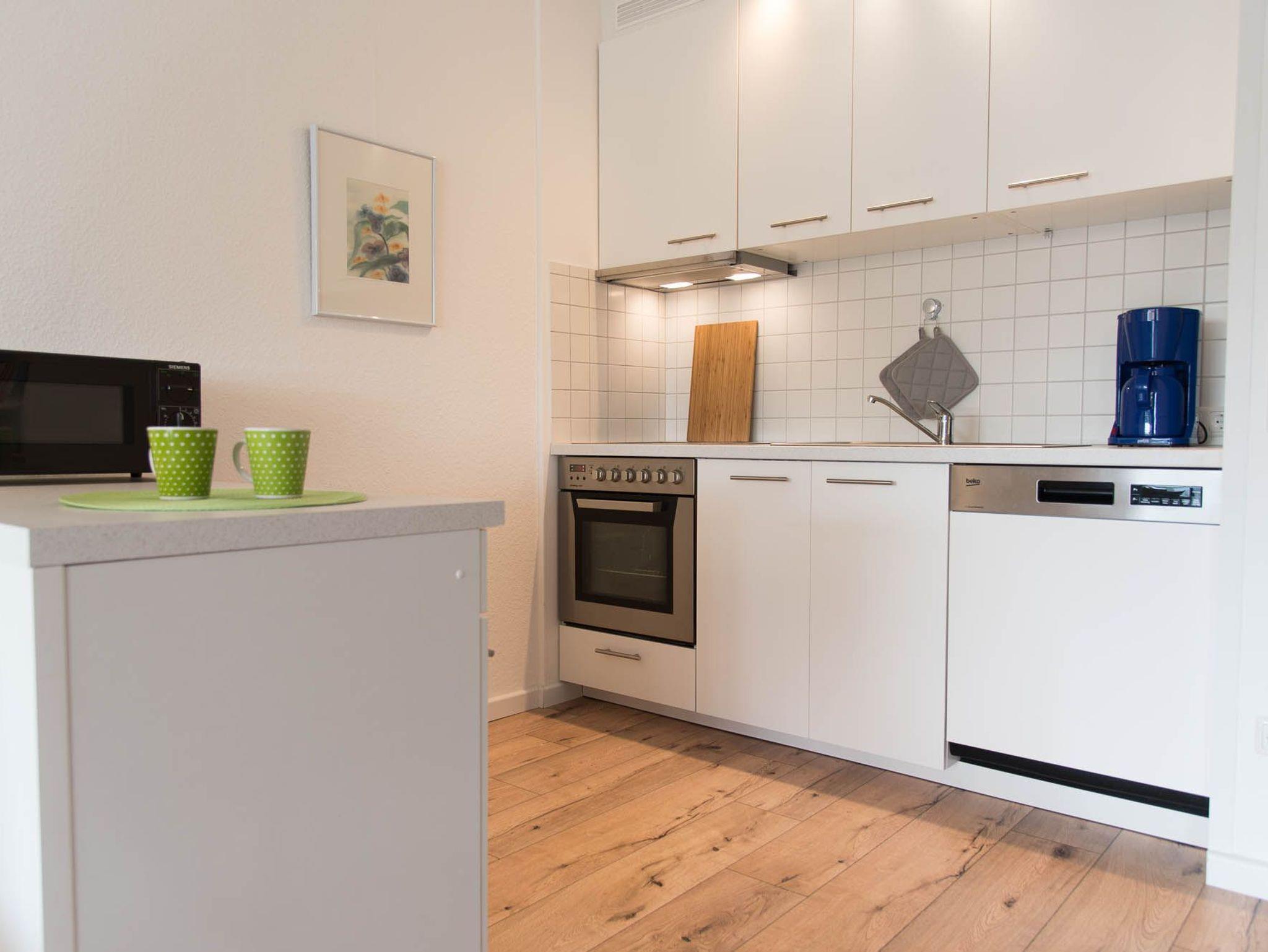 Die Ferienwohnung ist mit einer Wohnküchenzeile ausgestattet. Neben der Grundausstattung wie einem Backofen, Cerankochfeld, Wasserkocher, einer Kaffeemaschine und ausreichend Geschirr, ist auch eine Geschirrspülmaschine vorhanden. Mit dieser Ausstattung steht einer selbstgemachten Mahlzeit nichts mehr im Wege. Ein Küchenschrank als Tresen grenzt die Küche geschickt vom Wohnbereich ab.