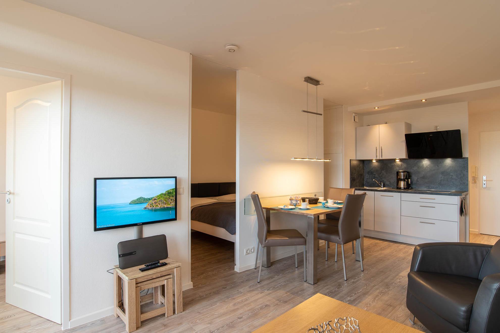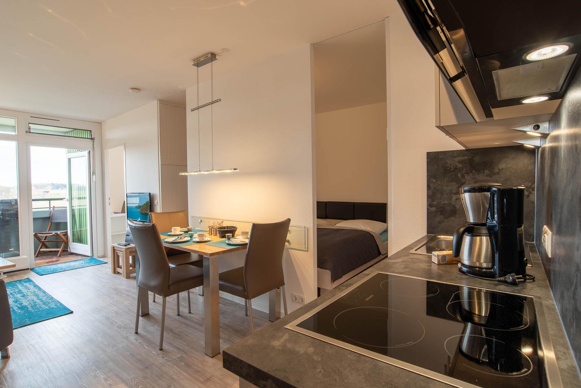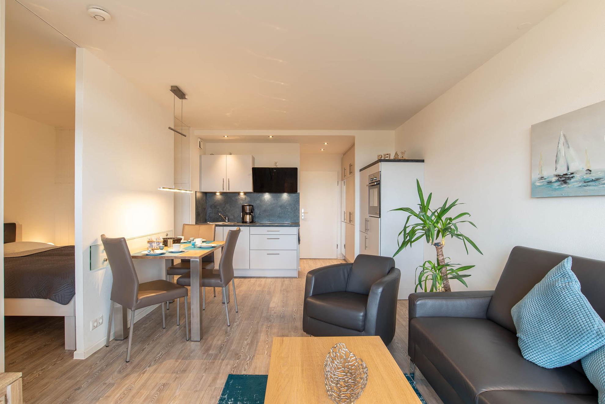 Diese 47qm große, 2-Zimmer Ferienwohnung mit seitlichem Meerblick bietet Platz für bis zu 3 Personen und befindet sich im 4. Stock des Olympia Hotel Schilksee. Die Wohnung wurde komplett renoviert und ist modern und geschmackvoll eingerichtet. Sie ist bequem mit dem Fahrstuhl erreichbar. Der offene Wohn- und Essbereich ist lichtdurchflutet und verfügt über eine komfortable Leder-Couch, einen Ledersessel, einen LCD-Fernseher und einen Esstisch für drei Personen. Durch Gardinen kann der Raum abgedunkelt werden. Die angrenzende Küche ist mit einem Induktionskochfeld, einem separaten Backofen auf Griffhöhe, einer Kühl- Gefrierkombination und einem Geschirrspüler ausgestattet. Auch eine Kaffeemaschine, ein Toaster und ein Wasserkocher sind vorhanden.
