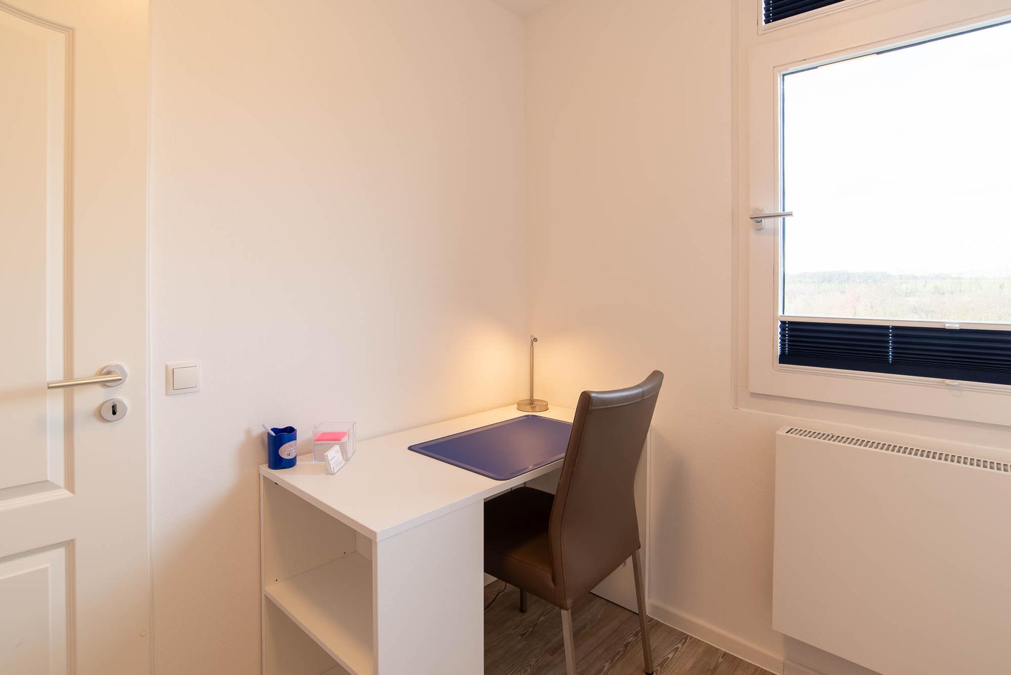 Der Schlafbereich mit einem gemütlichen Doppelbett (180x200) ist durch eine Wand vom Wohnraum abgetrennt. In einem separaten Zimmer gibt es einen Schreibtisch und ein Einzelbett (90x200) für eine dritte Person. Dieser Raum kann mit Plissees abgedunkelt werden. Das moderne Badezimmer verfügt über eine große Walk-in-Dusche, einen großen Spiegel und eine Handtuchheizung. Vom Balkon aus hat man einen wunderbaren seitlichen Meerblick über die Strander Bucht. Dort steht ein Tisch mit drei Stühlen zur Verfügung.