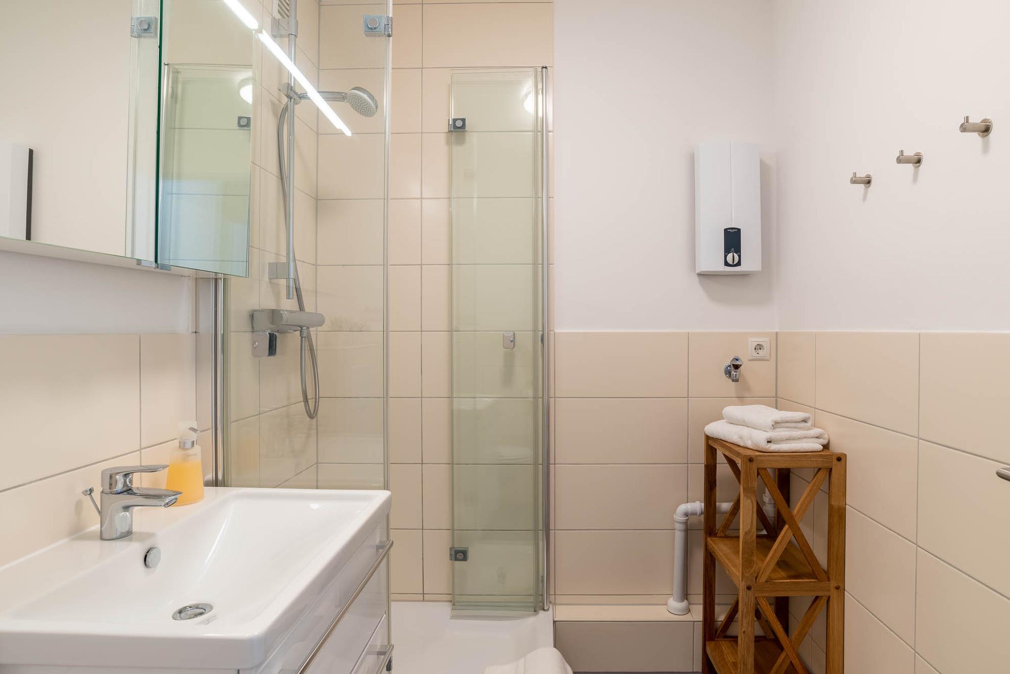Am Eingangsbereich befindet sich eine kleine Abstellkammer, eine Garderobe und ein großer Kleiderschrank sowie das moderne Badezimmer mit Dusche, WC und genügend Stauraum. Abseits des Badezimmers wurde in der gesamten Ferienunterkunft ein Holzboden verlegt, der dem Apartment eine gemütliche Atmosphäre verleiht.