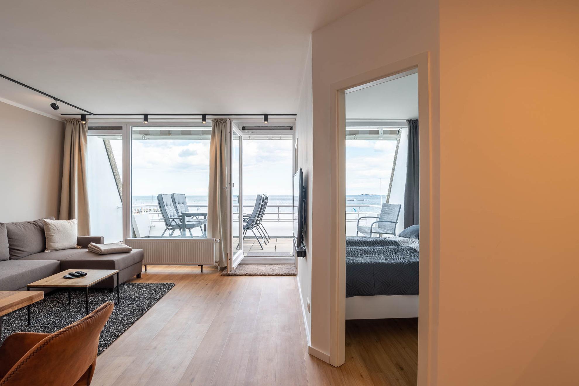 Die bodentiefe Fensterfront lässt das Apartment hell erleuchten. Nicht nur vom Balkon, sondern auch von jeder Sitzgelegenheit der Ferienwohnung hat man einen wunderbaren Blick auf den Hafen und die Ostsee.