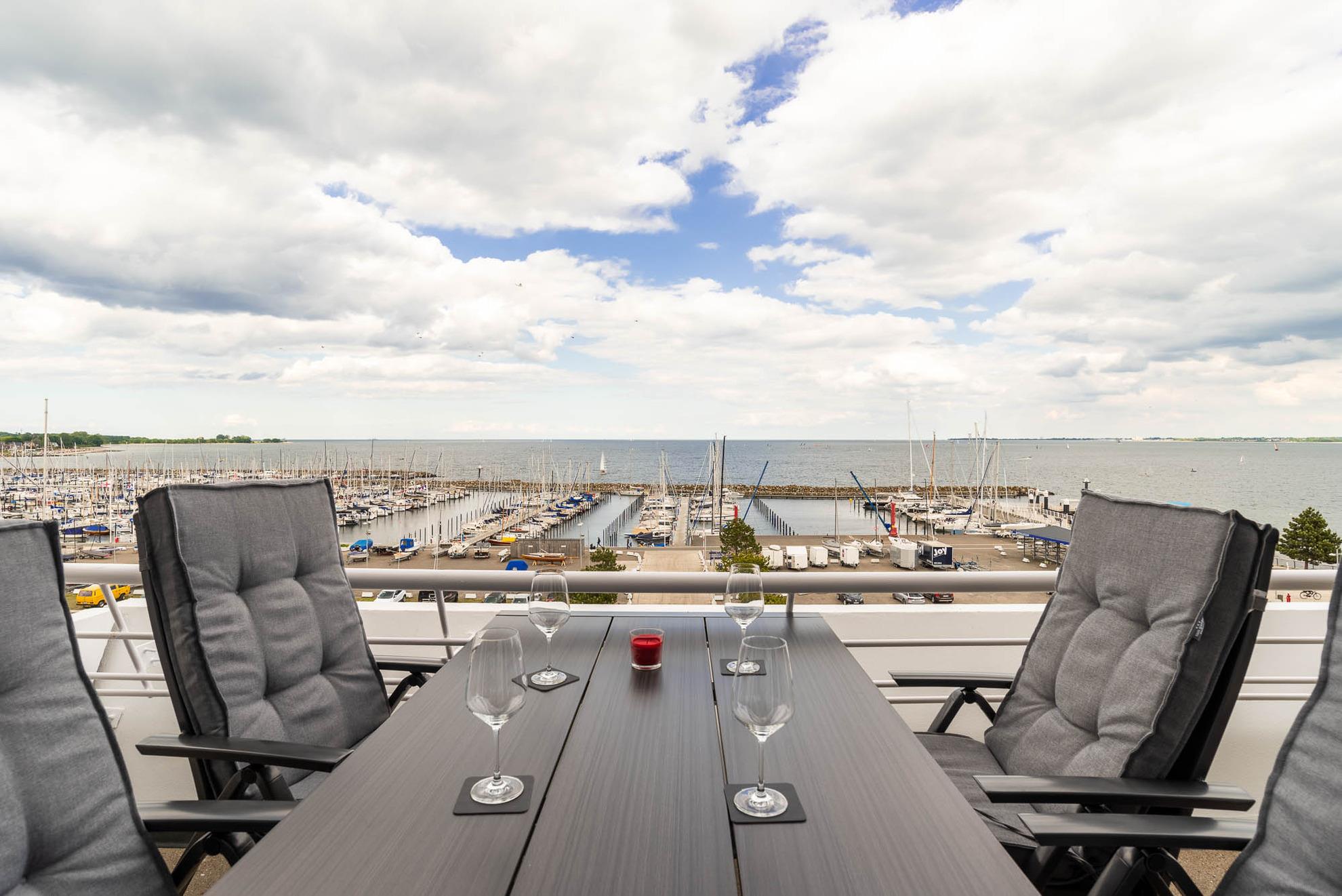 Der 12qm² große Balkon verfügt über einen robusten Gartentisch sowie vier Stühle und einer Gartenbank. Von hier lässt sich wunderbar der Hafen und das Treiben auf der Ostsee beobachten. Vor der Morgen- und Mittagssonne schützt eine ausfahrbare Markise.