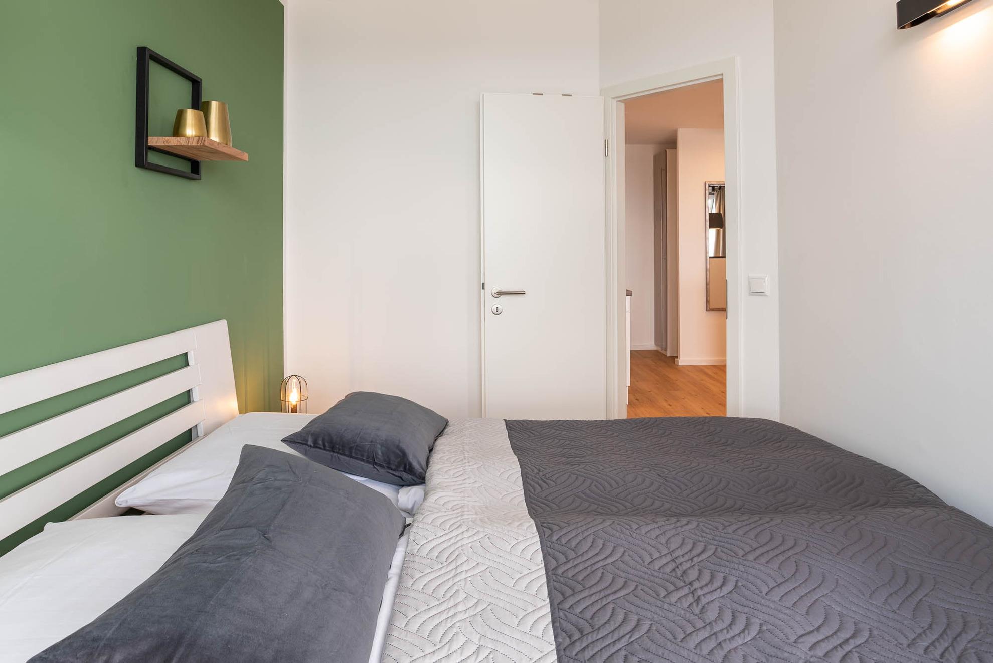 Ein großer Holztisch mit hochwertigen Stühlen stehen für gemütliche Abende an der halbhohen Wand Richtung Eingangsbereich für Sie zur Verfügung. Gegenüber befindet sich der offene Küchenbereich. Die Küche ist vollwertig mit einem Kühlschrank mit Gefrierfach, Ceran-Kochfeld, Backofen, Wasserkocher, Toaster, einer Geschirrspülmaschine und Kaffeemaschine ausgestattet. Daneben angrenzend befindet sich das Schlafzimmer. Dieses ist von zwei Türen aus zu begehen und besticht durch die bodentiefe Fensterfront mit Blick auf das Wasser. Das Doppelbett hat eine Maße von 180x200cm.